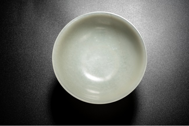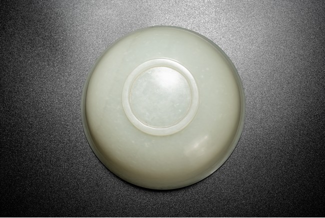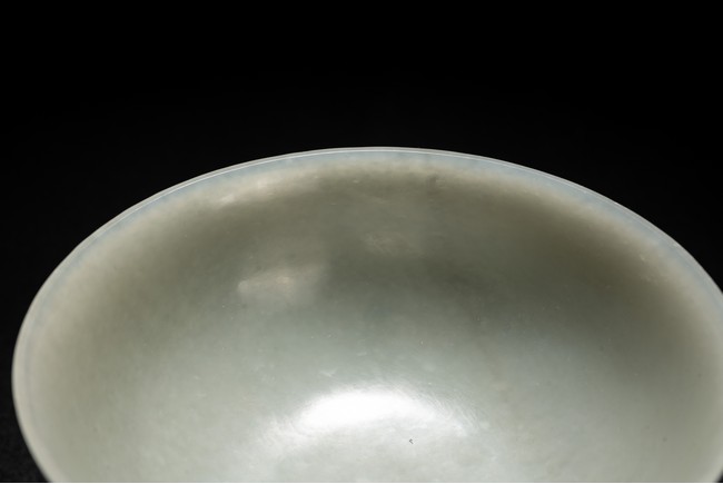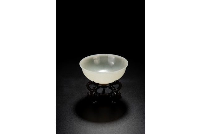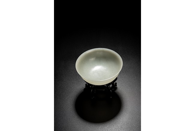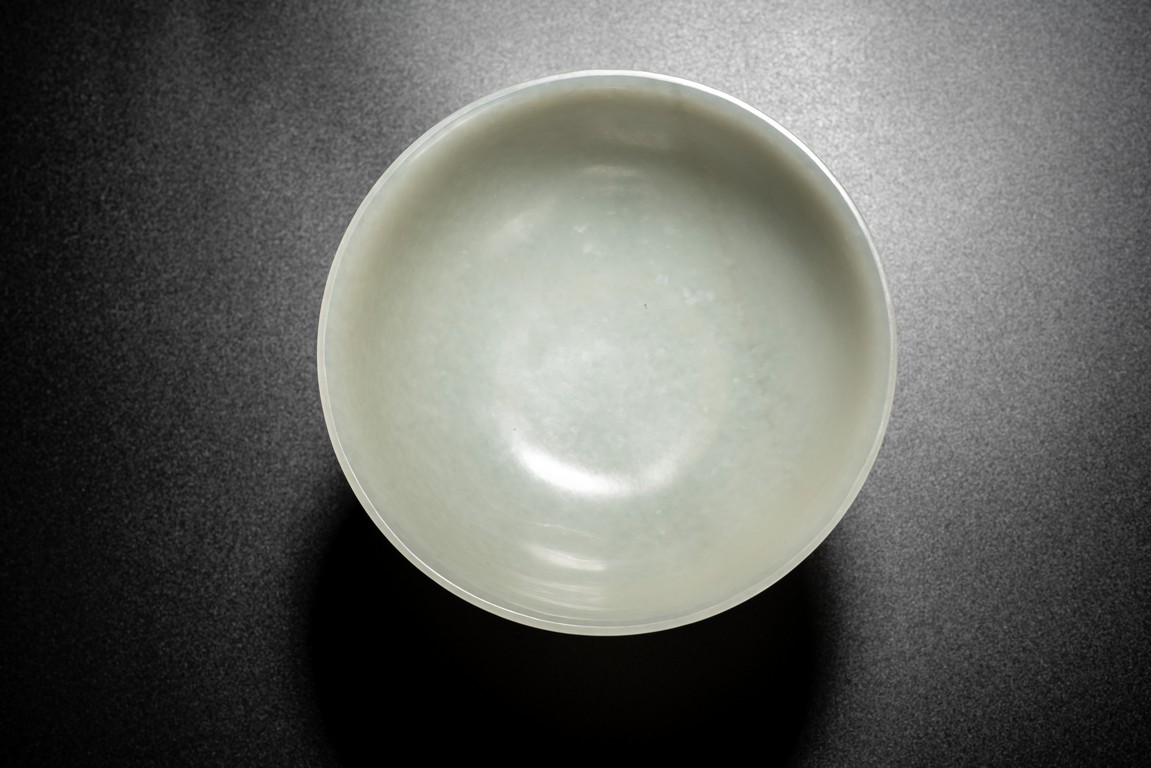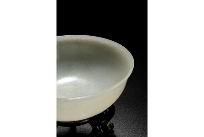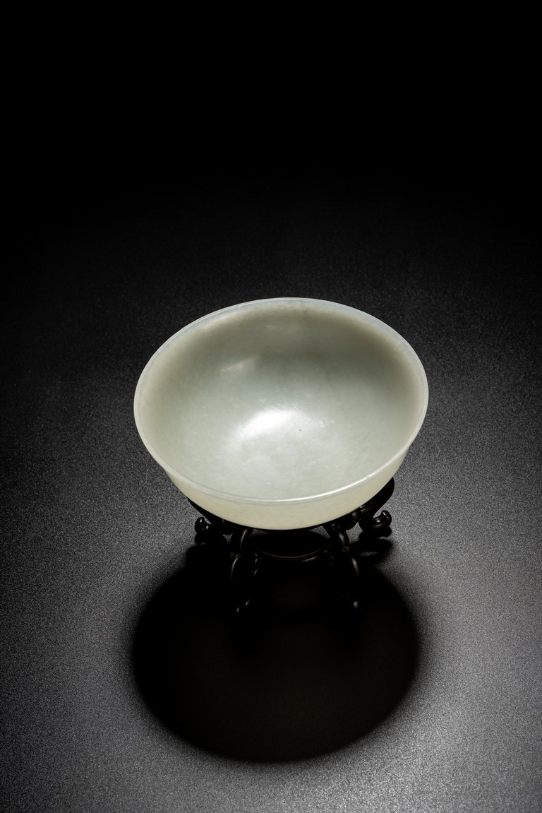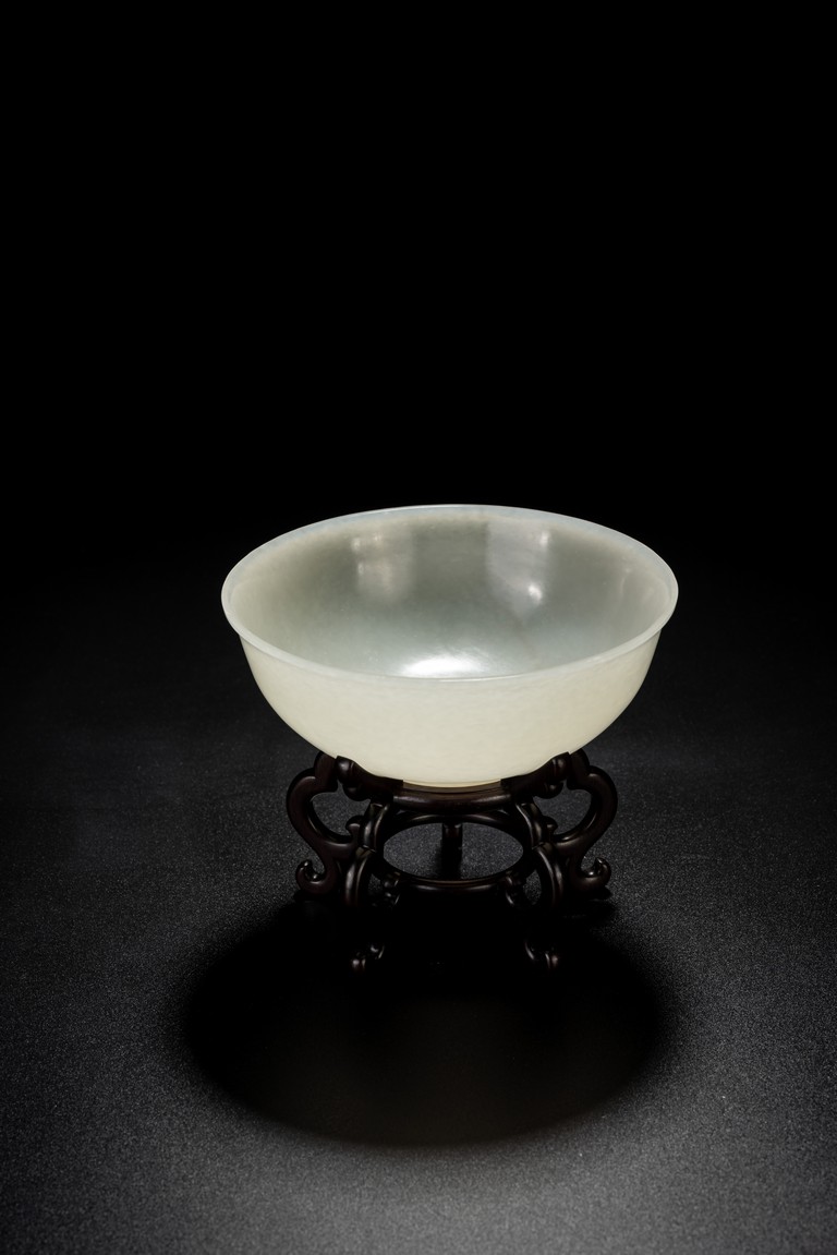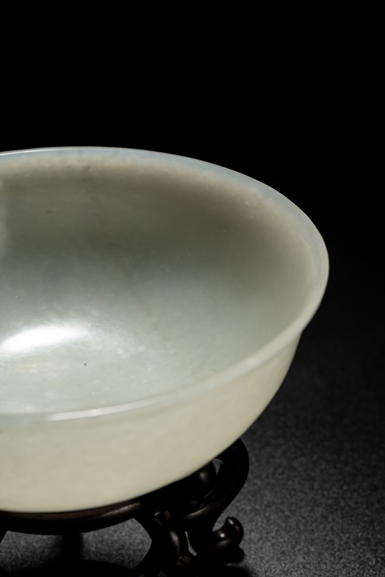 碗由白玉制成,玉質純凈,潤如荔中,瑩然欲滴。器形碩大,微侈口,口沿平整光滑,斜收腹,底承圓形淺圈足,線條勁挺。如此良材美質,通體光素無紋,不著一刀,琢磨圓潤,柔美規矩,質樸謙恭而又帶有盈盈寶氣。良材不雕是存“玉之五德”,以示玉石自然之美及素簡本質,下呈原配紫檀底座,做工精細,包漿溫潤,比例之完美,嘆為觀止。