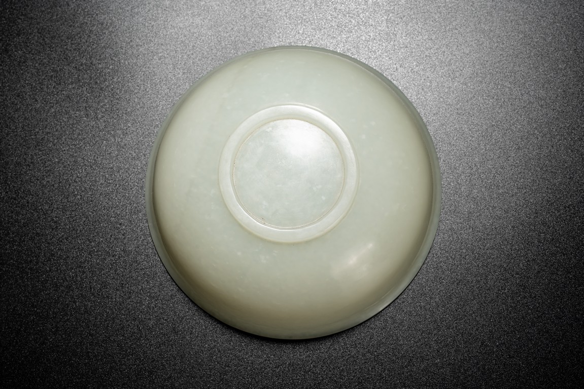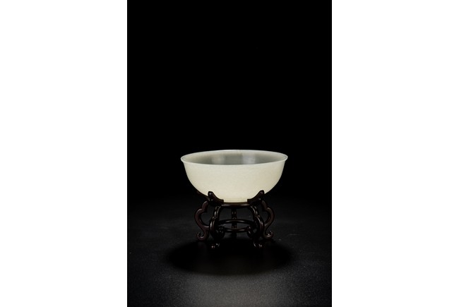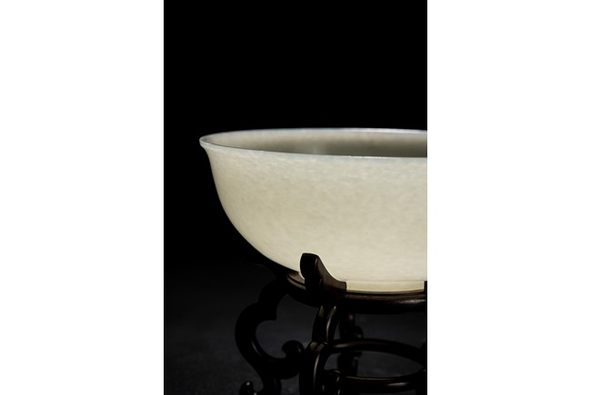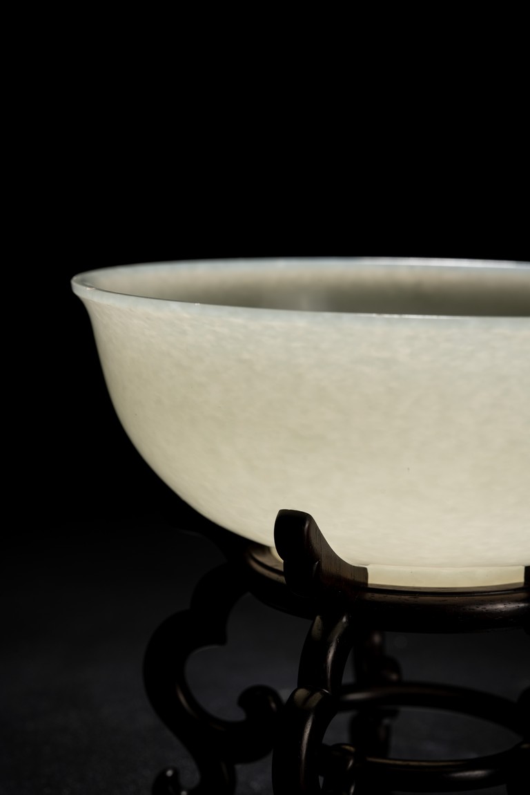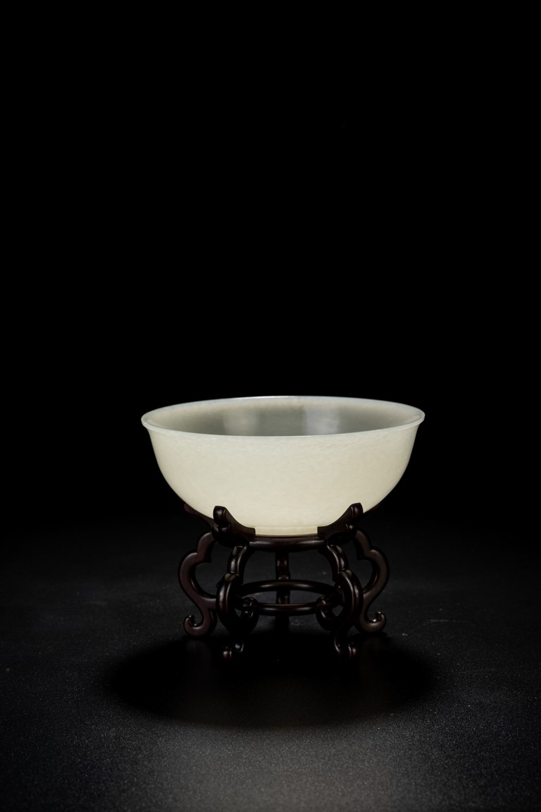 Qing Dynasty period. Worked with deep rounded sides rising to a gently everted rim, supported on a neatly cut footring, the lustrous stone of an even white color, supported on hardwood stand.