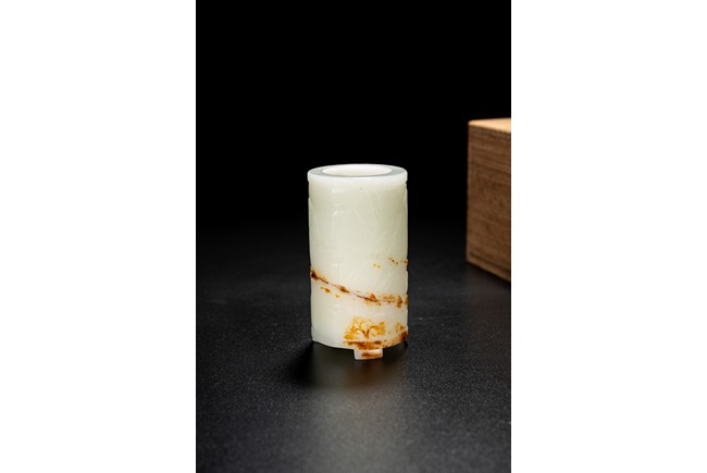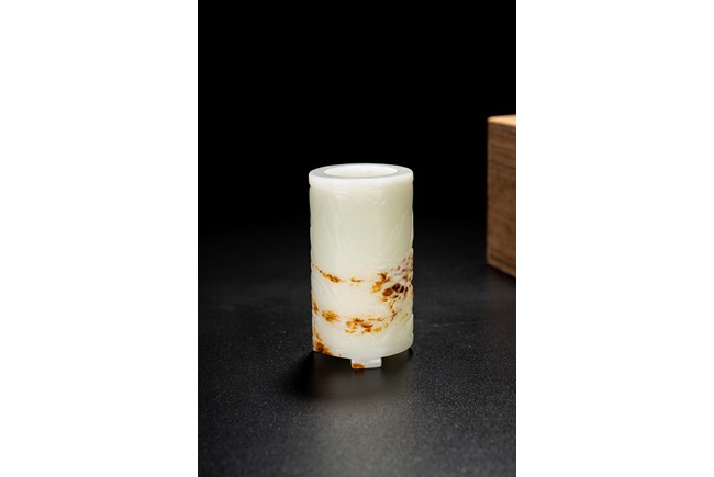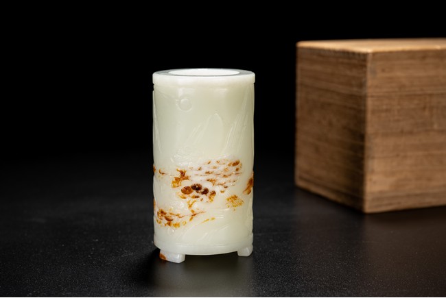 Of cylindrical form, the brushpot carved by utilizing the russet 'skin' to depict the pine trees amidst the landscape, all supported on three feet.