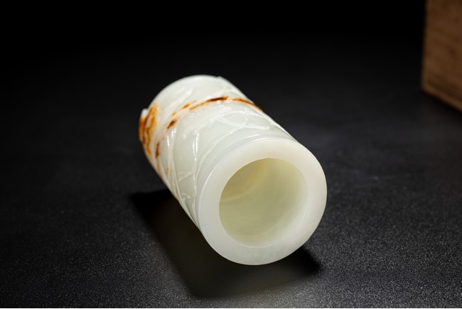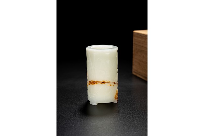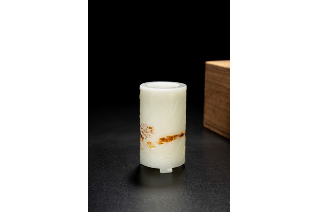 直口,高足,玉身帶糖色,通體玉雕采用浮雕手法,圖案為中國傳統的博義山水,山林間高士行旅,意境高遠,陳設佳器。