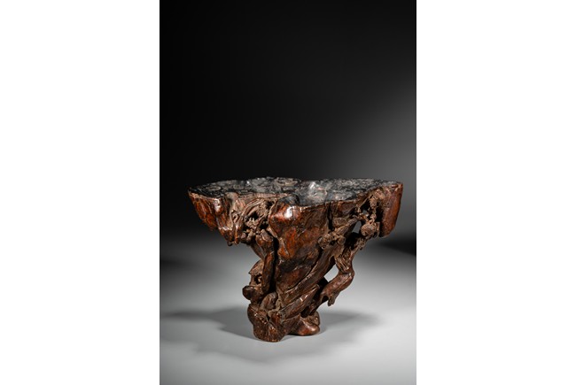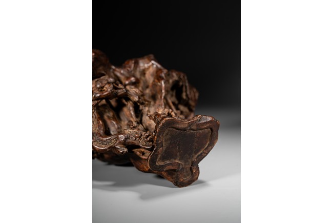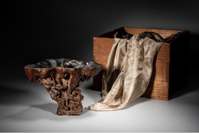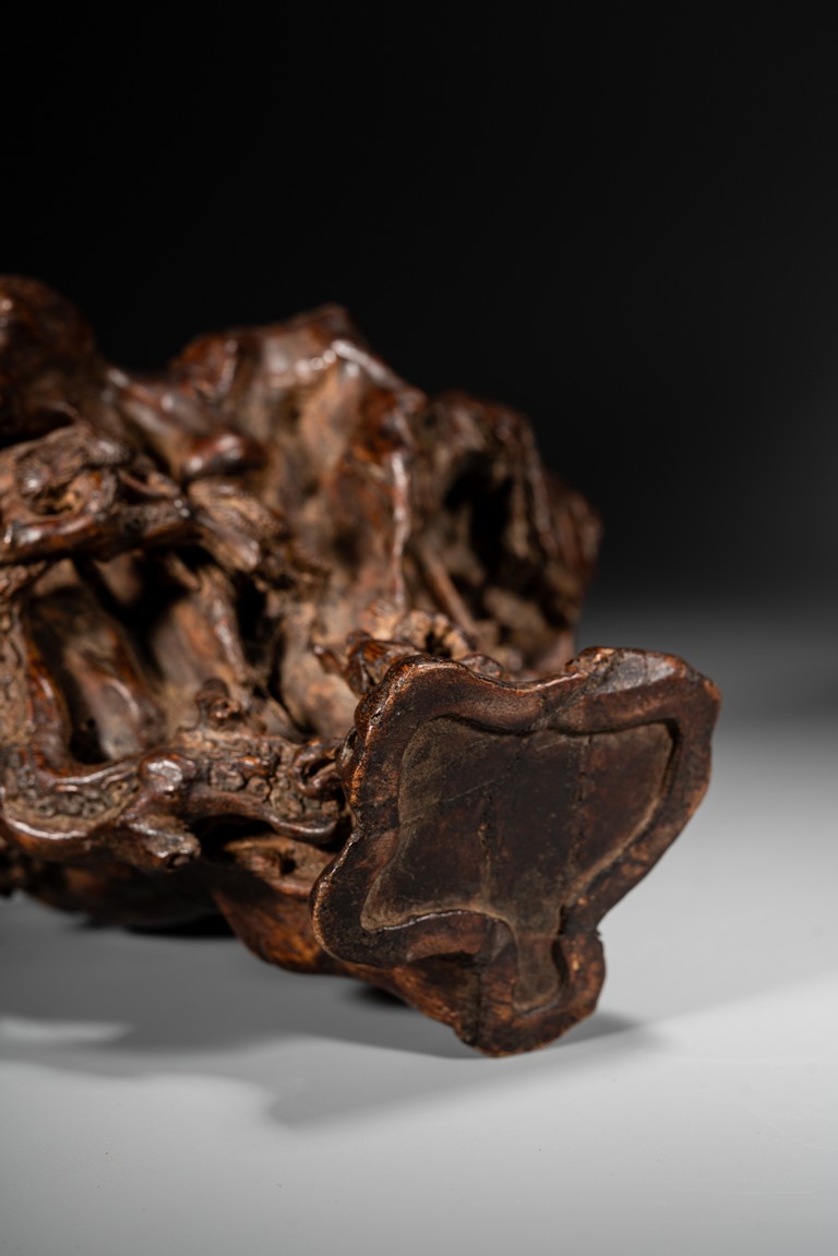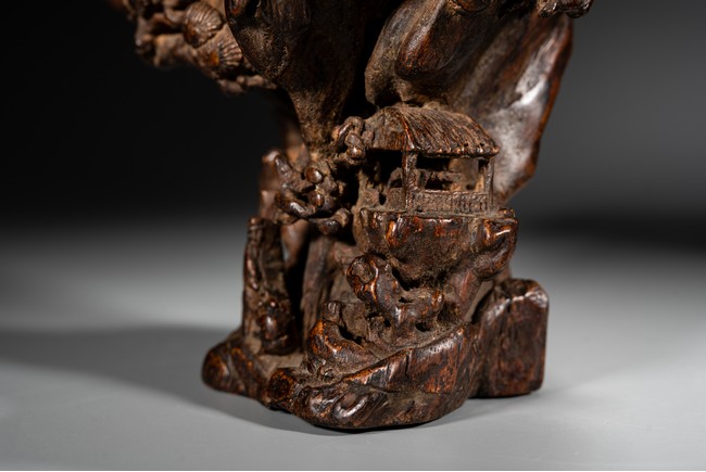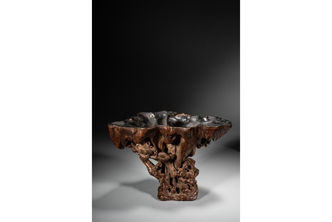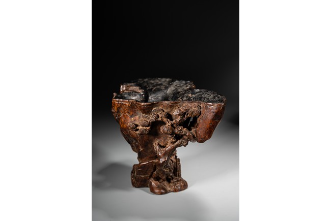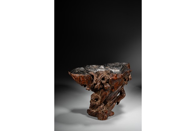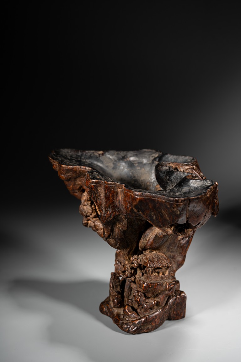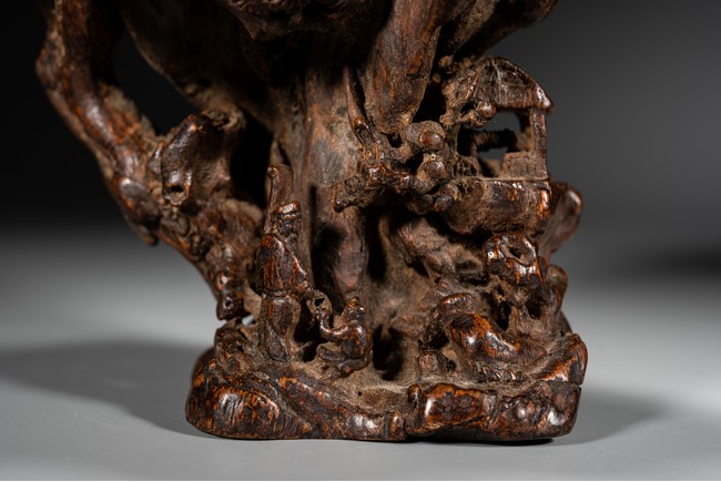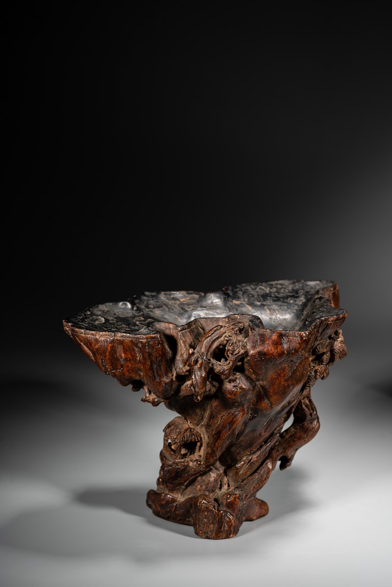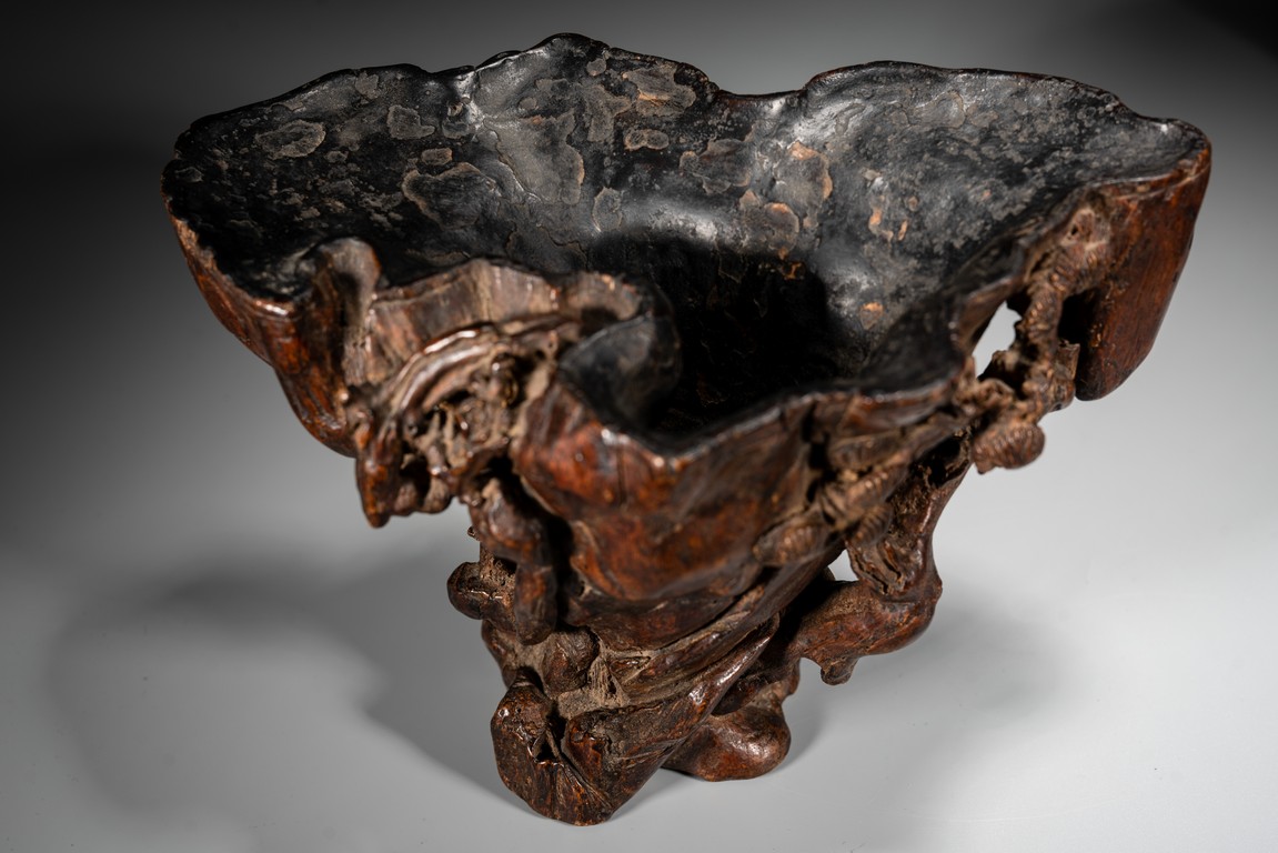 Qing Dynasty period. The cup is of irregular form, the uneven surface carved in high relief with prunus trees, pavilions, and figures in a landscape setting, interior lacquered black. The wood is of mottled dark-brown tones, with characteristic aroma.