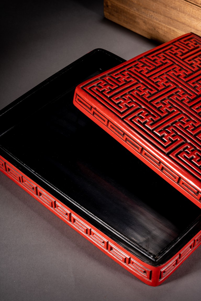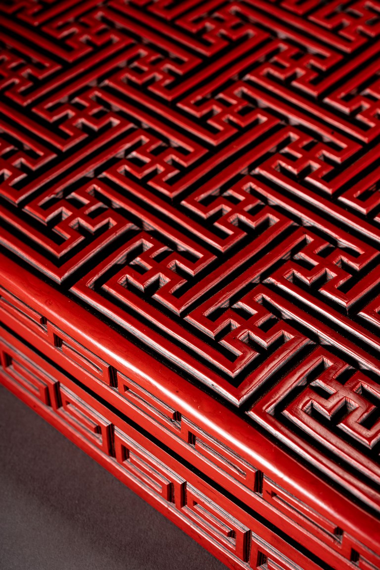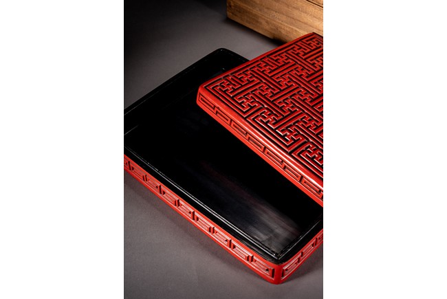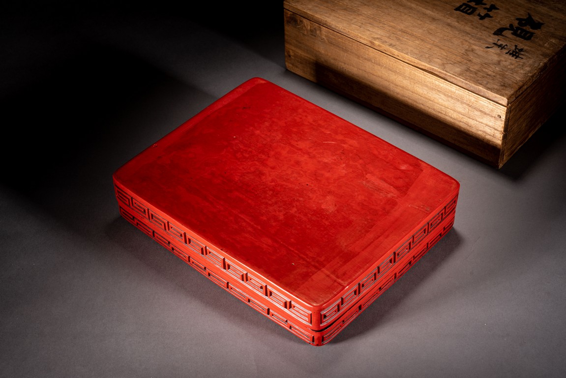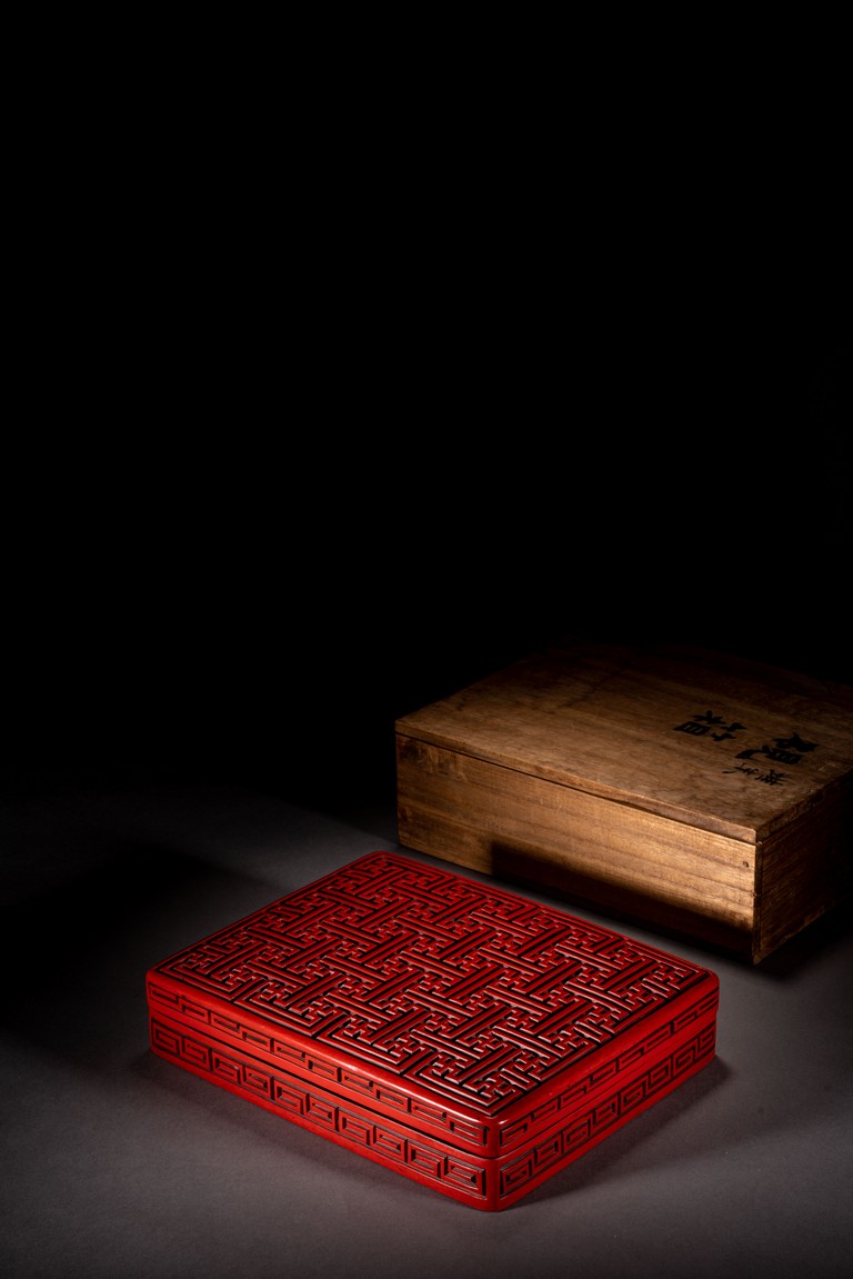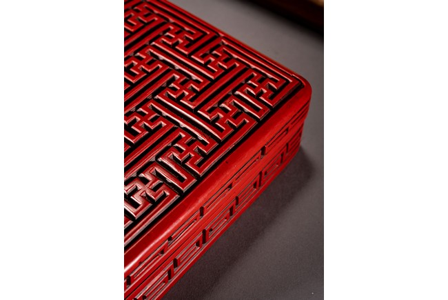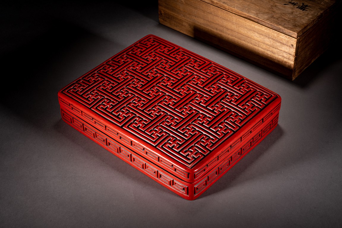 此件藏品為木胎剔紅工藝,上下蓋盒子母口,長方形,文房用器,五面均鬃朱漆,周身出萬壽紋飾,規整大氣,包漿溫潤,蓋盒內及底部鬃黑漆,光素無華,端莊典雅,文房賞玩、陳設、使用均屬佳品。