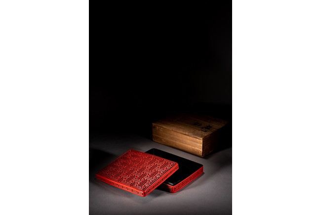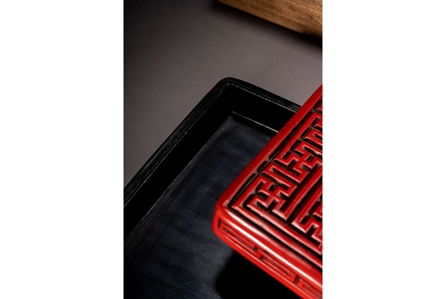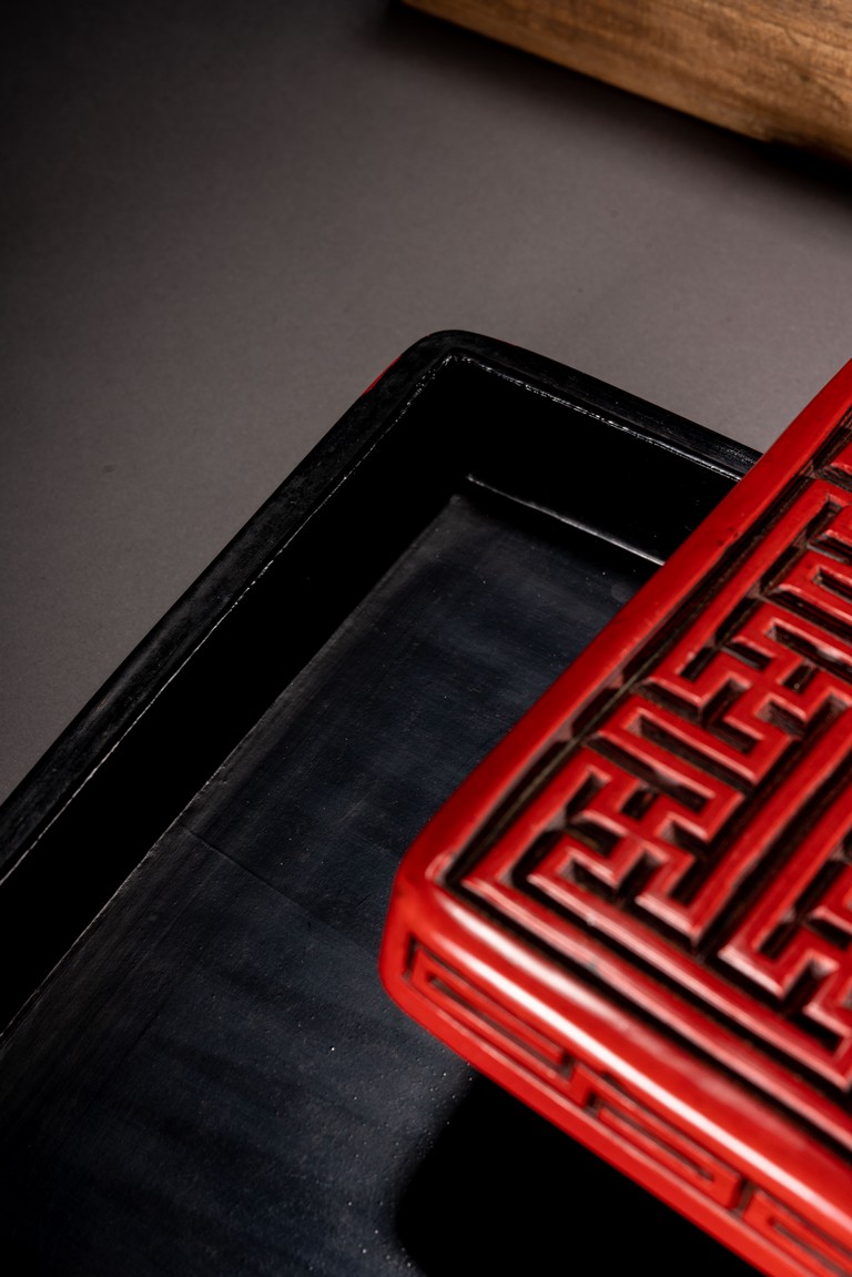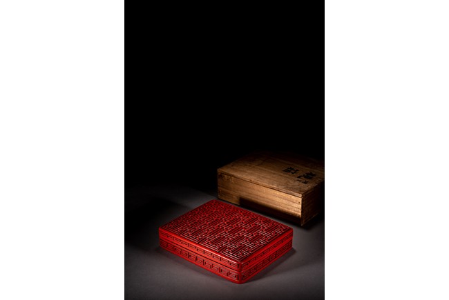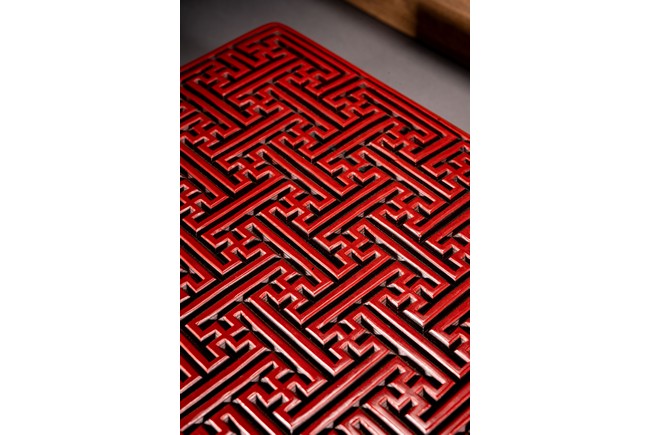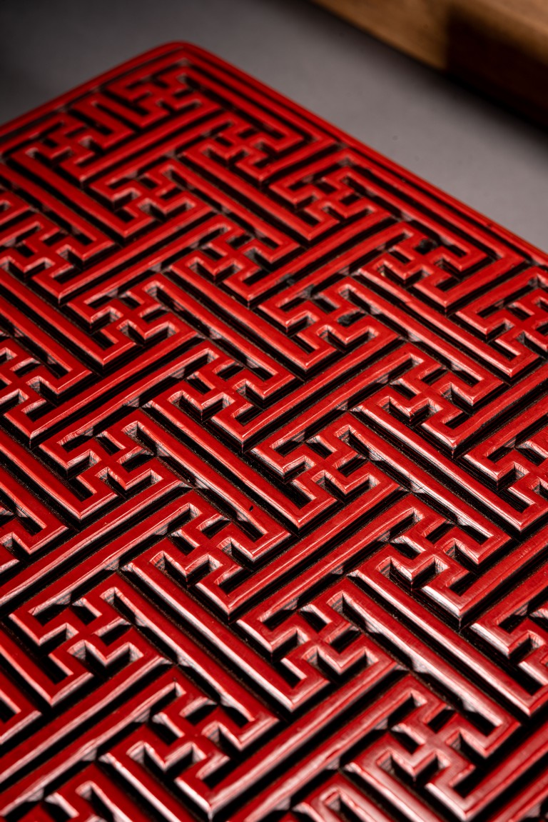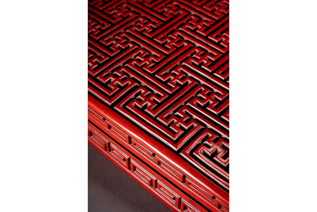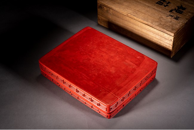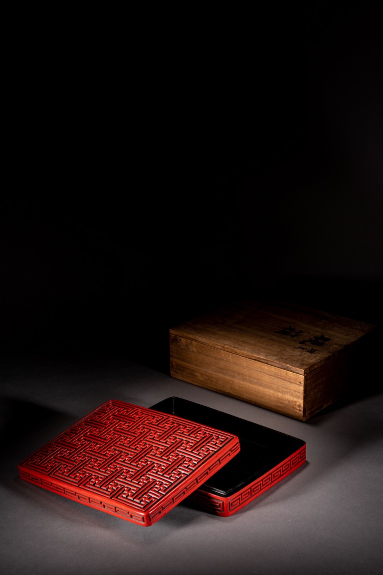 此件藏品為木胎剔紅工藝,上下蓋盒子母口,長方形,文房用器,五面均鬃朱漆,周身出萬壽紋飾,規整大氣,包漿溫潤,蓋盒內及底部鬃黑漆,光素無華,端莊典雅,文房賞玩、陳設、使用均屬佳品。