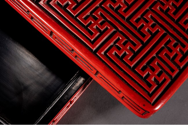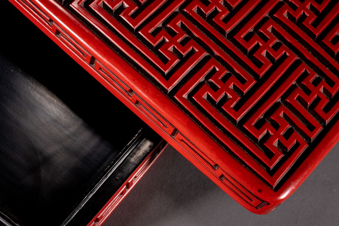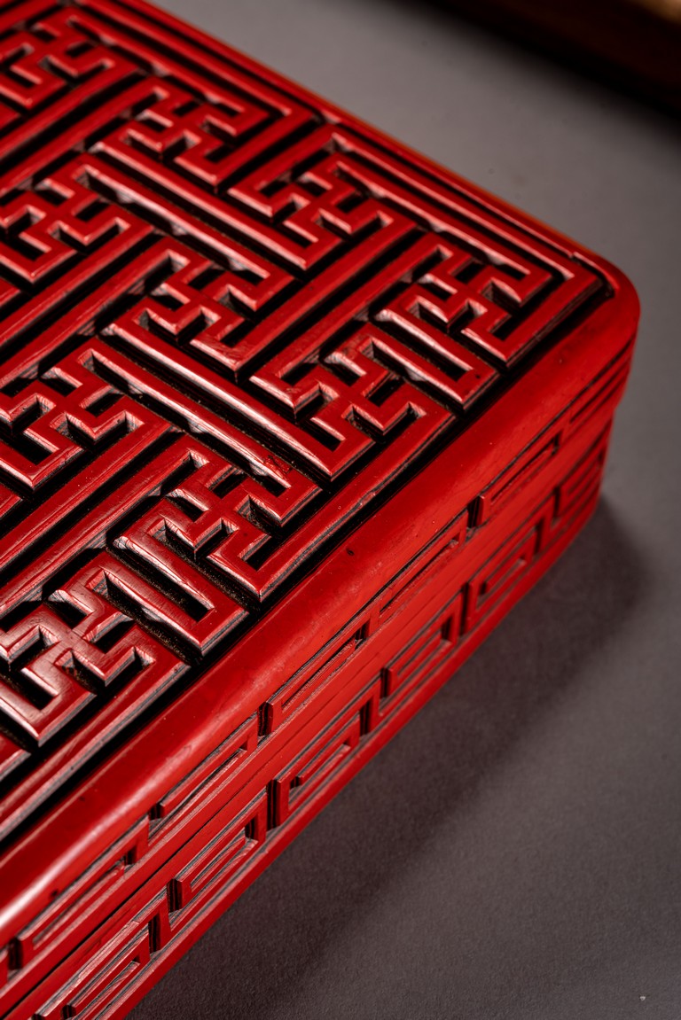 Qing Dynasty period. Of rectangular form, the box and cover carved with 'wan' key-fret motifs all over, the interior lacquered black.