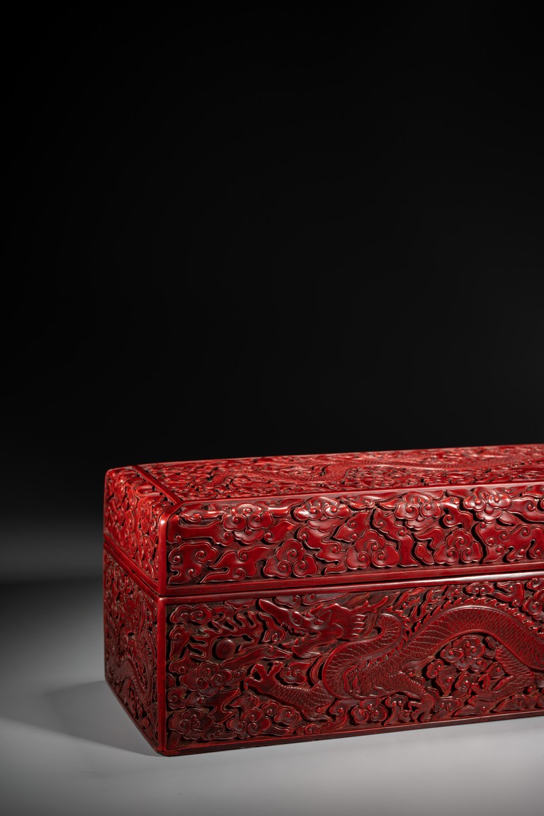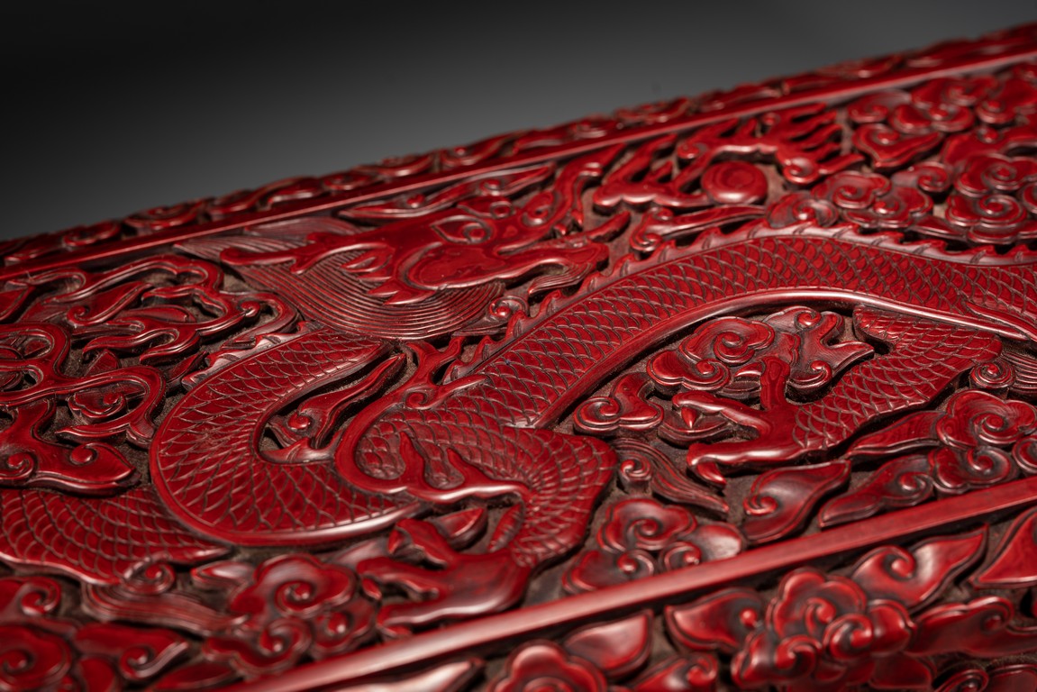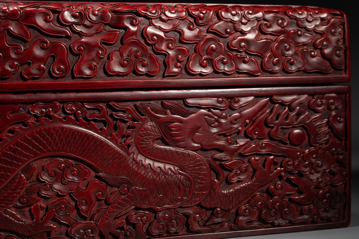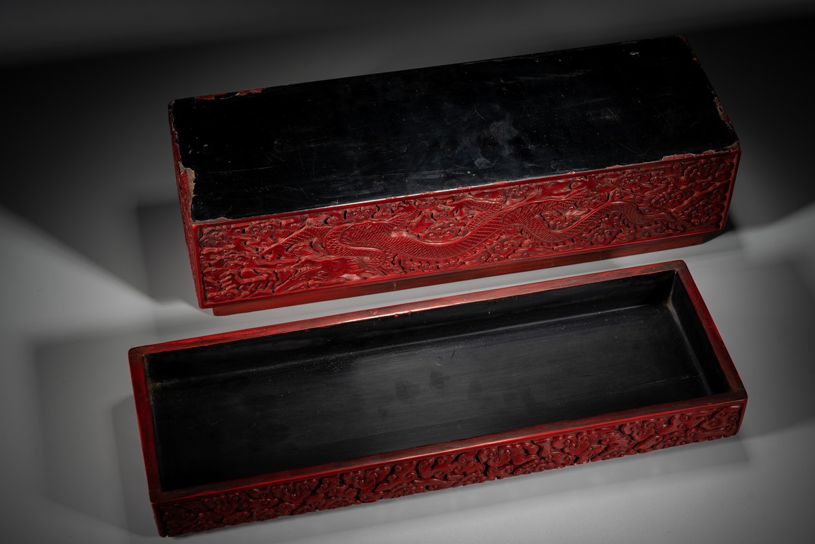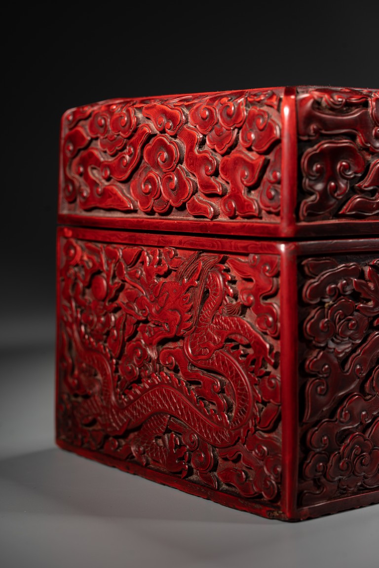 Qing Dynasty period. Of rectangular form, the box and cover finely carved with dragon chasing flaming pearl amidst clouds, the interior lacquered black.