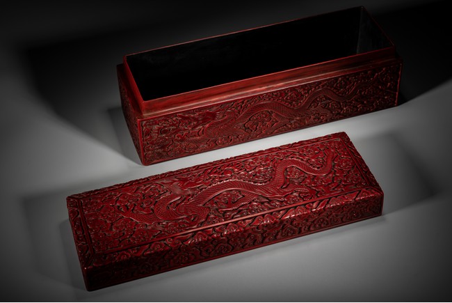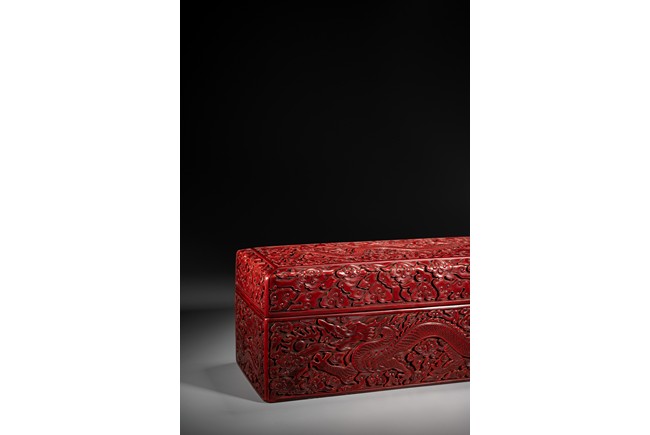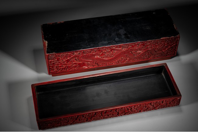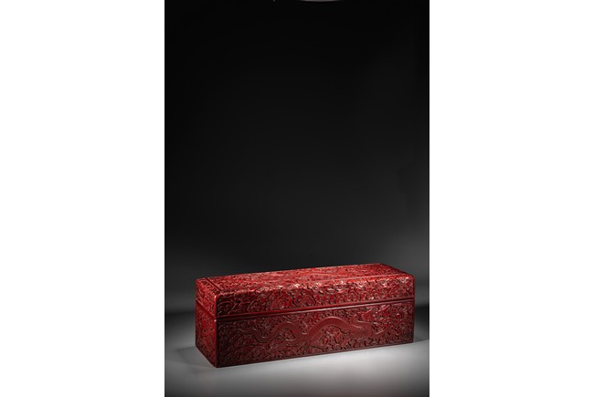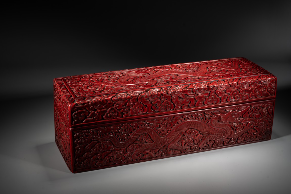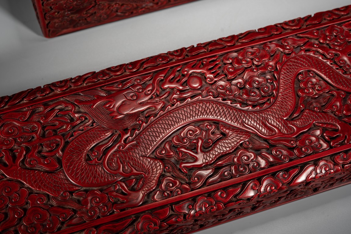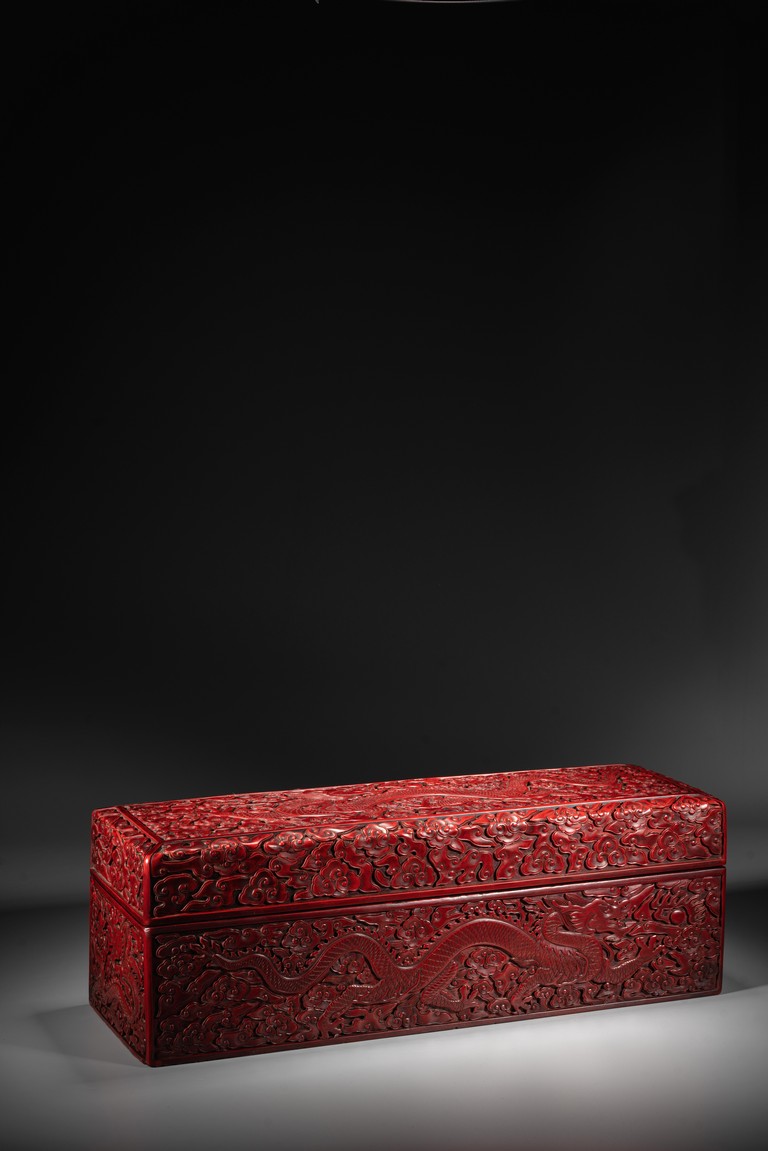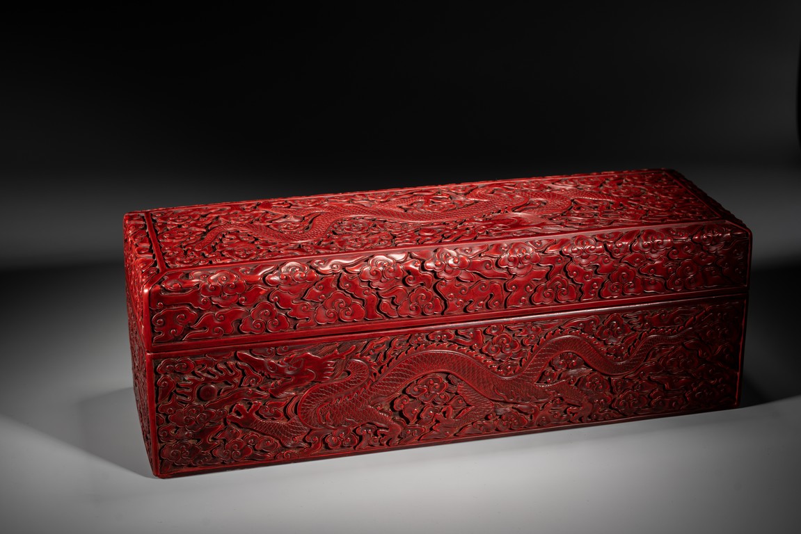 Qing Dynasty period. Of rectangular form, the box and cover finely carved with dragon chasing flaming pearl amidst clouds, the interior lacquered black.
