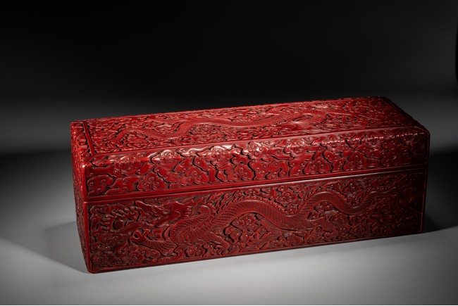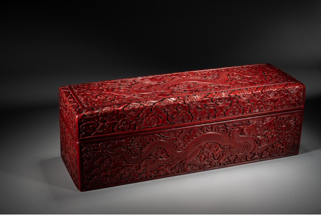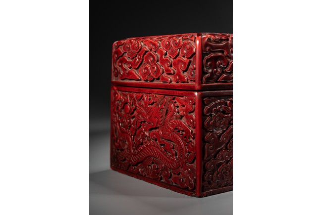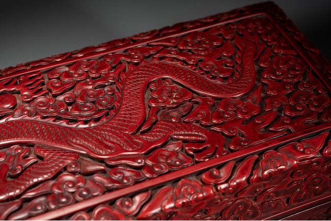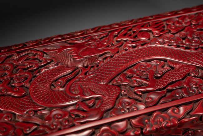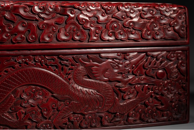 此器通體髹以朱漆,造型規整,蓋面及外壁以滿工的刀法雕刻出雲龍紋。雲氣洶湧,襯托騰龍的靈動以及雄健的姿態。騰龍的雙眼炯炯有神,龍身淩空飛騰,跨步回身探爪,发須飛揚,氣勢磅礡。