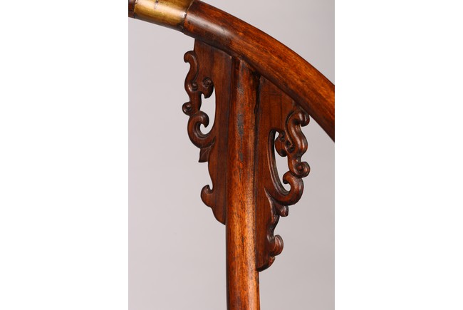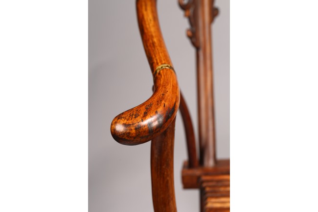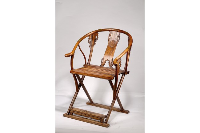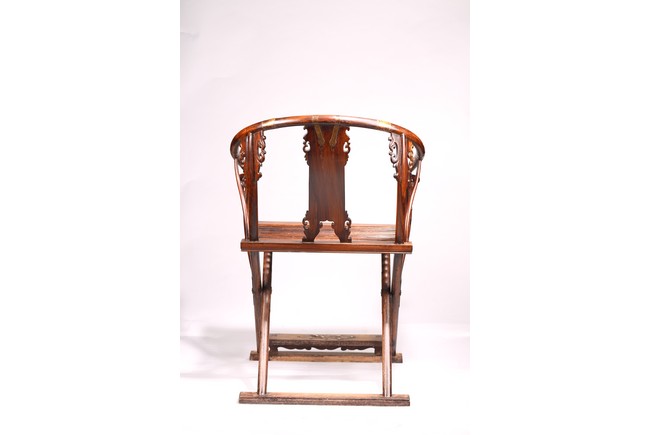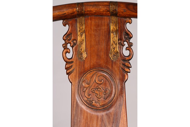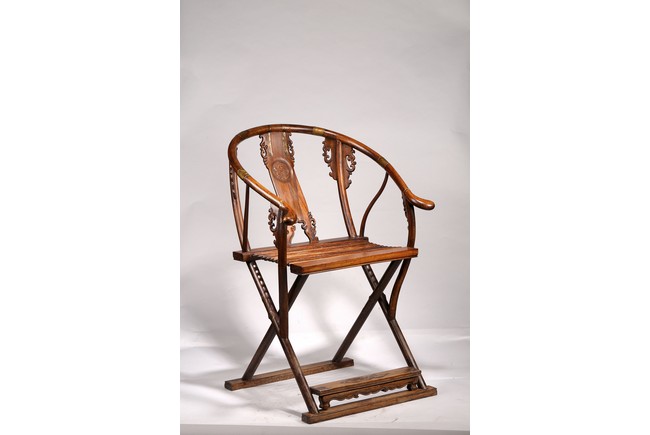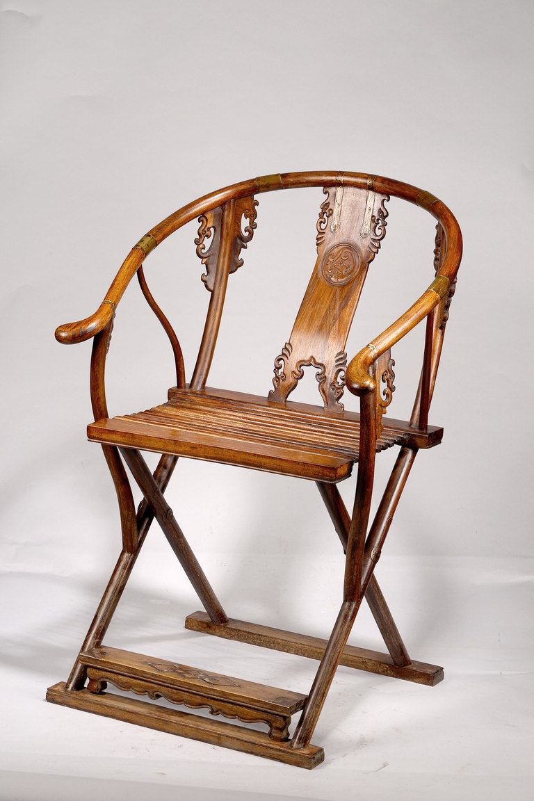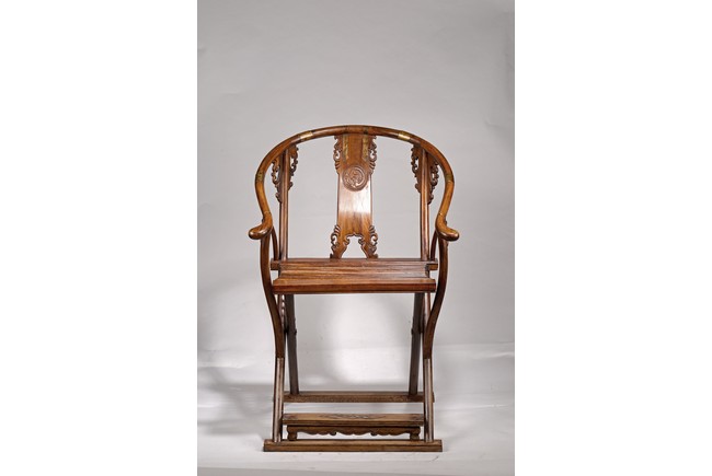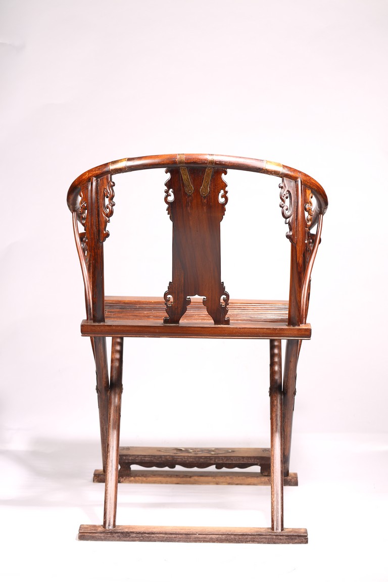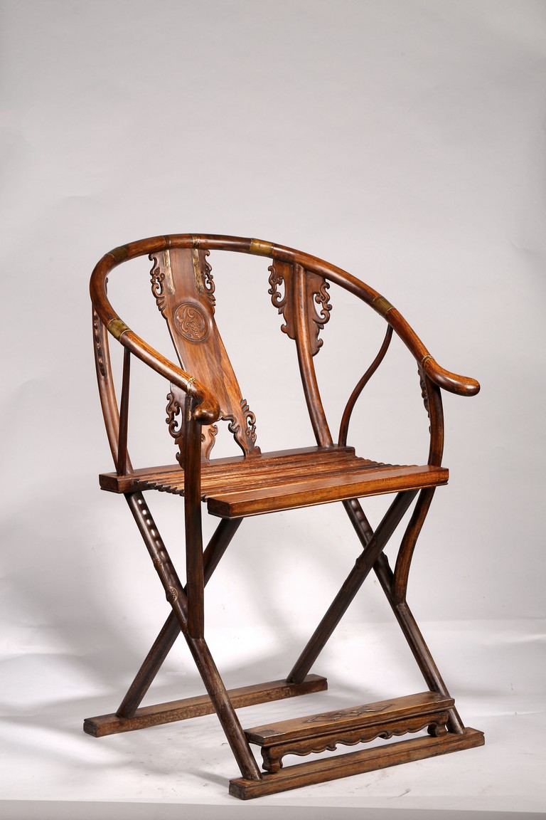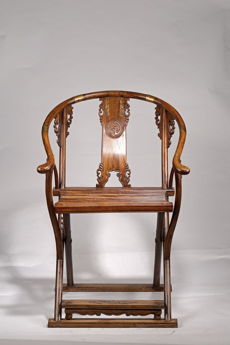 家具收藏中,交椅無疑是收藏家的終極夢想,交椅是可以折疊的坐具。宋金時期,人們從席地而坐轉變為垂足而坐,高座具已經十分普及。從西方傳至中國的交杌,亦演化成帶後背的交椅。交椅是中國傳統文化的產物,是藝術與實用緊密結合的典範。圓後背交椅被推崇為中國古典家具最優秀經典之椅型。此類椅具常見於明清時期之畫中為皇帝與皇後的專貴坐具。此拍品交椅為七接圈,圈形圓轉大氣,扶手處做成鱔魚頭式。靠背板S 形,貼合坐者脊背,背板上部雕對稱龍紋,中部圓形開光雕“卷草龍紋”,威而不猛,尚有明代意趣,下部為如意形壸門。扶手下與支撐構件處及背板接入椅圈處皆有黃銅葉片包裹加強穩固。前後腿斜向交叉,可自由開合。前方腿足下方又設腳踏。腳踏獨板為面,里側出頭為軸,納入腿足,可以轉動收起,下方設壺門牙板,和插肩榫式短足。腳踏展開時,短足正好落在前方托泥之上。整體尺寸碩大,比例勻稱,制作精美,保存良好,是身份和地位的象征,俗語有“第一把交椅”之說。