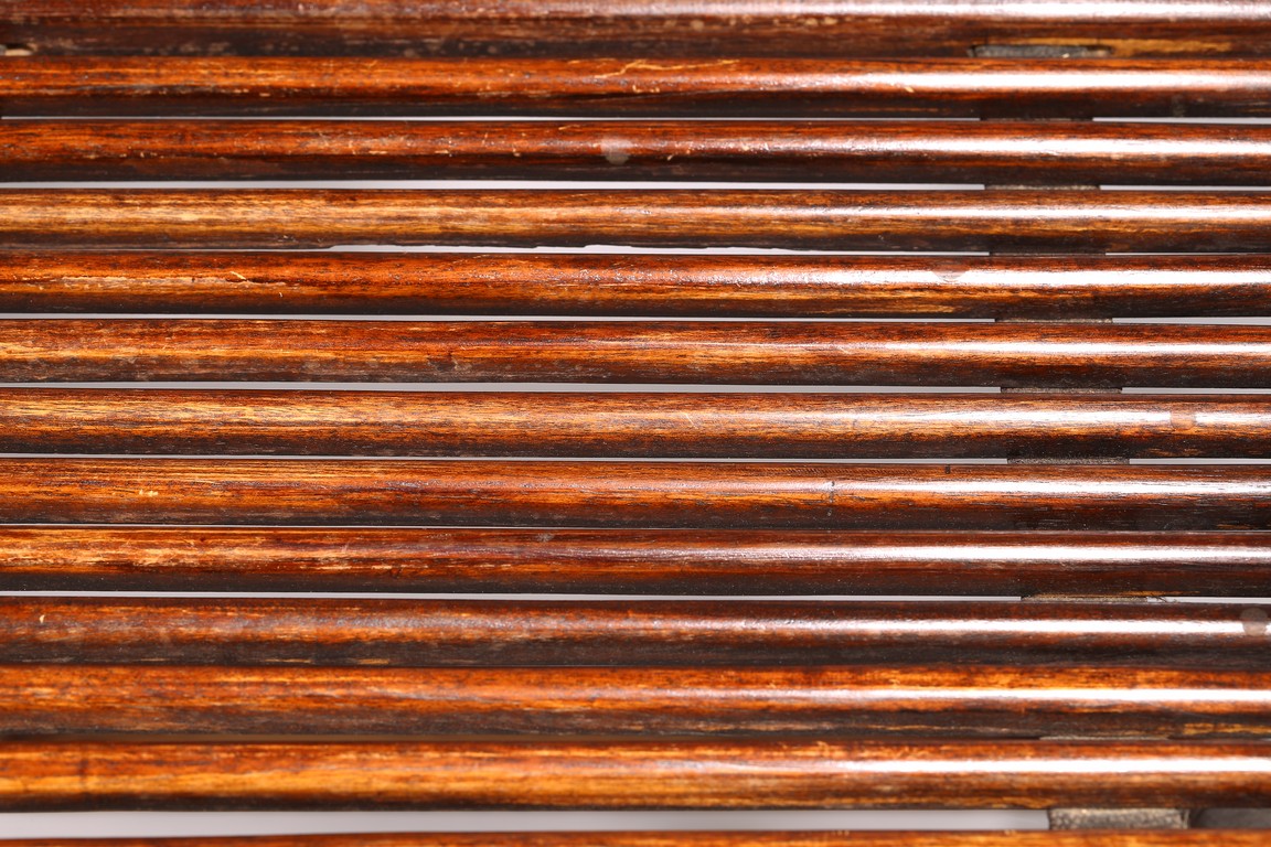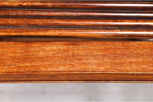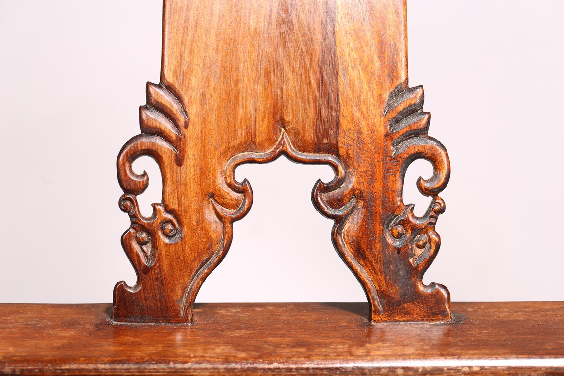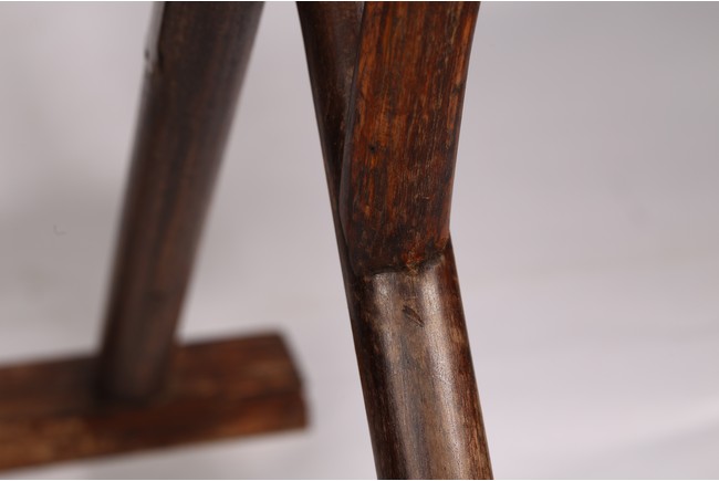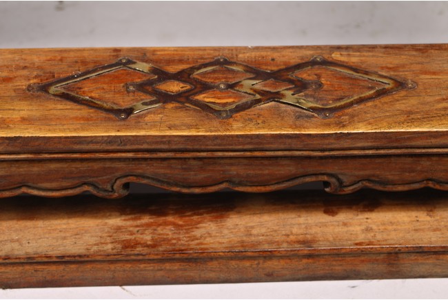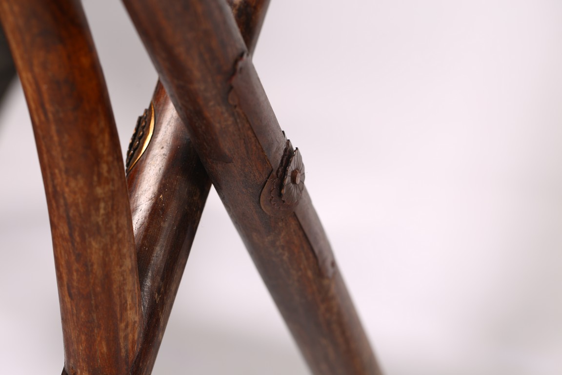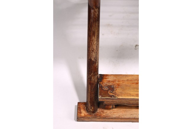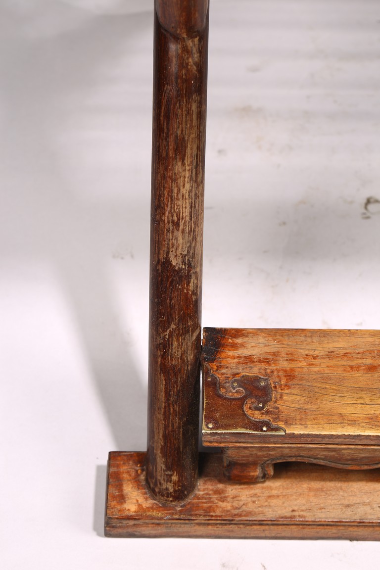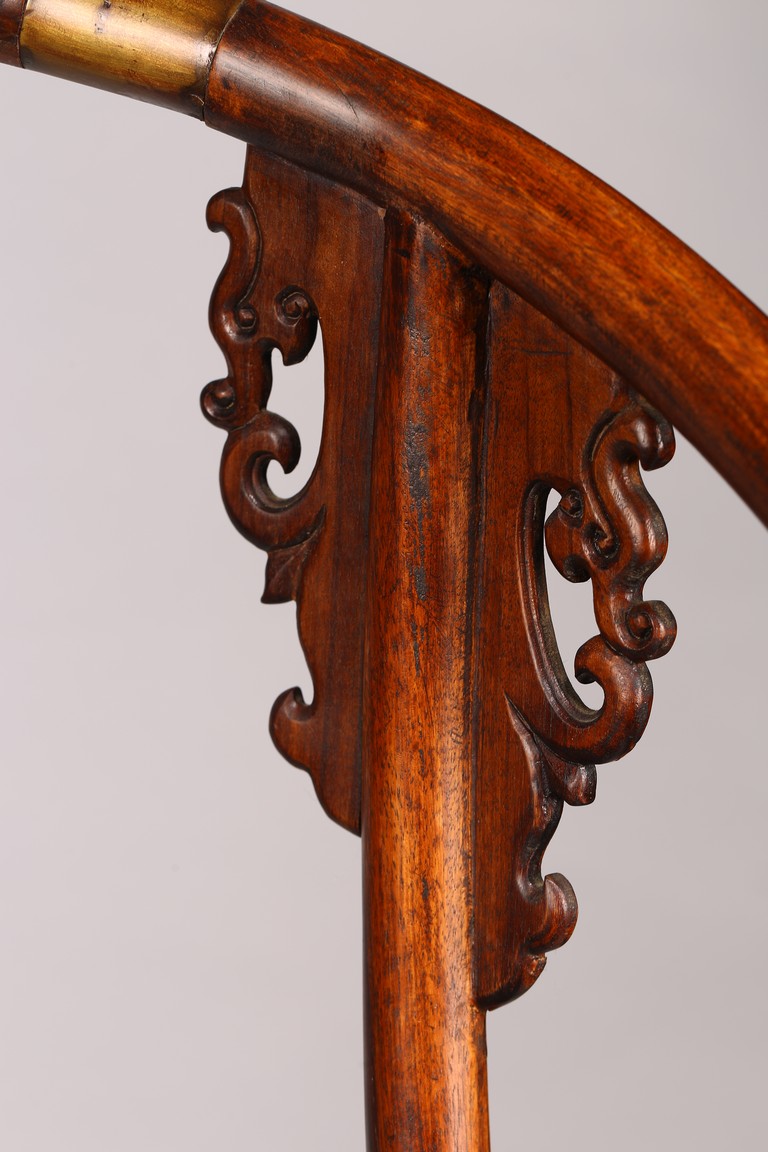 家具收藏中,交椅無疑是收藏家的終極夢想,交椅是可以折疊的坐具。宋金時期,人們從席地而坐轉變為垂足而坐,高座具已經十分普及。從西方傳至中國的交杌,亦演化成帶後背的交椅。交椅是中國傳統文化的產物,是藝術與實用緊密結合的典範。圓後背交椅被推崇為中國古典家具最優秀經典之椅型。此類椅具常見於明清時期之畫中為皇帝與皇後的專貴坐具。此拍品交椅為七接圈,圈形圓轉大氣,扶手處做成鱔魚頭式。靠背板S 形,貼合坐者脊背,背板上部雕對稱龍紋,中部圓形開光雕“卷草龍紋”,威而不猛,尚有明代意趣,下部為如意形壸門。扶手下與支撐構件處及背板接入椅圈處皆有黃銅葉片包裹加強穩固。前後腿斜向交叉,可自由開合。前方腿足下方又設腳踏。腳踏獨板為面,里側出頭為軸,納入腿足,可以轉動收起,下方設壺門牙板,和插肩榫式短足。腳踏展開時,短足正好落在前方托泥之上。整體尺寸碩大,比例勻稱,制作精美,保存良好,是身份和地位的象征,俗語有“第一把交椅”之說。