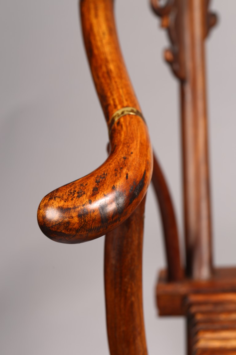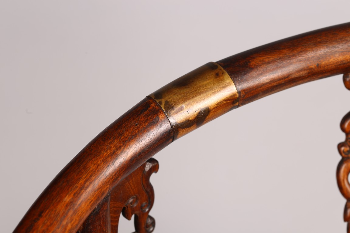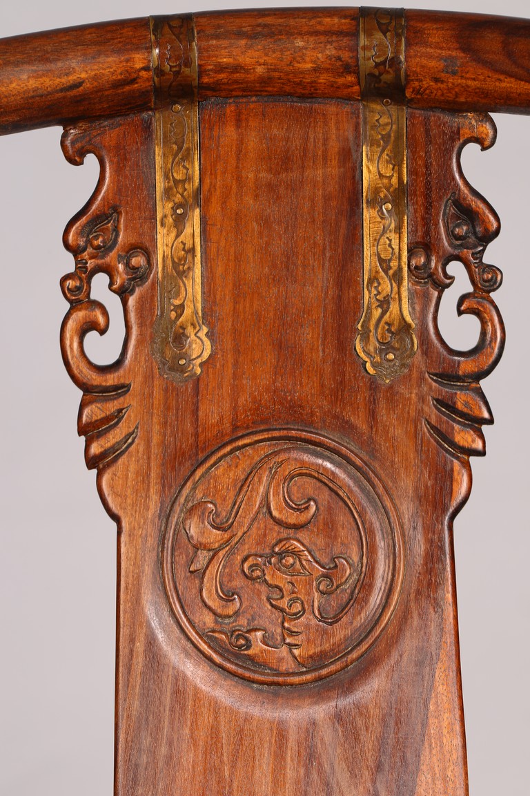 The rounded crestrail with outswept hand grips reinforced by metal mounts, the splat set with panel depicting chilong, the arms supported by curved extensions of the front legs, the slatted seat above the cylindrical legs set into the rectangular base stretchers, the front stretcher beneath a footrest mounted with a rectangular openwork metal fitting of interlocking lozenges.