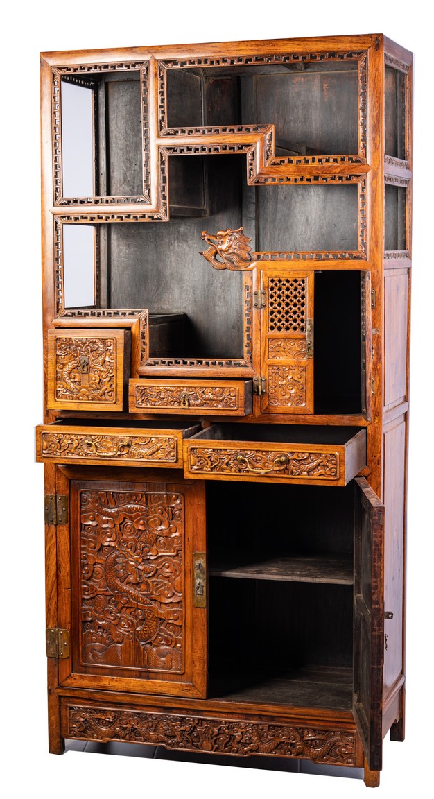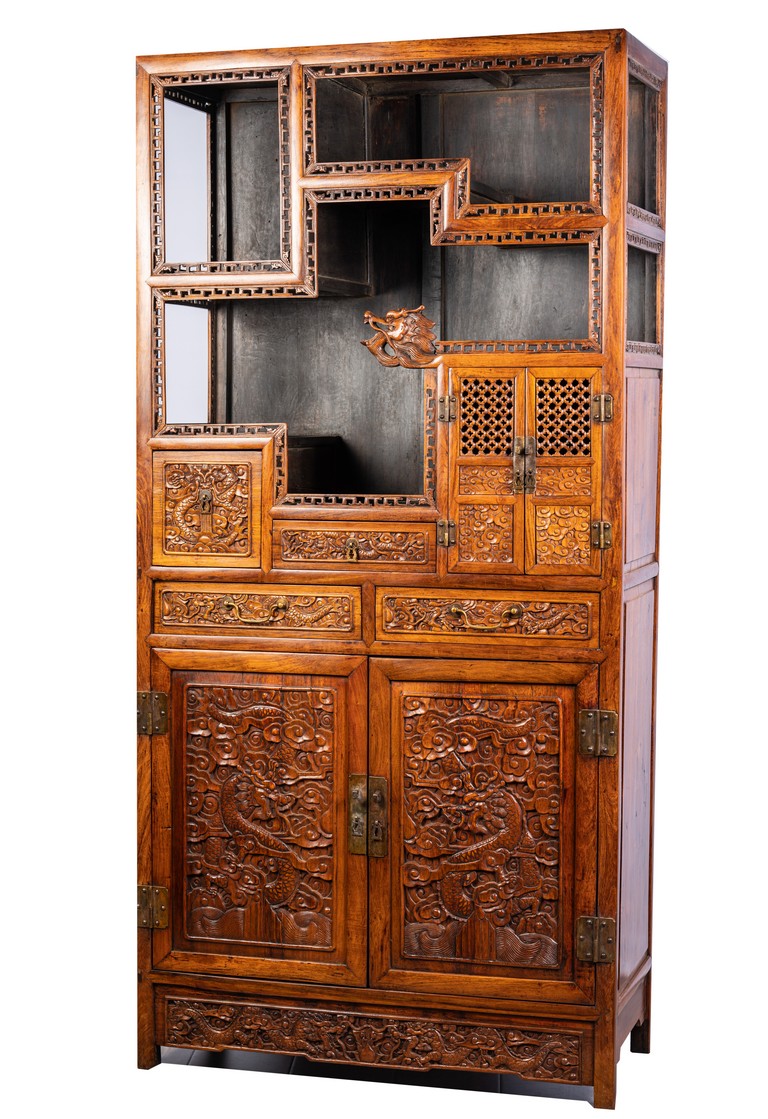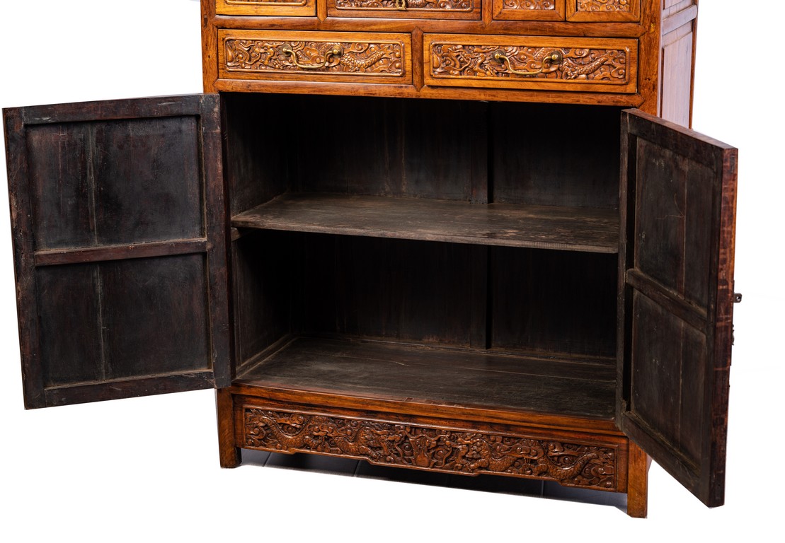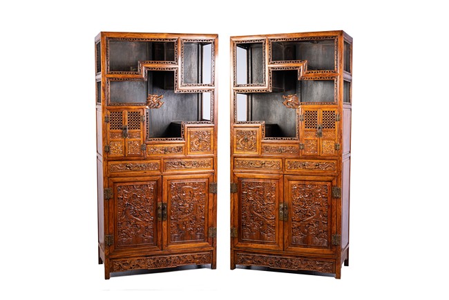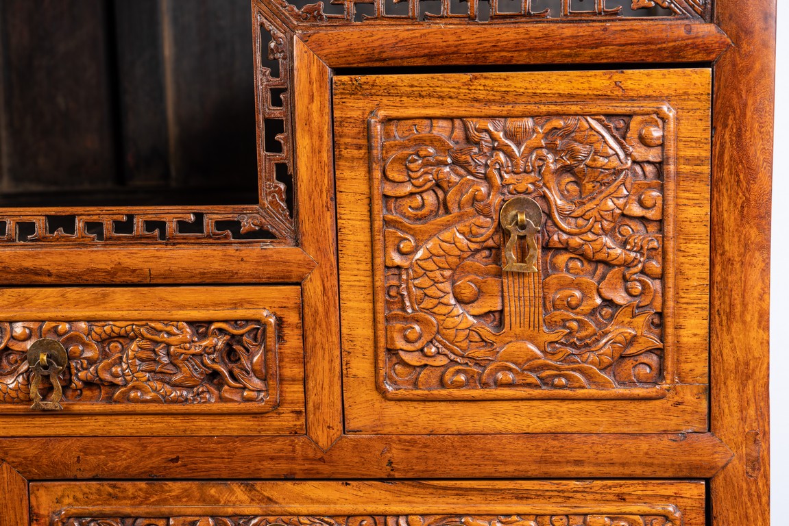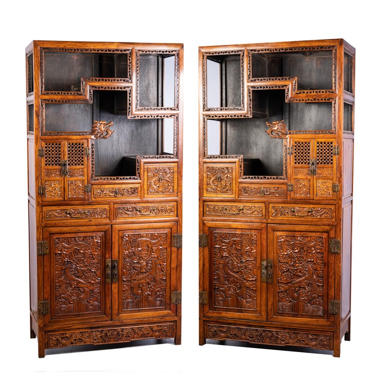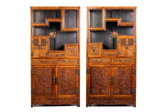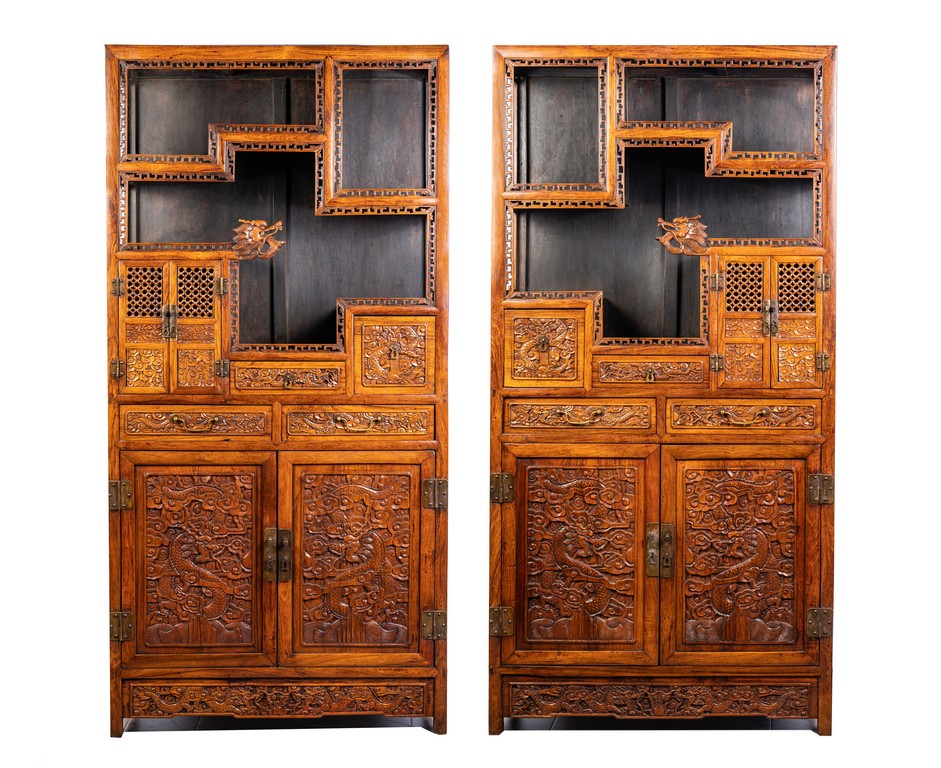 Late Qing/Republic period. The upper portions of each cabinet with tiered shelves of varying height and size, with four small drawers and a compartment with pair of doors, all above a pair of hinged doors, the drawers and doors carved in relief with dragon amidst clouds, with brass hinges and lock plates.