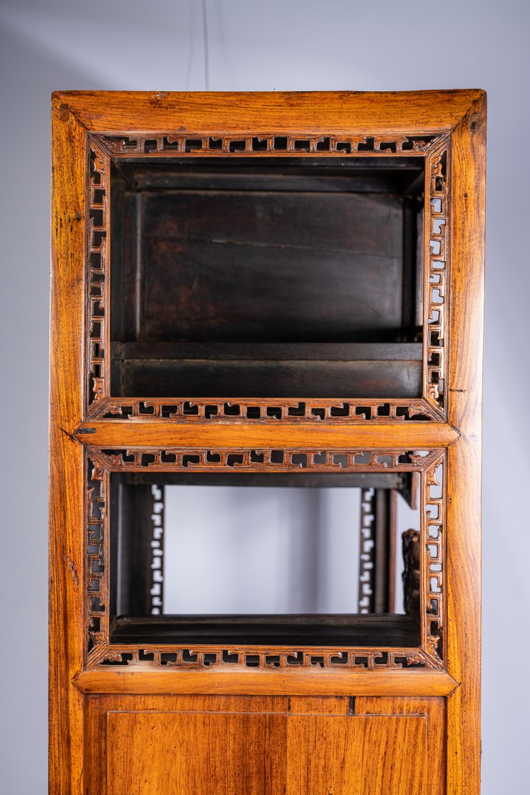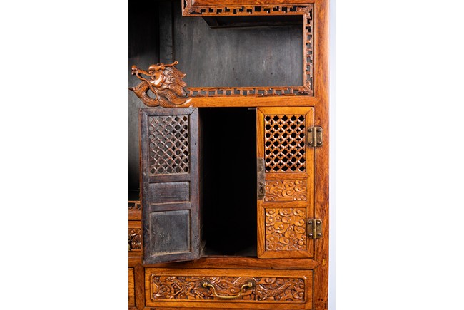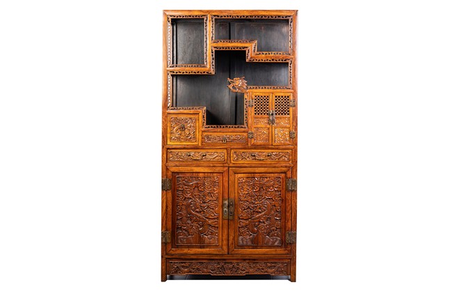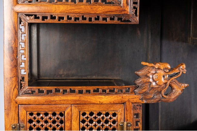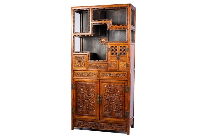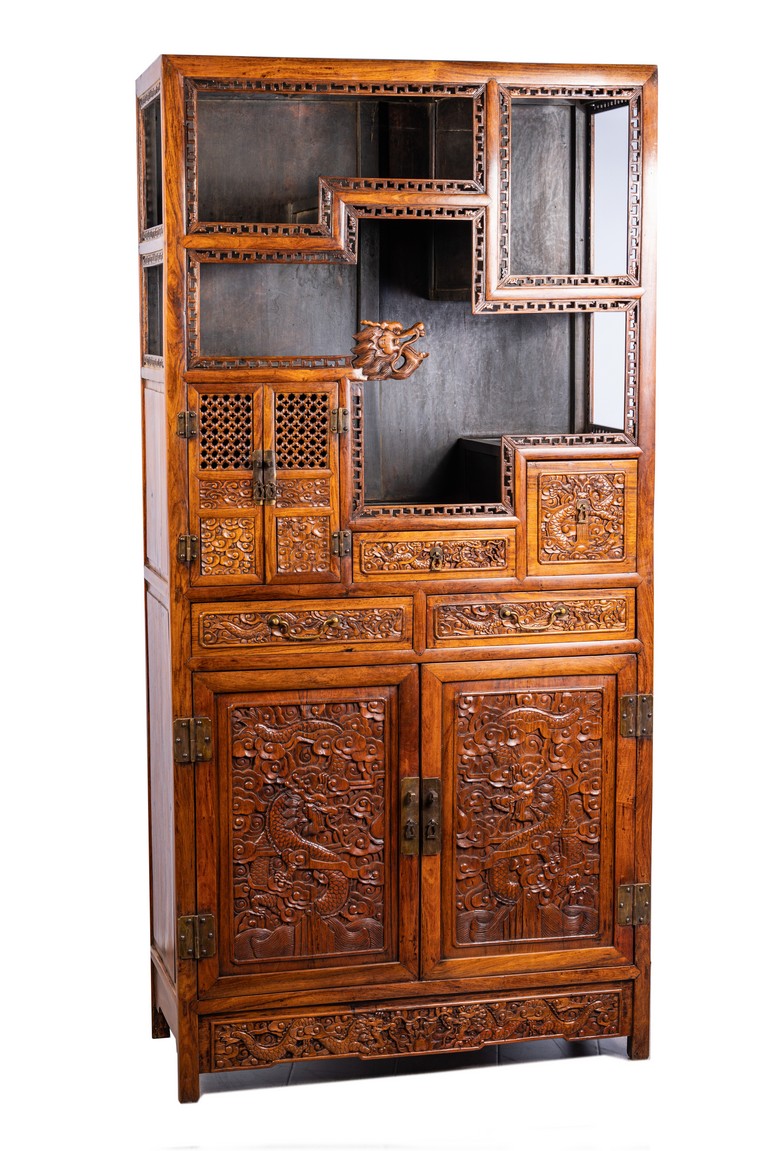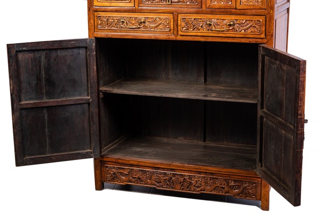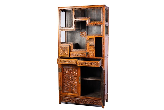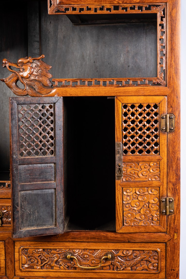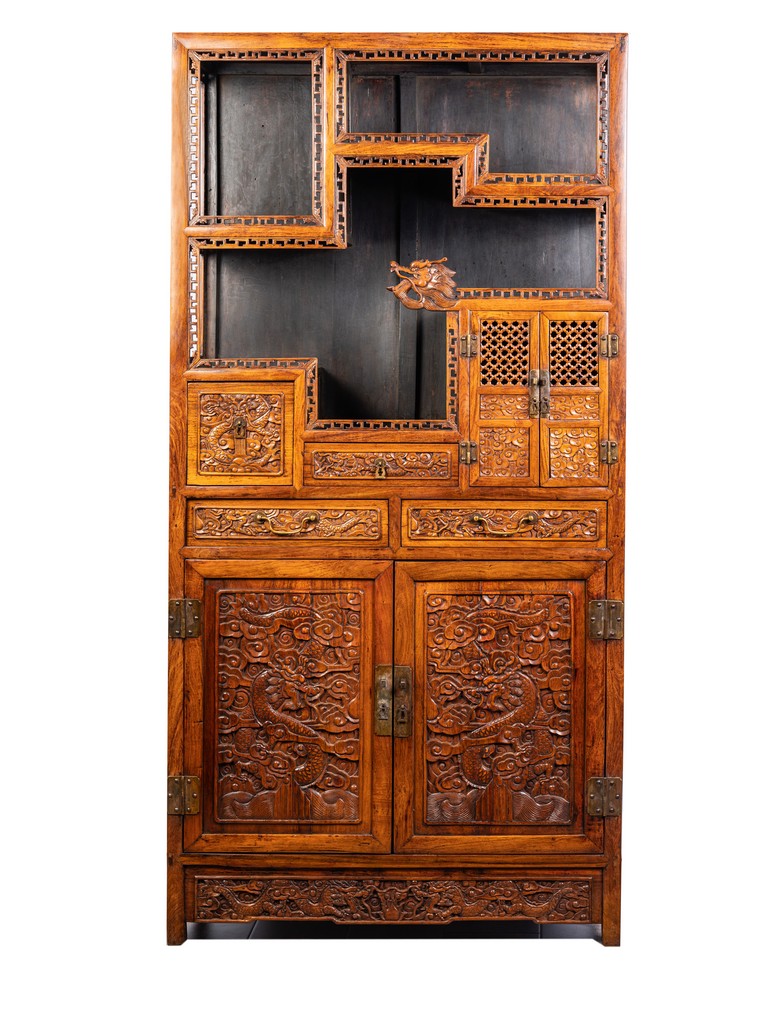 Late Qing/Republic period. The upper portions of each cabinet with tiered shelves of varying height and size, with four small drawers and a compartment with pair of doors, all above a pair of hinged doors, the drawers and doors carved in relief with dragon amidst clouds, with brass hinges and lock plates.
