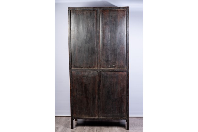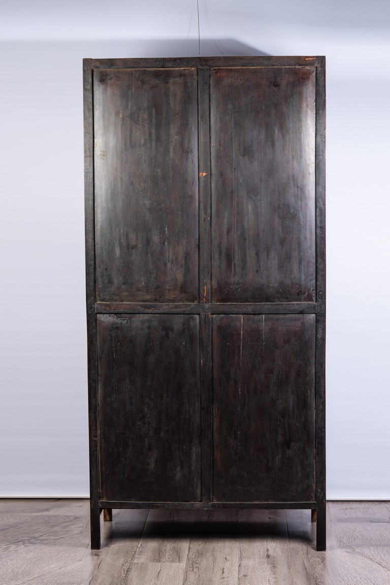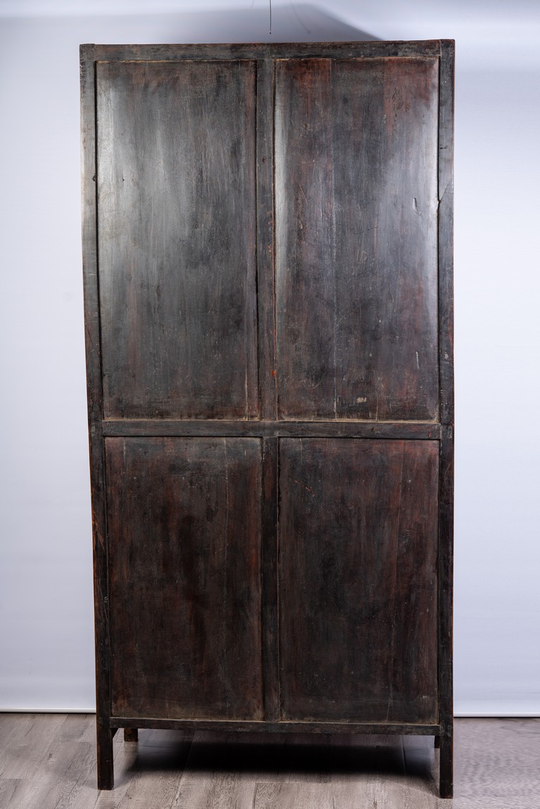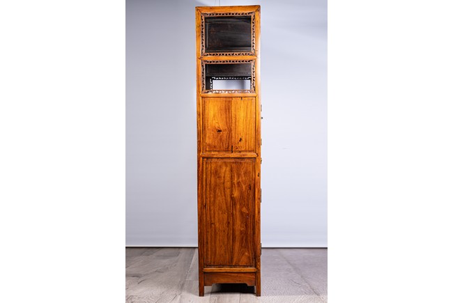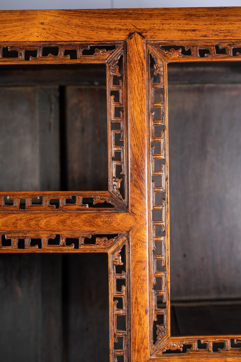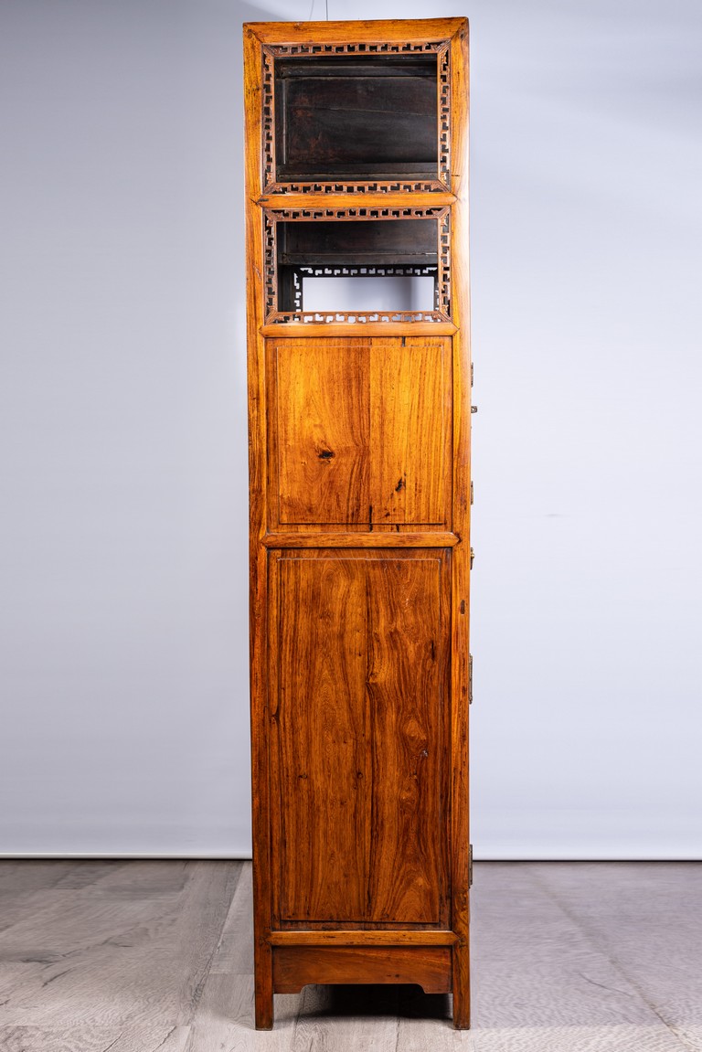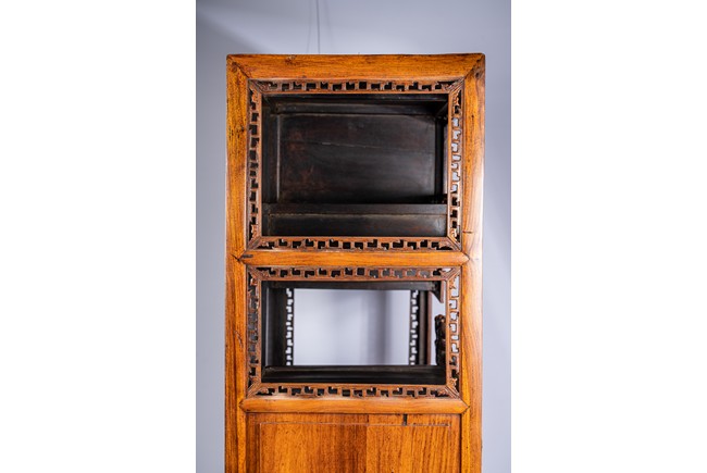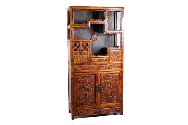 Late Qing/Republic period. The upper portions of each cabinet with tiered shelves of varying height and size, with four small drawers and a compartment with pair of doors, all above a pair of hinged doors, the drawers and doors carved in relief with dragon amidst clouds, with brass hinges and lock plates.
