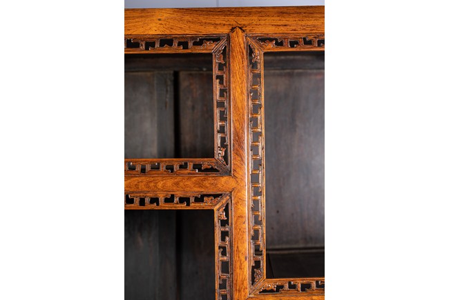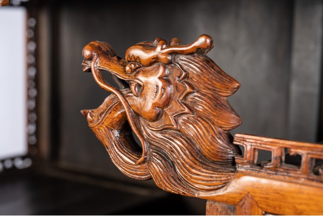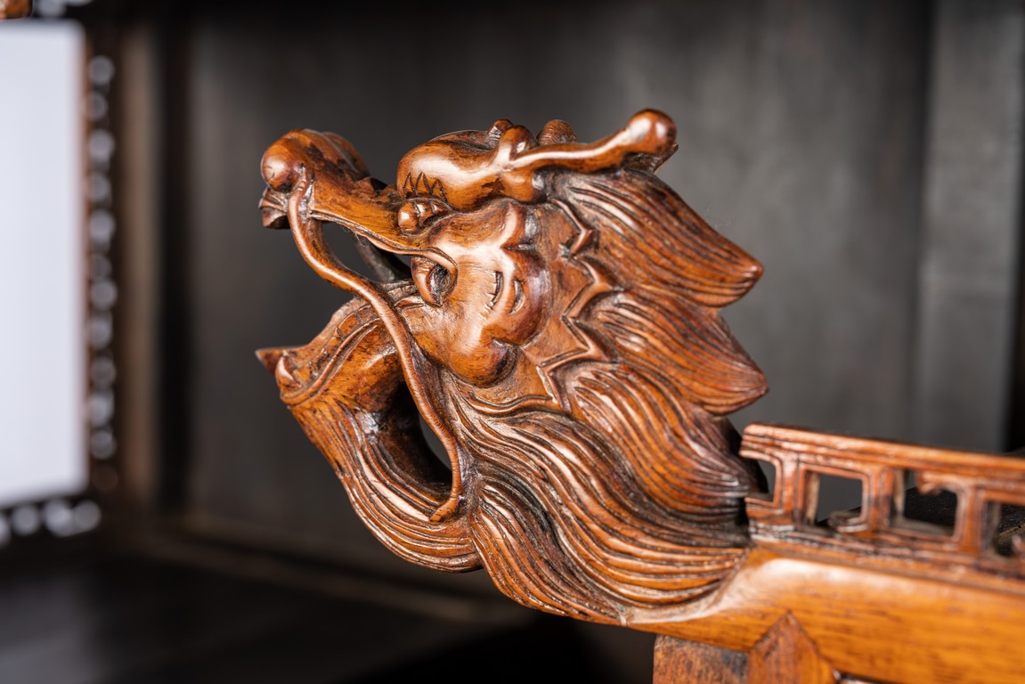 這對黃花梨博古櫃比例勻稱,用料相當珍貴考究,框架用格肩榫卯相接。兩扇門板和櫃膛的立墻均鏟地高浮雕雲龍紋,波濤之上,浮雲之間,雲龍俯首下窺,龍身輾轉騰挪,氣宇軒昂,龍爪張弩,矯健有力。此櫃雕飾精美,龍頭飽滿、雙角上揚,須发飛揚、身軀婉轉、鱗片服帖及龍爪張弩等等,皆用心刻畫,有著高超的藝術水平。