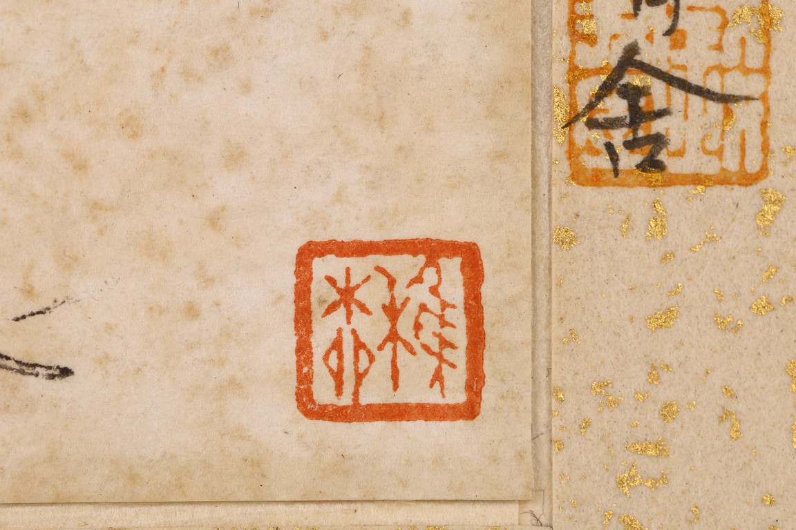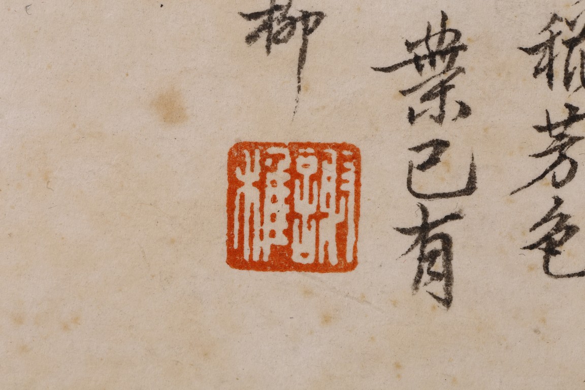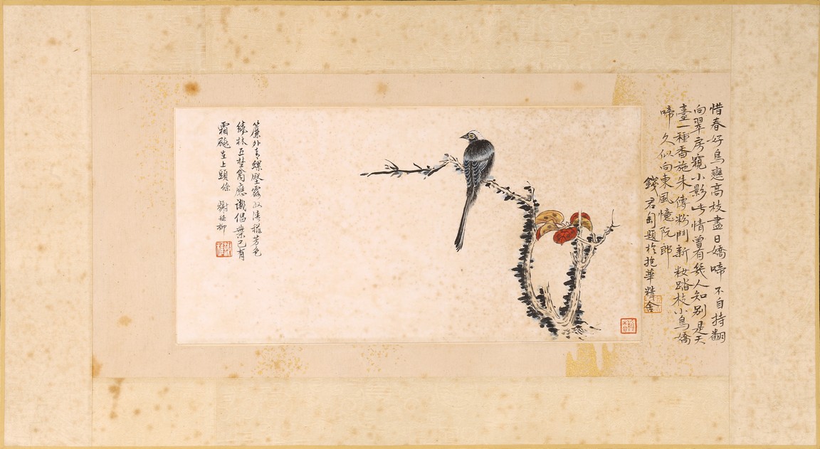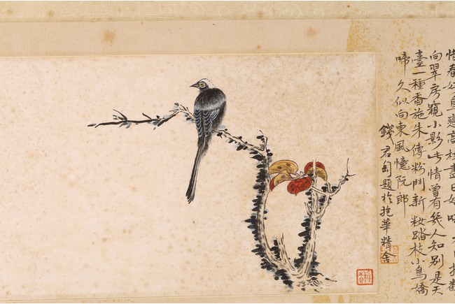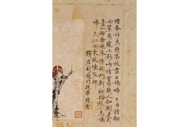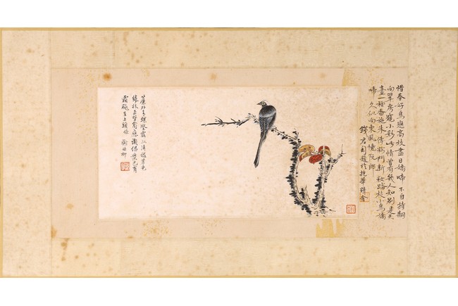 Color and ink on paper. Bird and flowers. Inscribed and signed Xie Zhiniu, with two seal marks of the artist, with colophon signed.