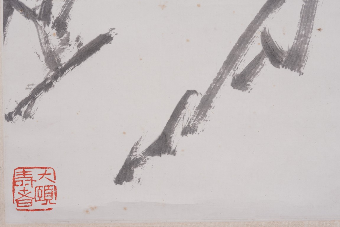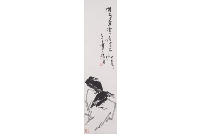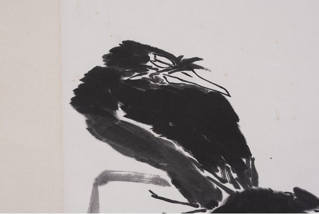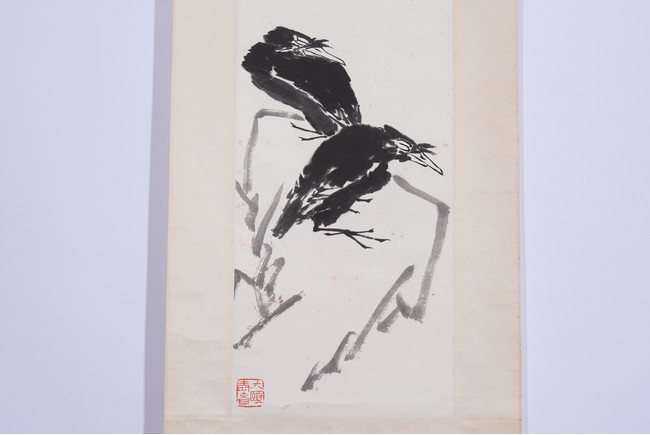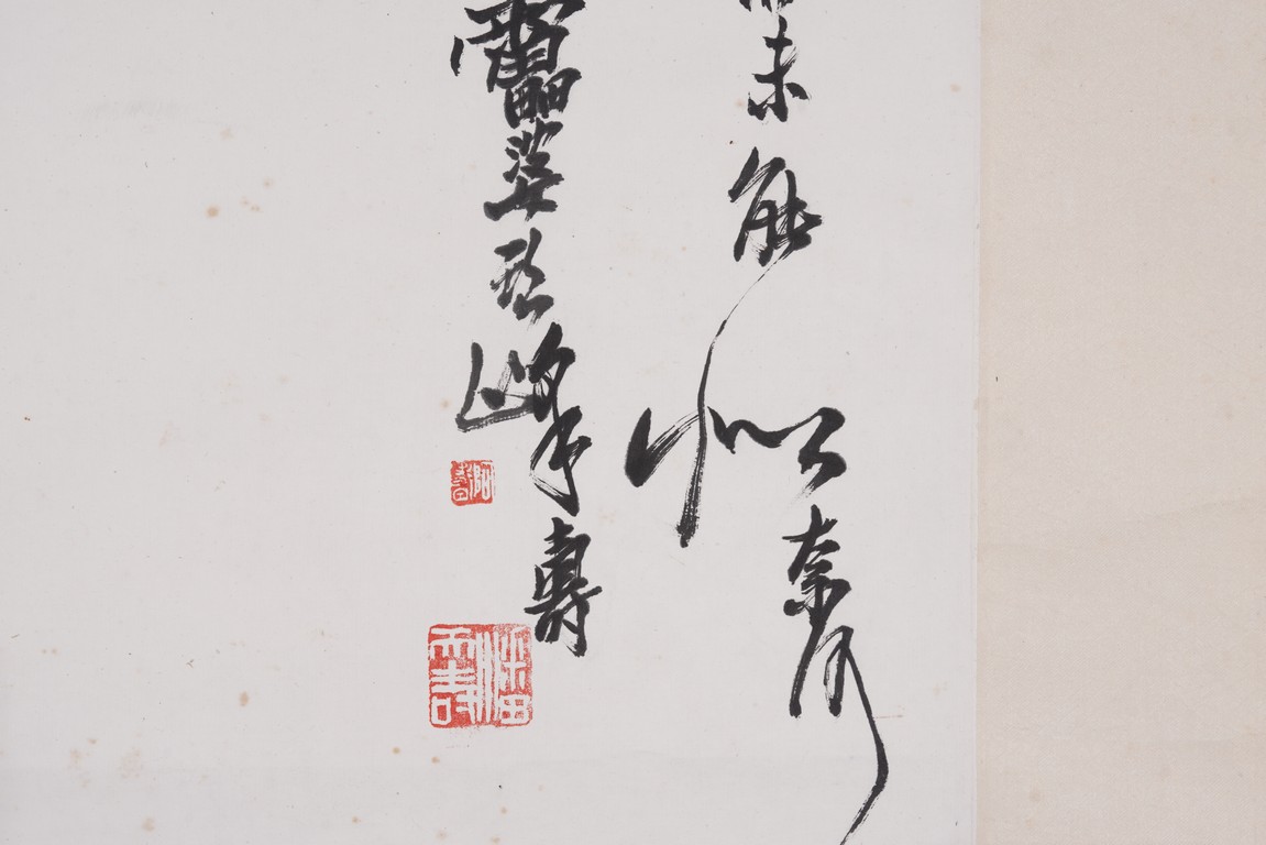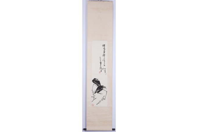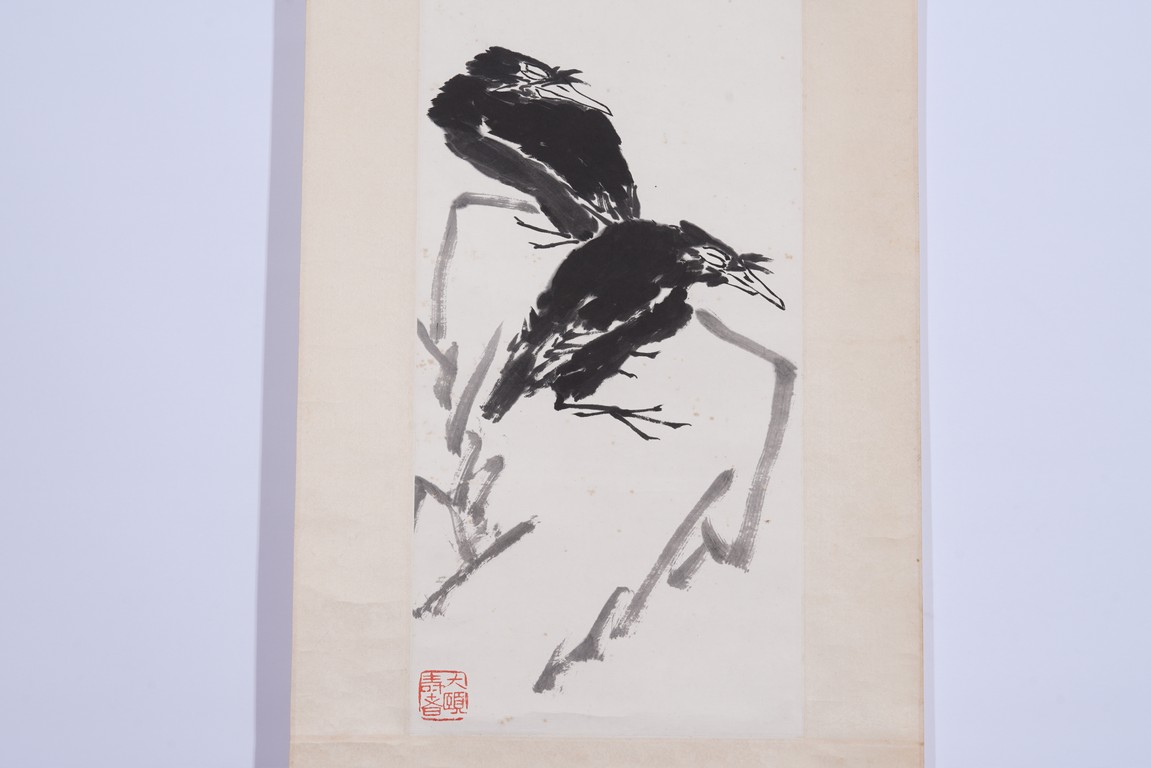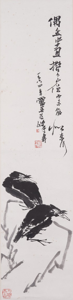 Ink on paper. Eagles and rock. Inscribed and signed Shou, with three seals of the artist. Hanging scroll. Attributed to Pan Tianshou.