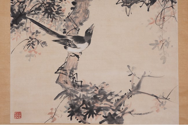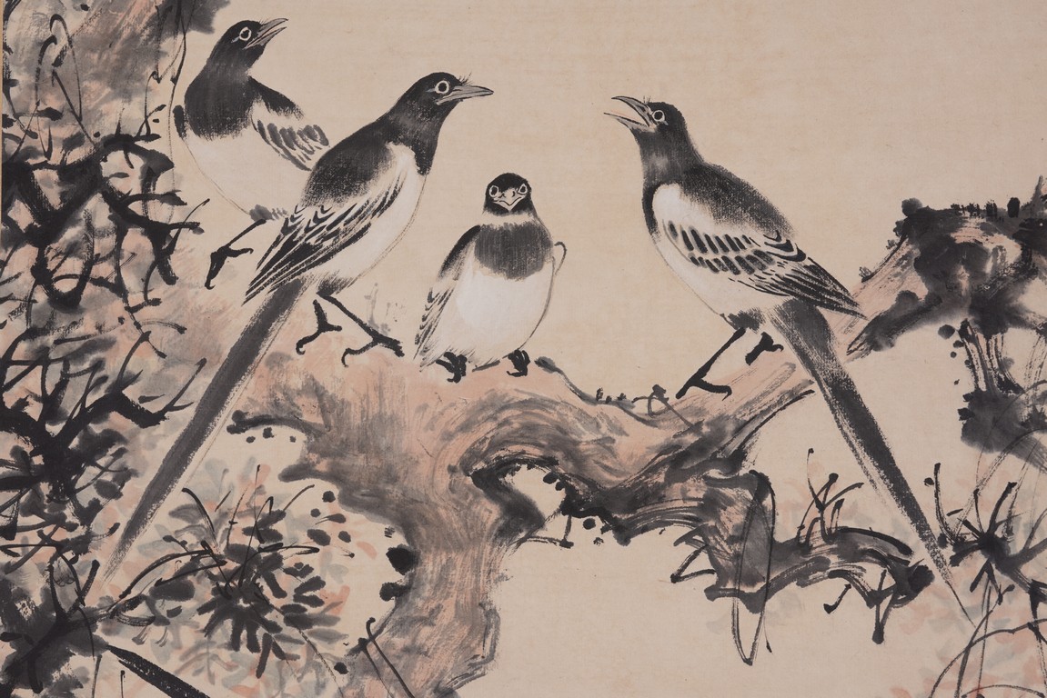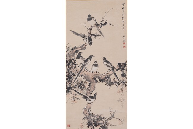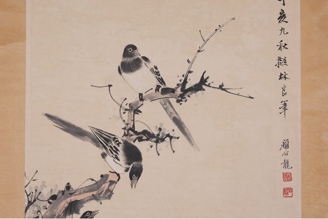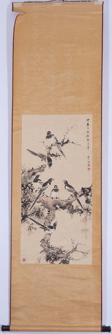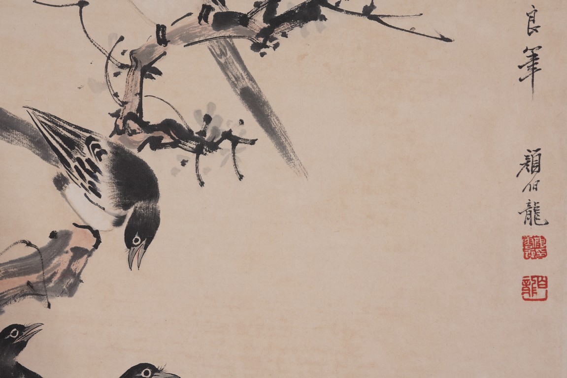 Color and ink on paper. Birds. Hanging scroll. Inscribed and signed Yan Bolong, with three seal marks of the artist.