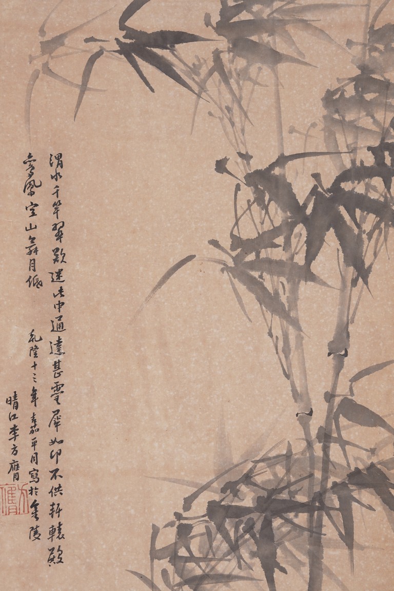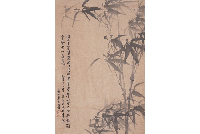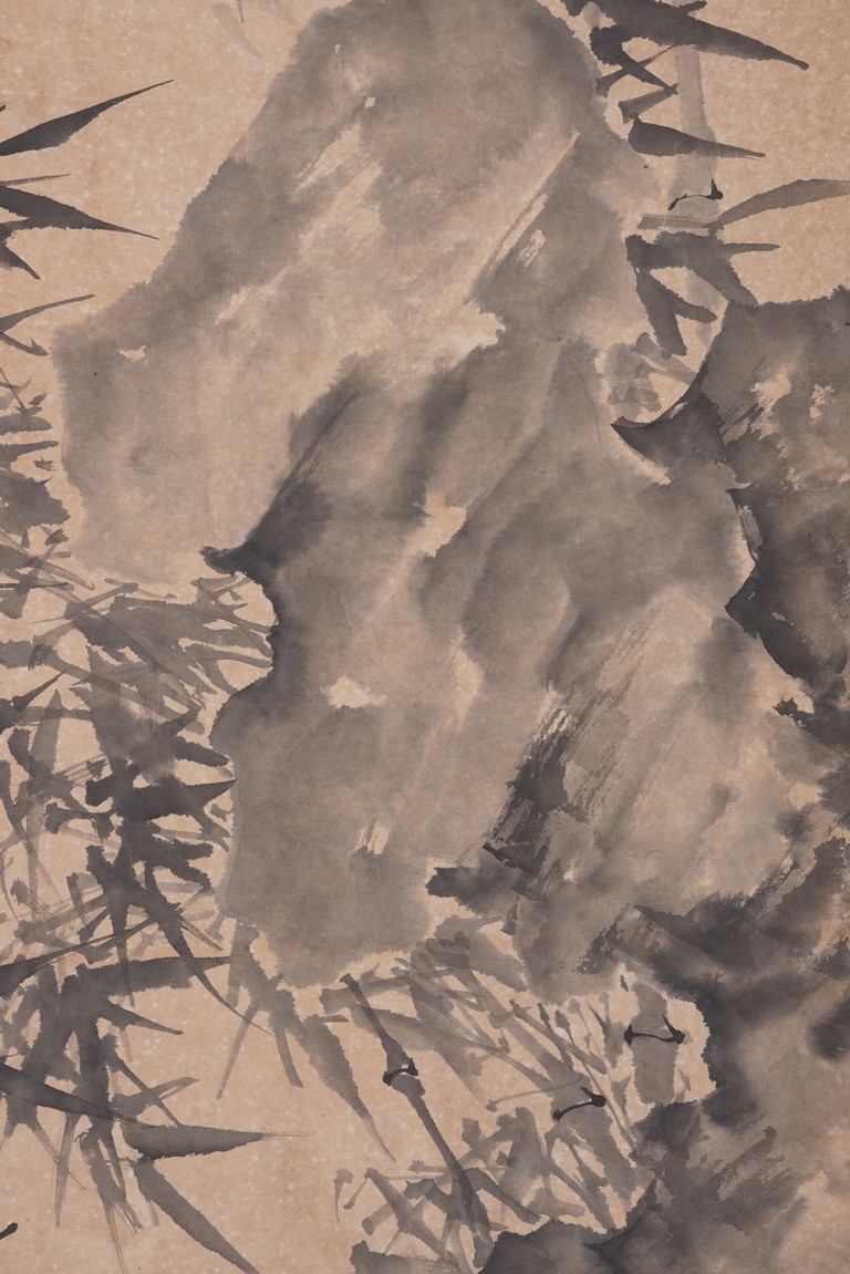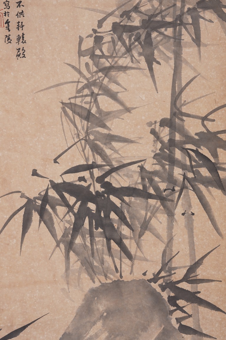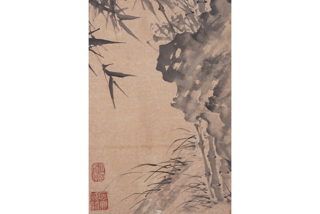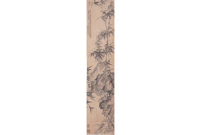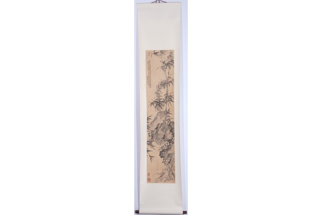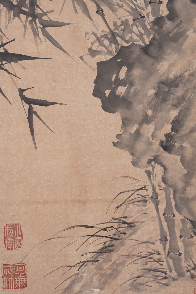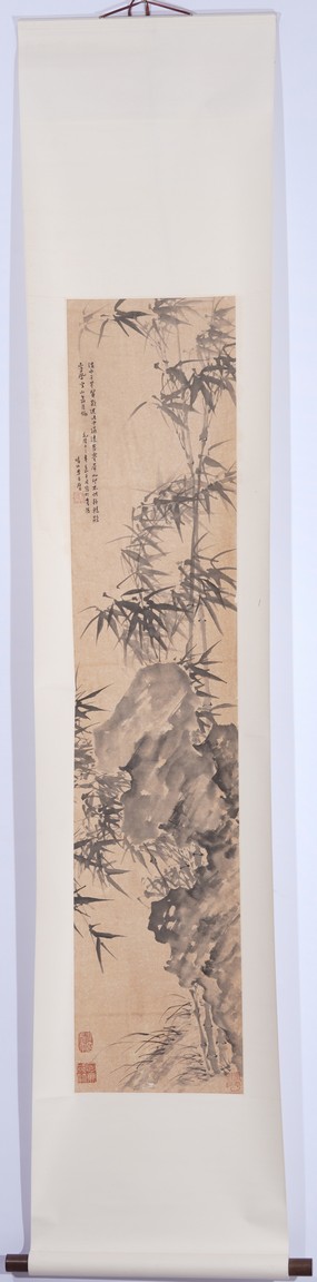 Ink on paper. Bamboo and rocks. Hanging scroll. Inscribed and signed with four seal marks of the artist.