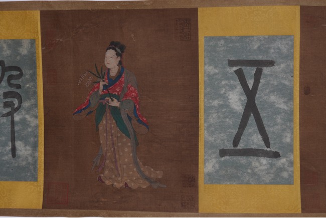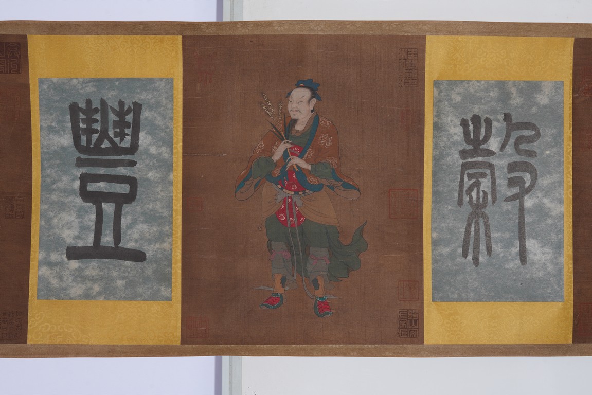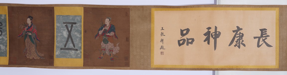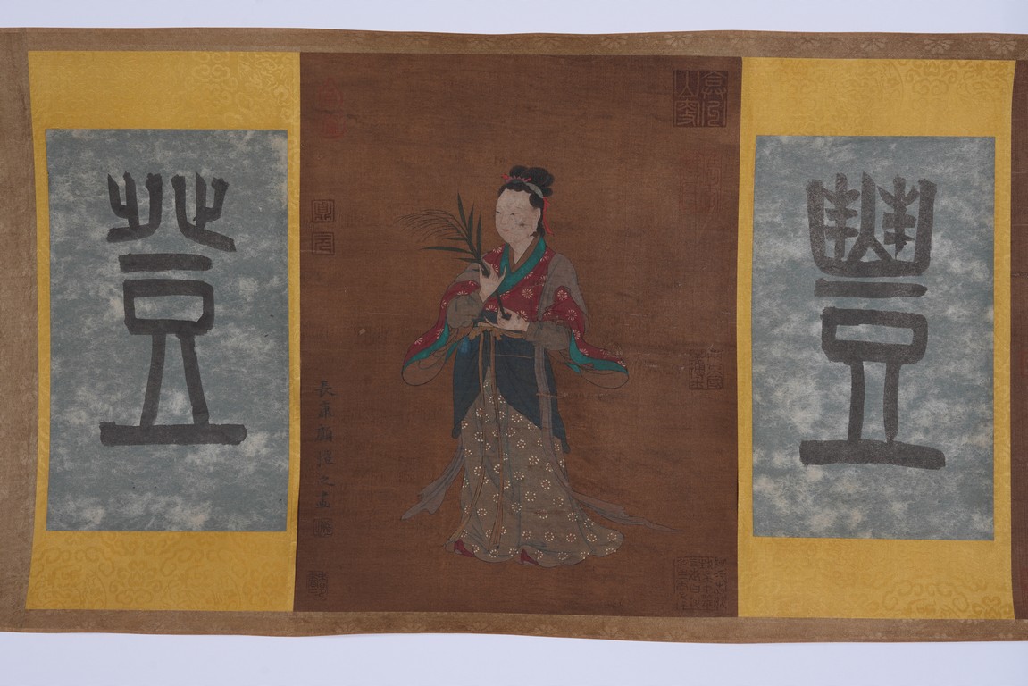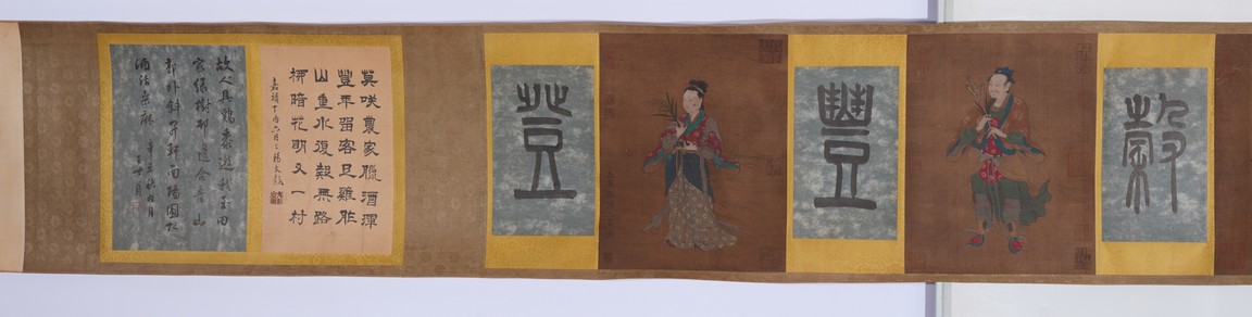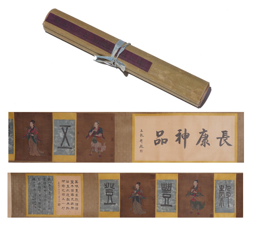 Color and ink on silk. Immortal figures. Signed and with seal marks of the artist and collectors, with frontispiece signed and two signed colophons at the end. Attributed to Gu Kaizhi.
