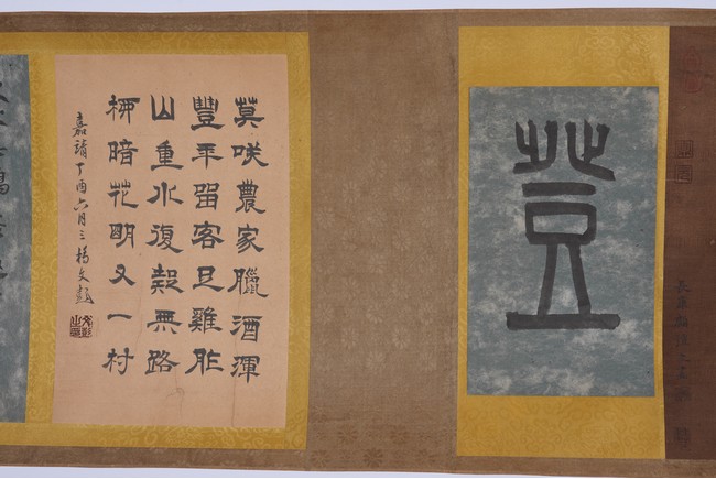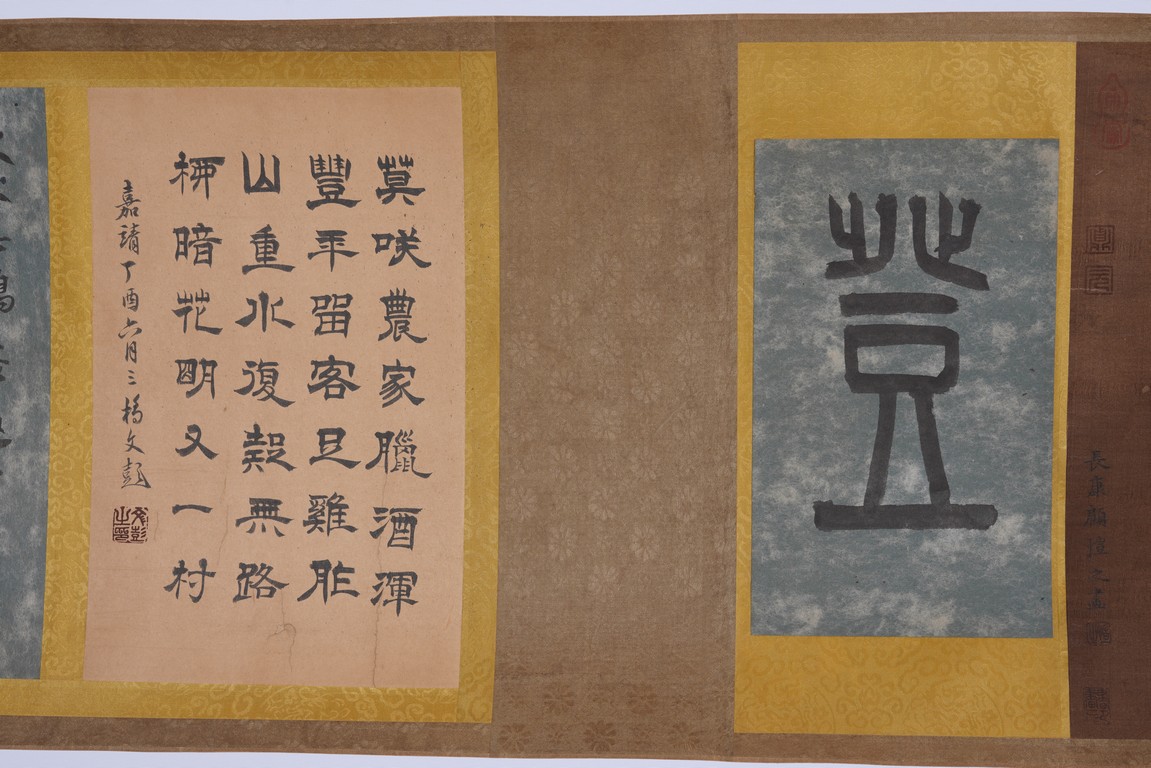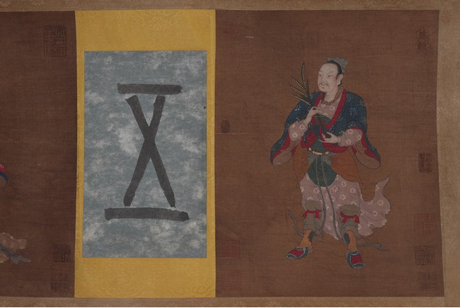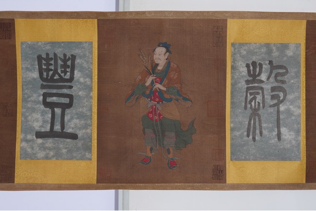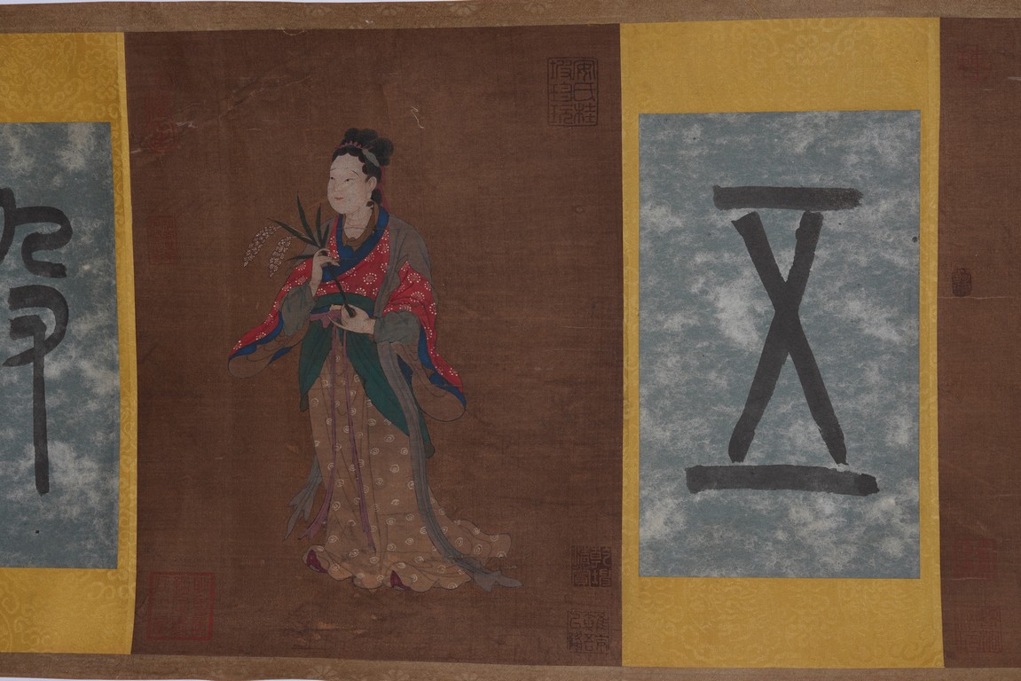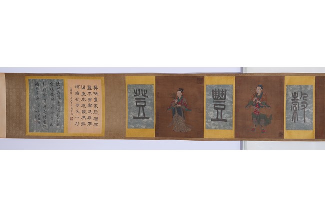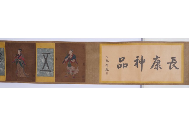 Color and ink on silk. Immortal figures. Signed and with seal marks of the artist and collectors, with frontispiece signed and two signed colophons at the end. Attributed to Gu Kaizhi.