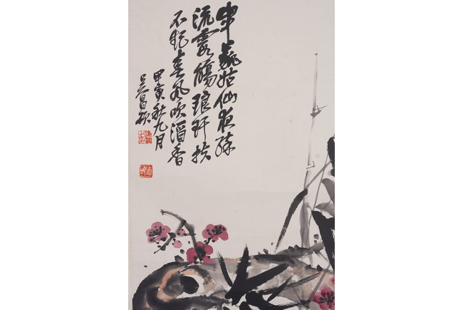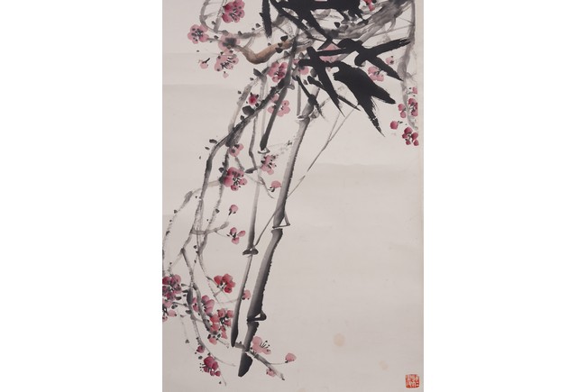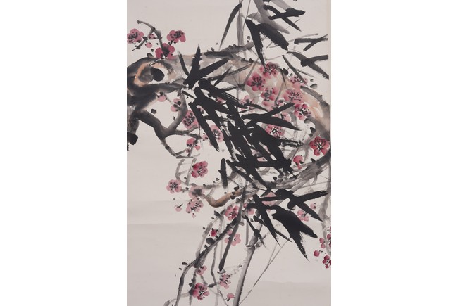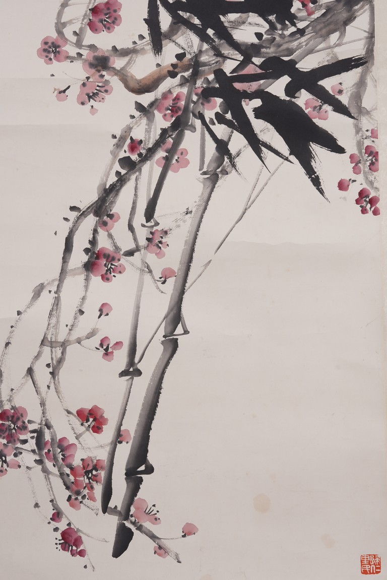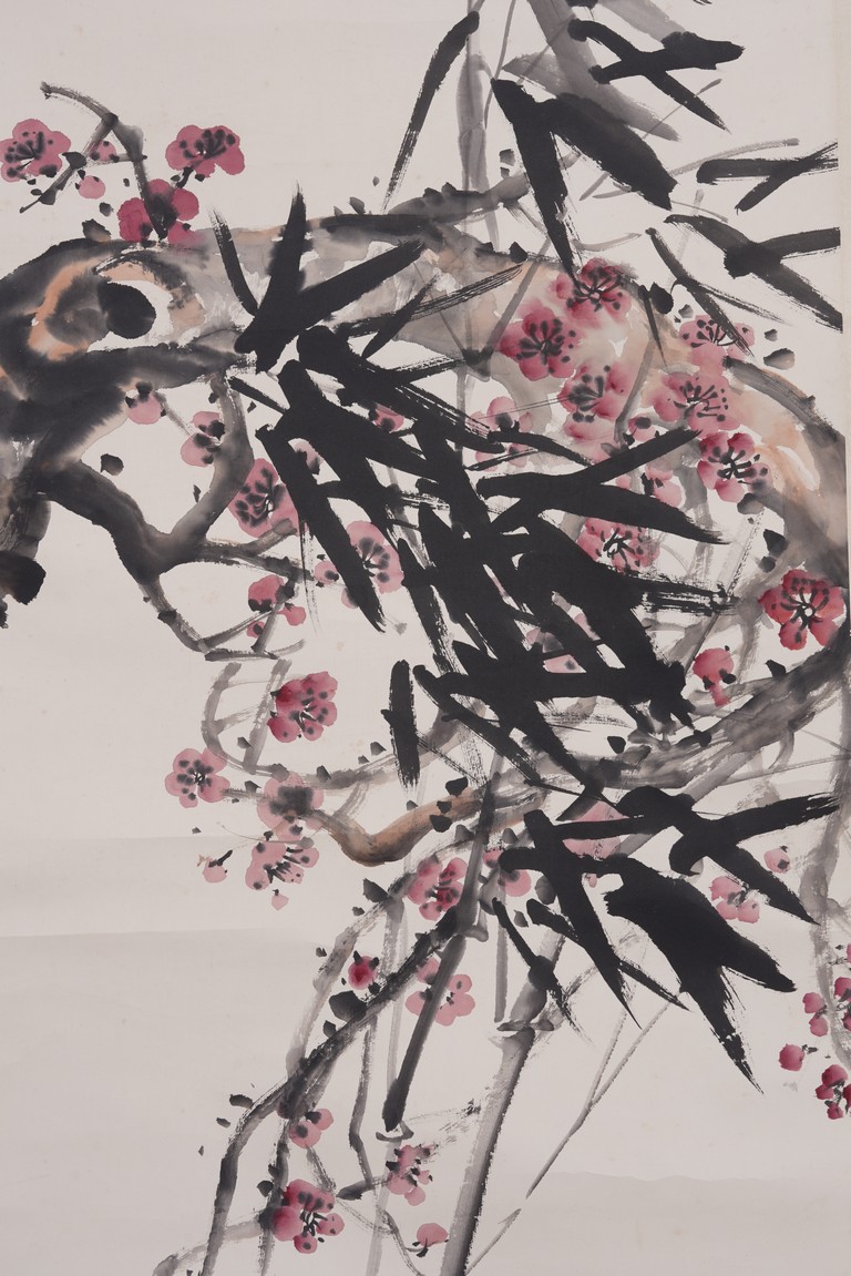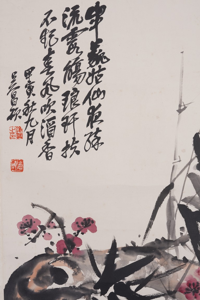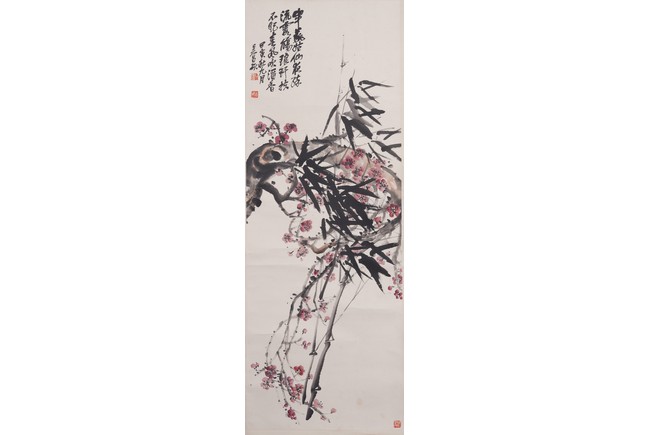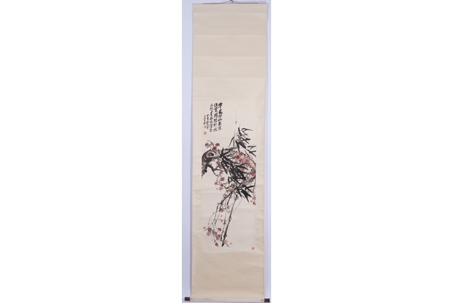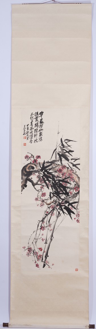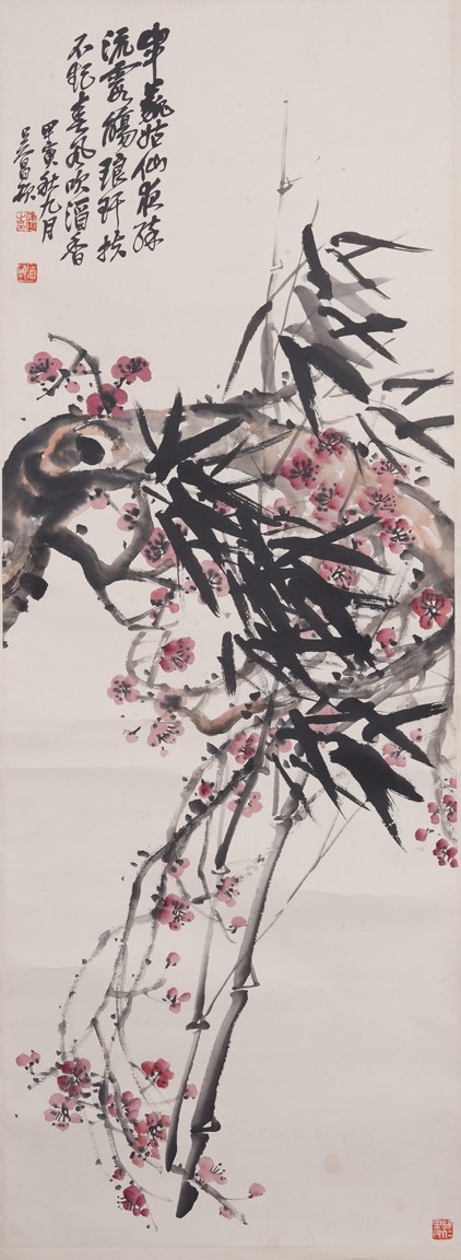 Color and ink on paper. Prunus blossoms. Hanging scroll. Inscribed and signed Wu Changshuo, with three seal marks of the artist.