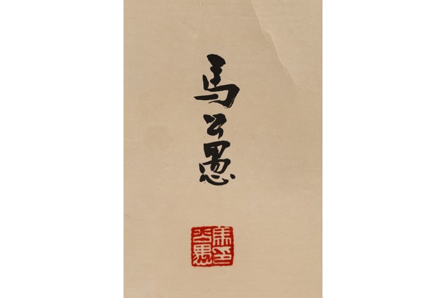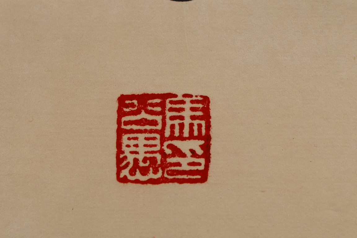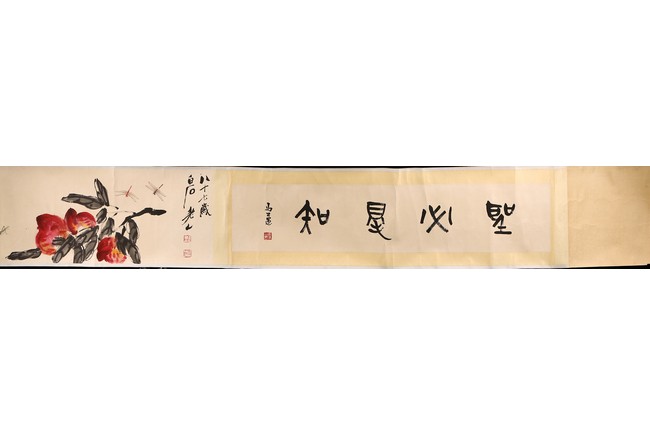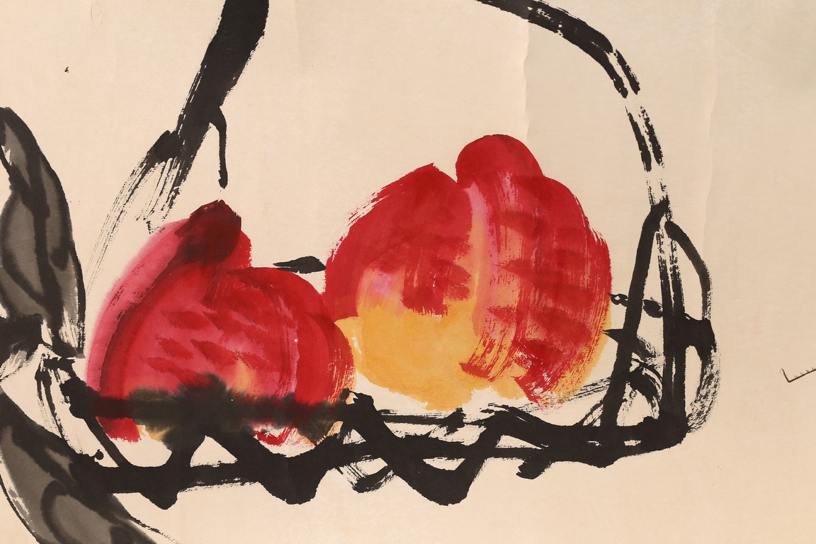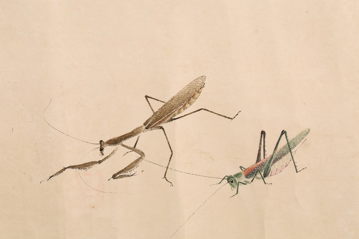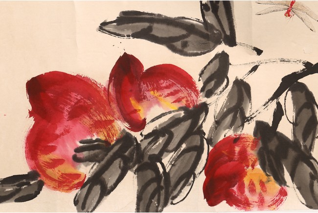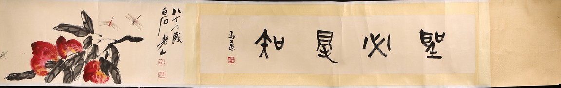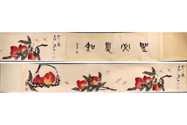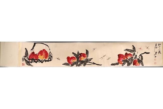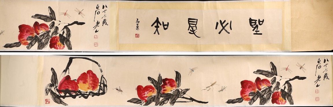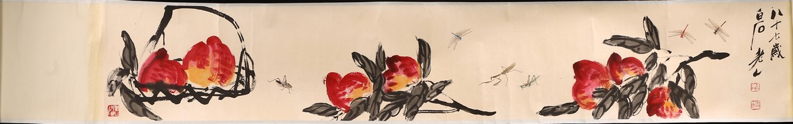 Color and ink on paper. Insects and peaches. Inscribed and signed Bai Shi, with three seal marks of the artist. Frontispiece signed Ma Gongyu with one seal mark.