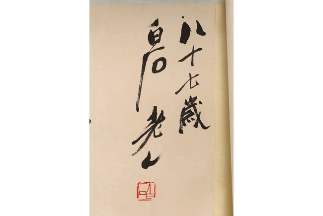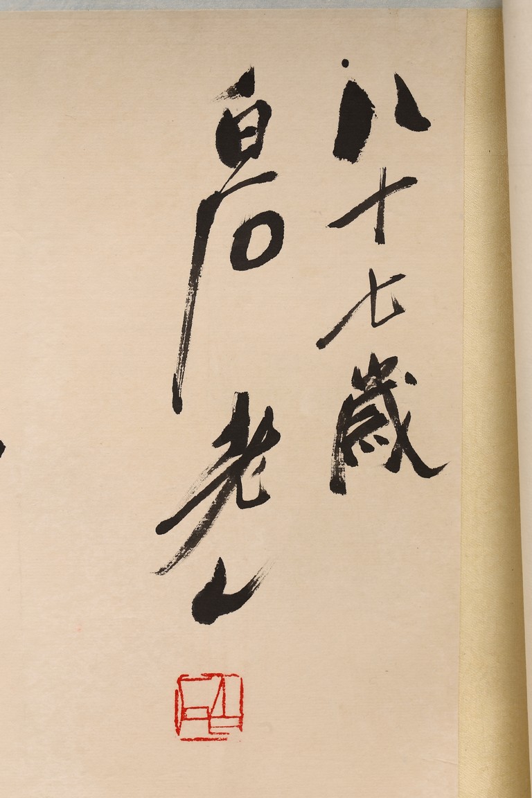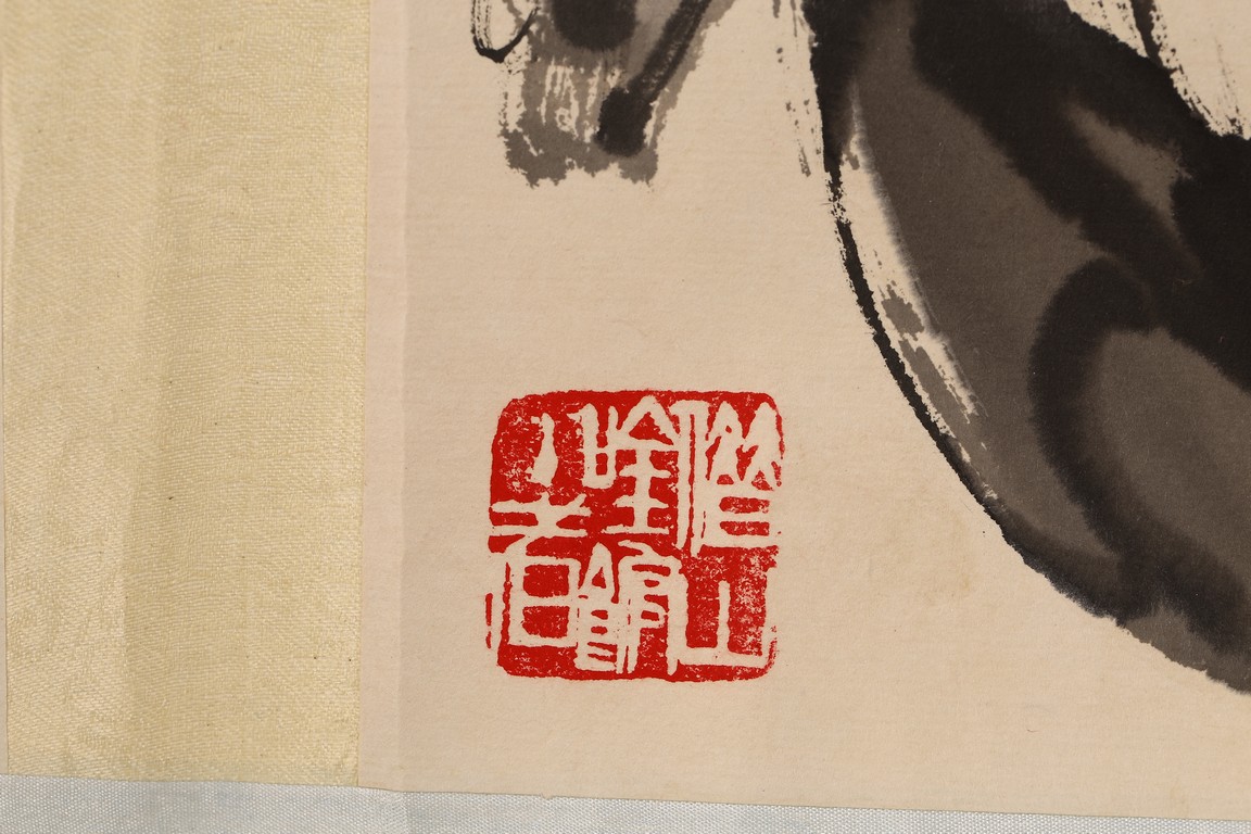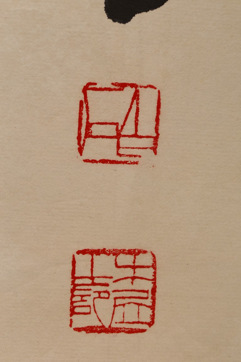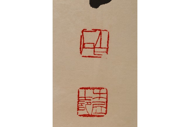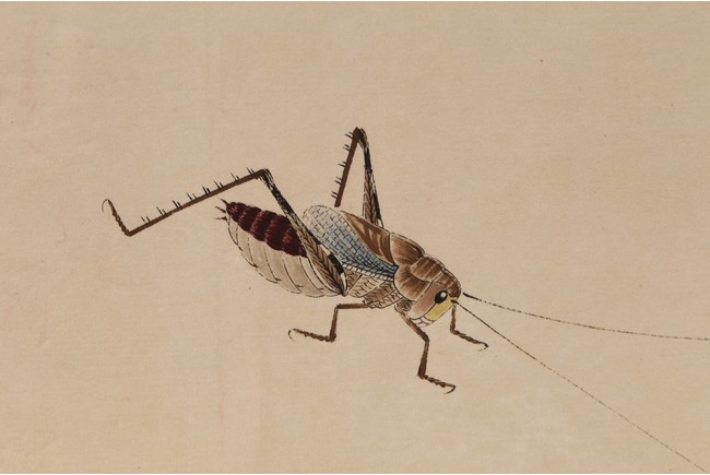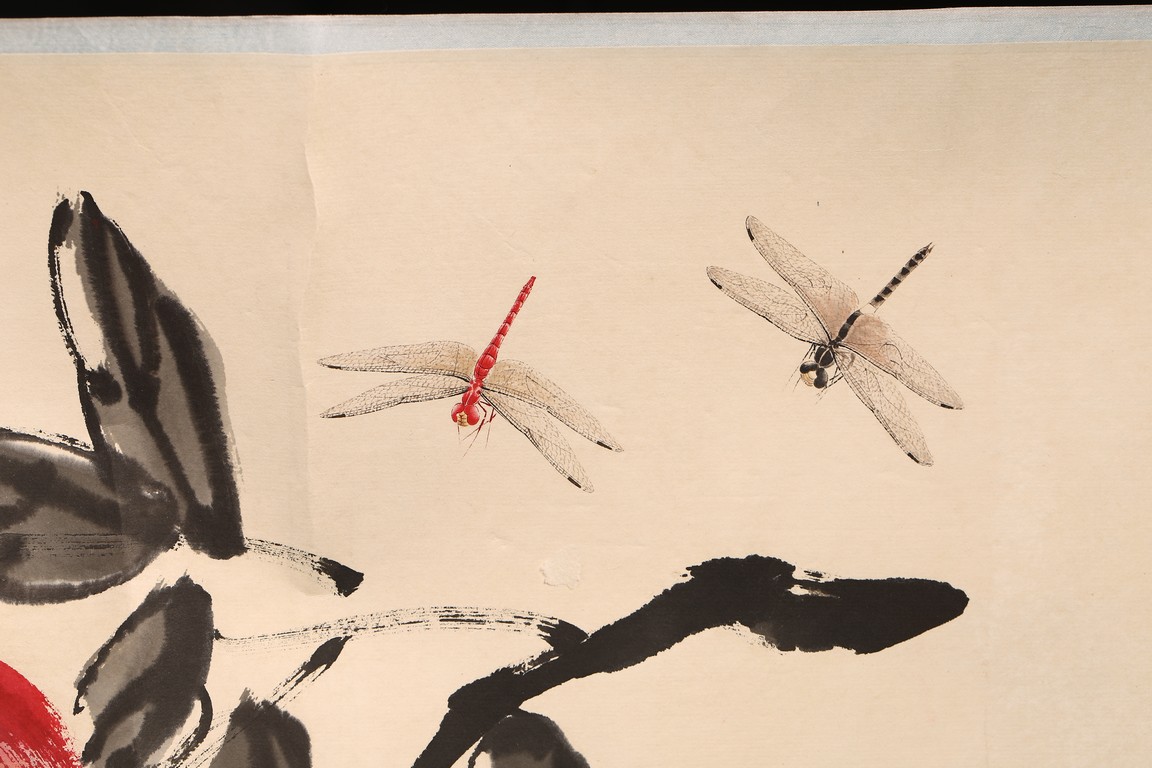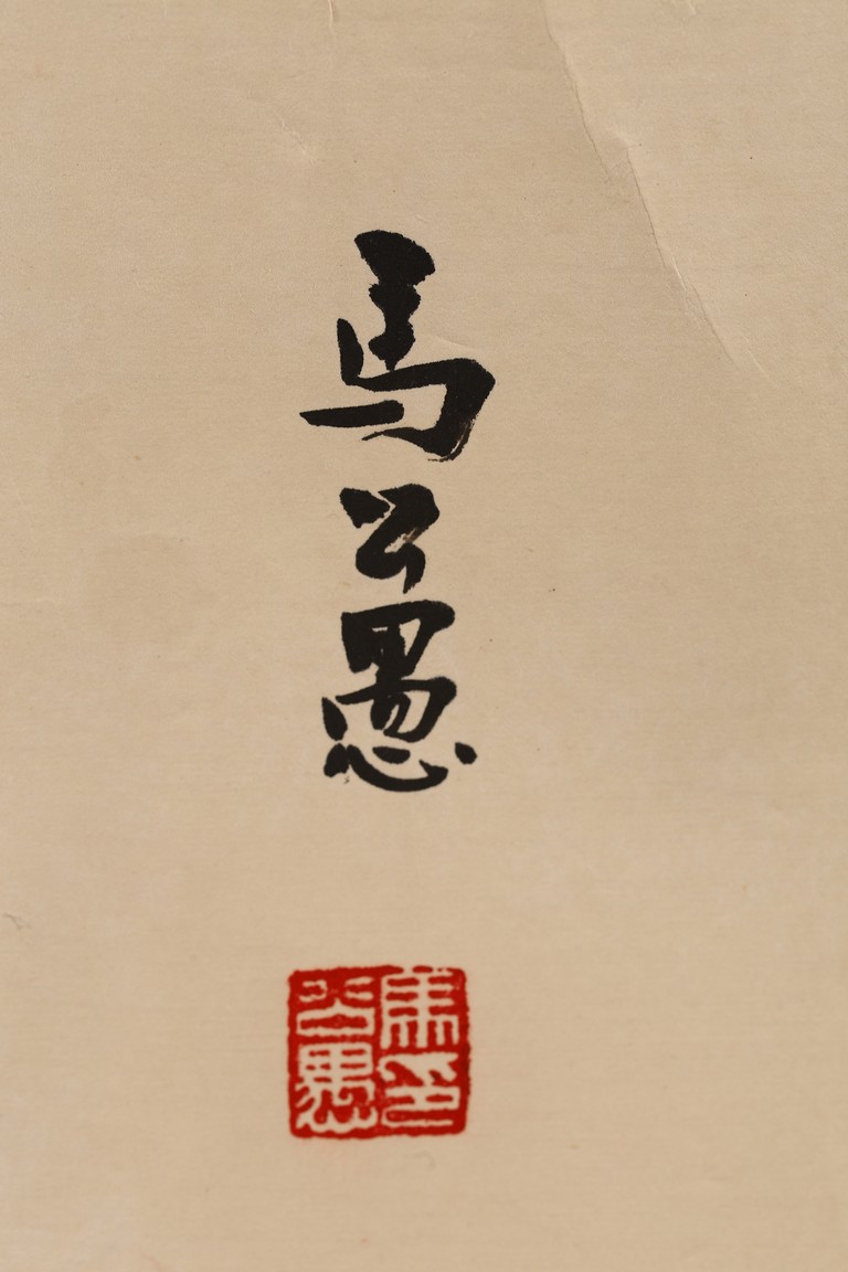 Color and ink on paper. Insects and peaches. Inscribed and signed Bai Shi, with three seal marks of the artist. Frontispiece signed Ma Gongyu with one seal mark.