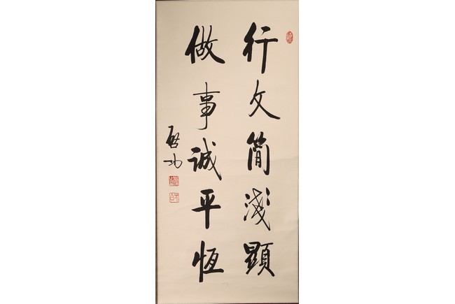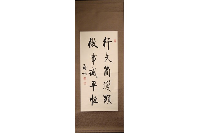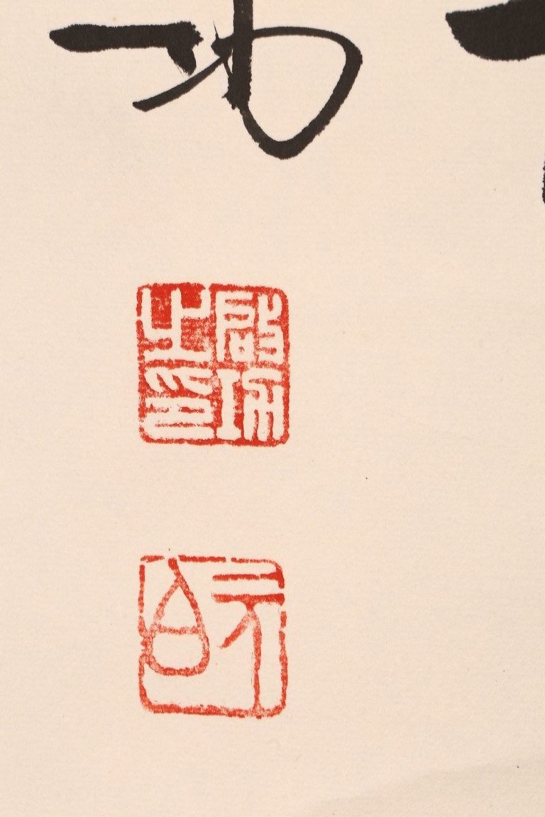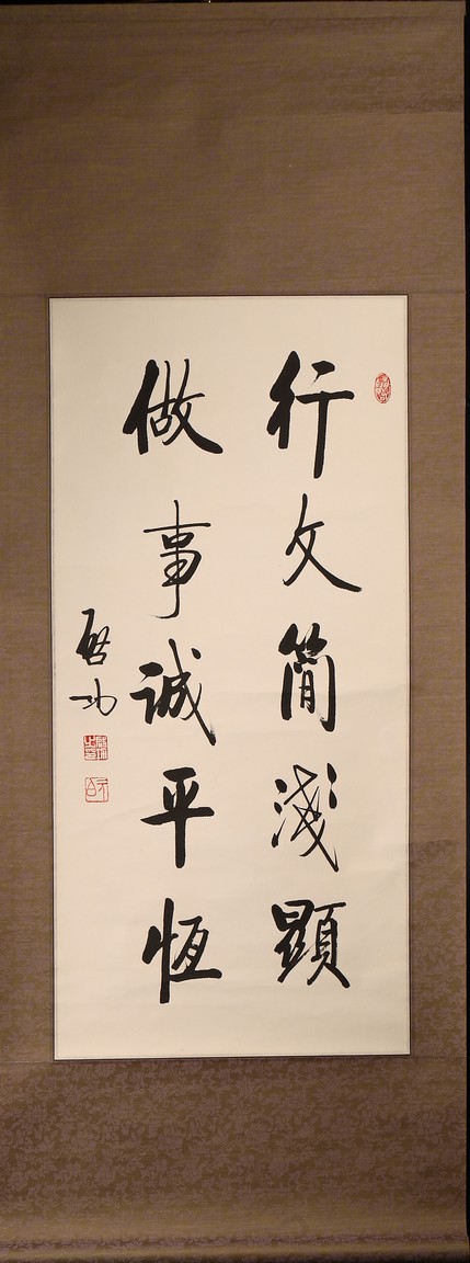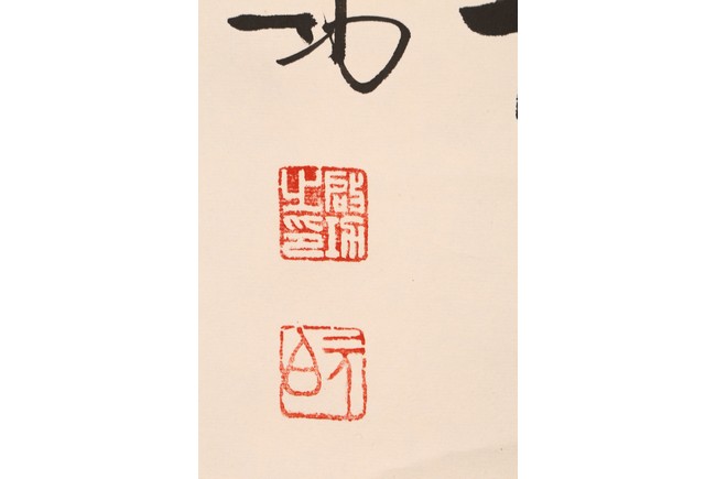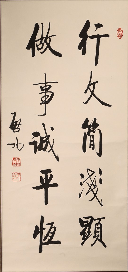 Ink on paper. Running script calligraphy. Hanging scroll. Signed Qi Gong with three seal marks of the artist.
