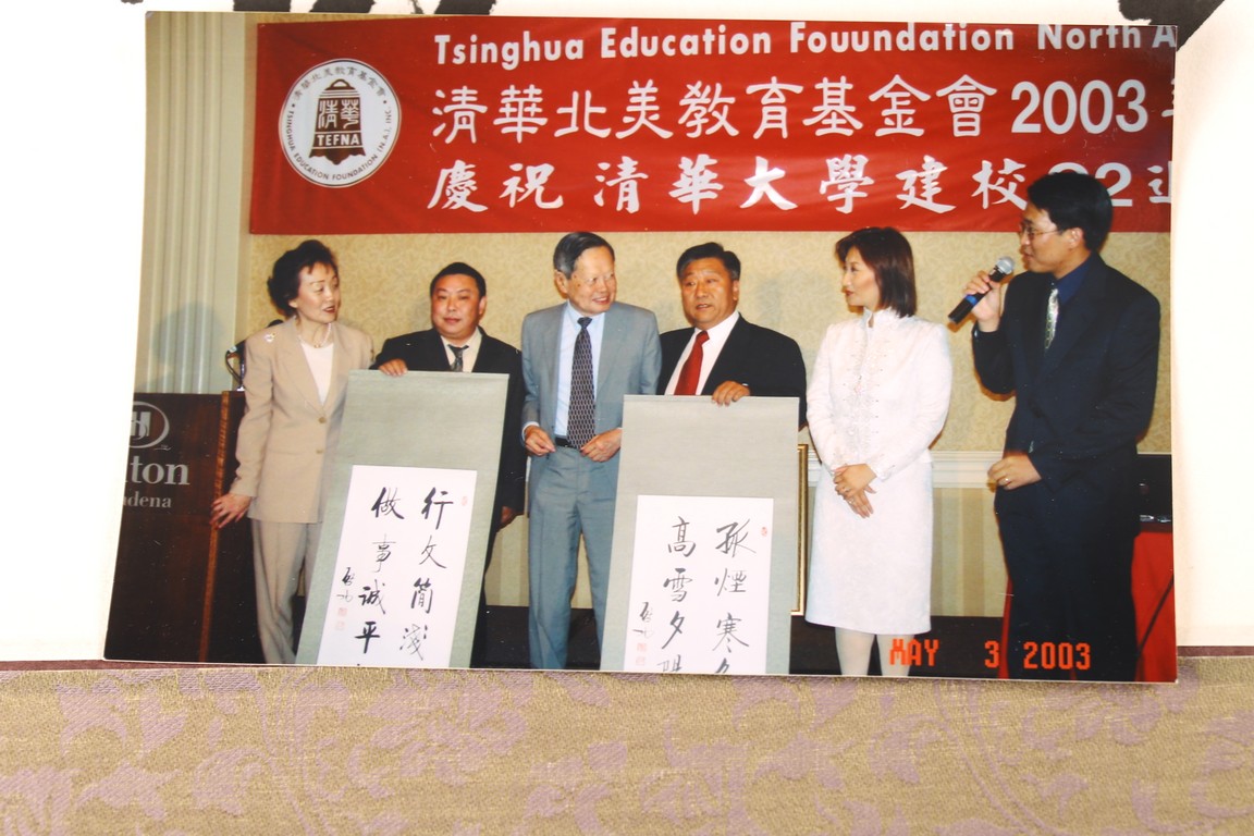 此件拍品來源為現藏家購於2003年5月在洛杉磯美國清華北美教育基金會為慶祝清華大學建校92周年而舉行的慶祝宴會,由時任清華北美教育基金會榮譽會長,著名諾貝爾獎得主楊振寧博士現場將自己所藏兩幅啟功書法拍賣,並將義賣款項捐贈給基金會。附現場照片。 注:左邊第一人為時任清華北美教育基金會會長,著名愛國人士張治中先生的女兒張素久女士,左邊第三位為楊振寧博士。來源: 原為諾貝爾獎得主楊振寧私人收藏 Provenance: This lot was purchased by the current collector from the celebration banquet held by the Tsinghua North American Education Foundation in Los Angeles in May 2003 to celebrate the 92nd anniversary of the founding of Tsinghua University. Mr. Yang Chen-Ning , the then Honorary President of the Tsinghua North American Education Foundation and the famous Nobel Prize winner, sold his personally collected two pieces of Qi Gong calligraphy in this charity sale. Note: The first person on the left is the then president of Tsinghua North America Education Foundation, Ms. Zhang Sujiu, the daughter of the famous general Mr. Zhang Zhizhong, and the third person on the left is Dr. Yang Chen-Ning.