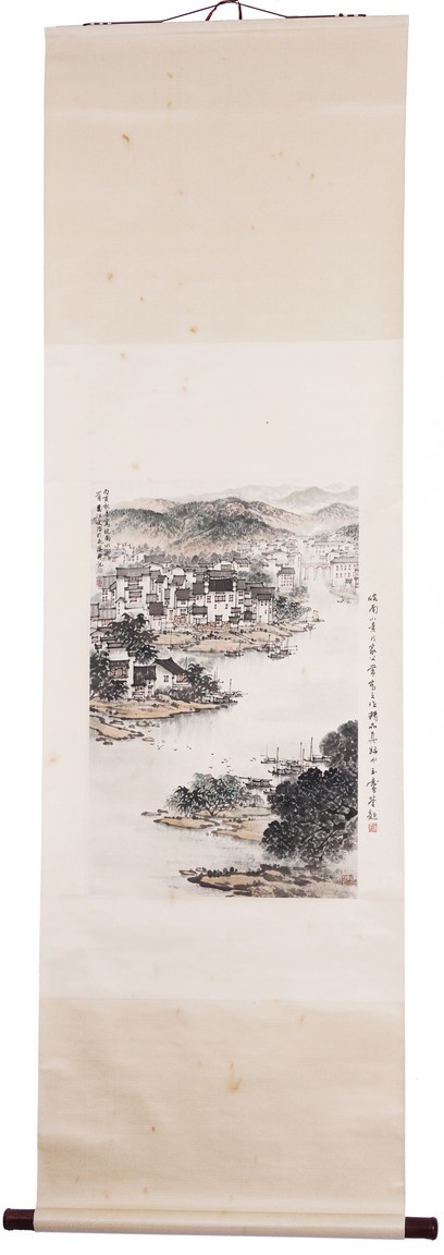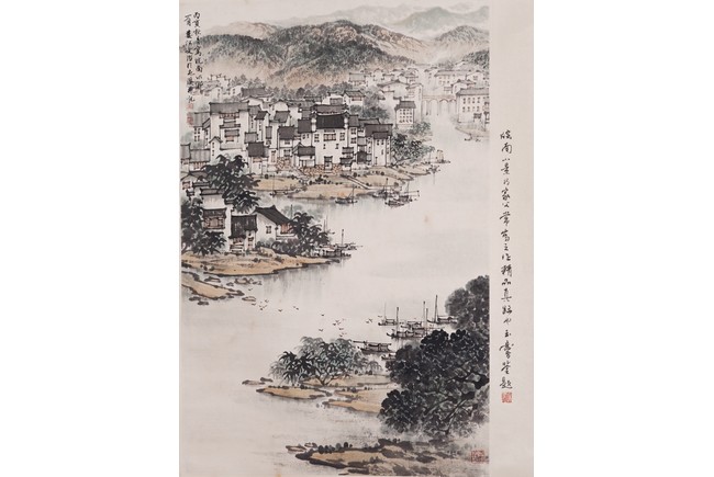 Color and ink on paper. Landscape. Inscribed and signed Wen Zhi, with two seals of the artist.