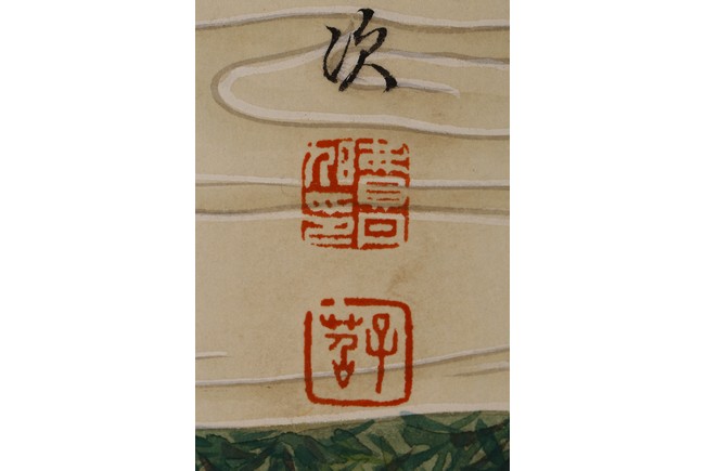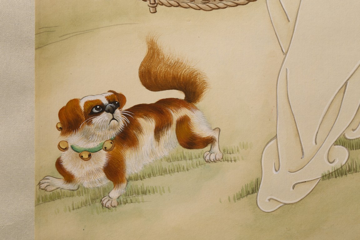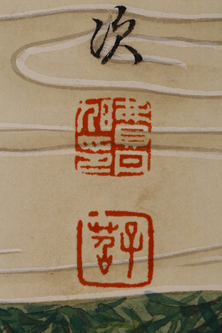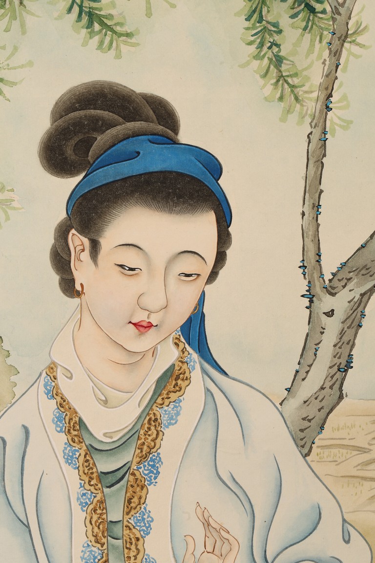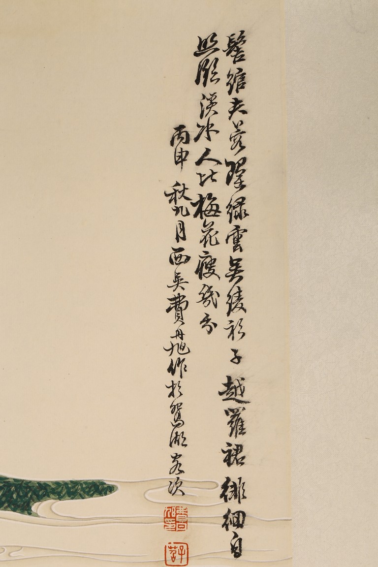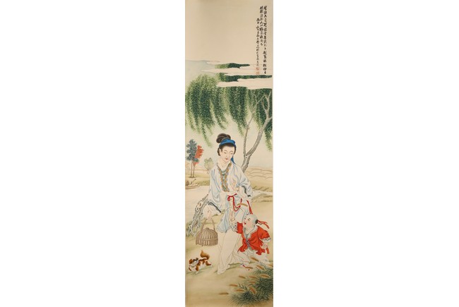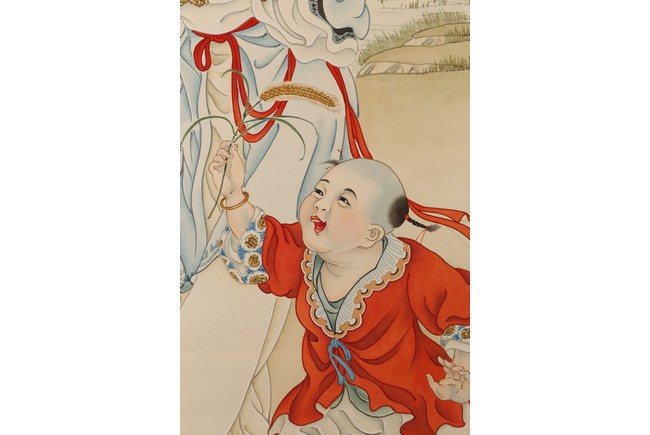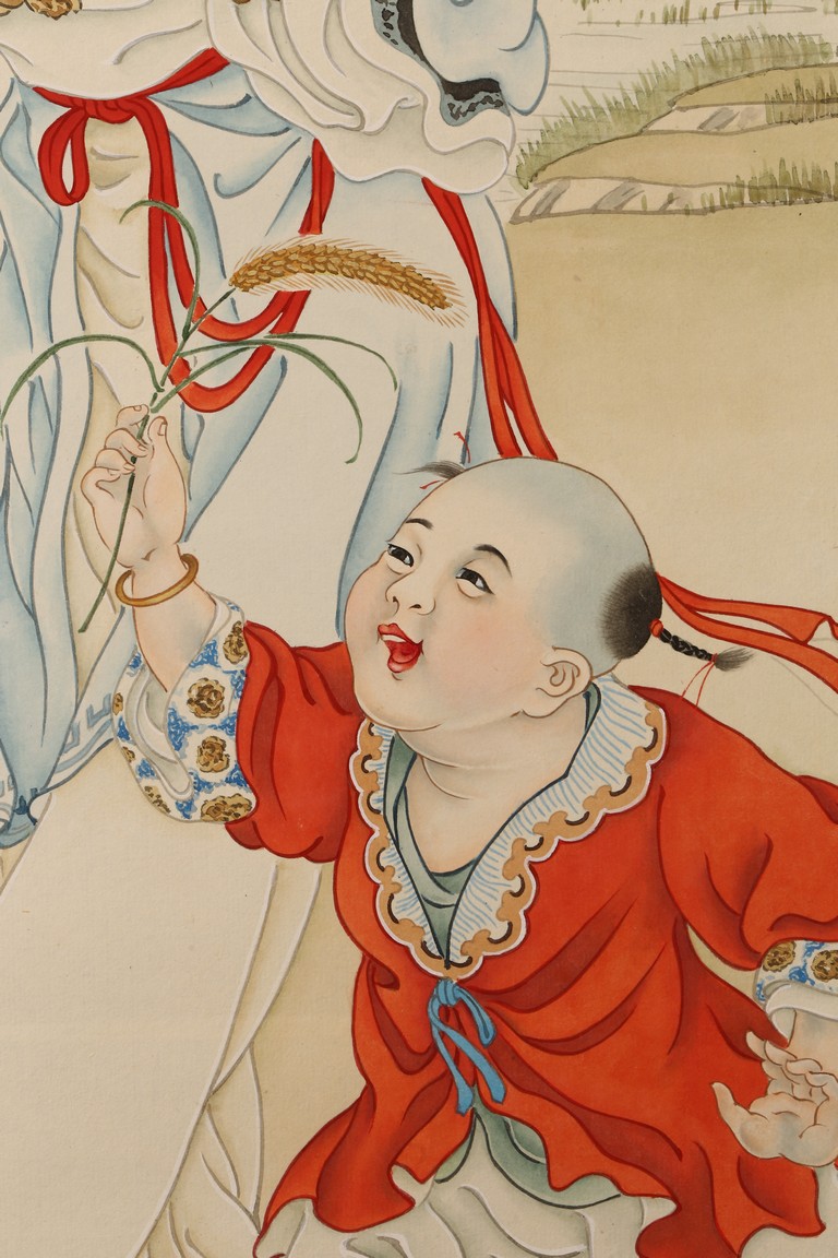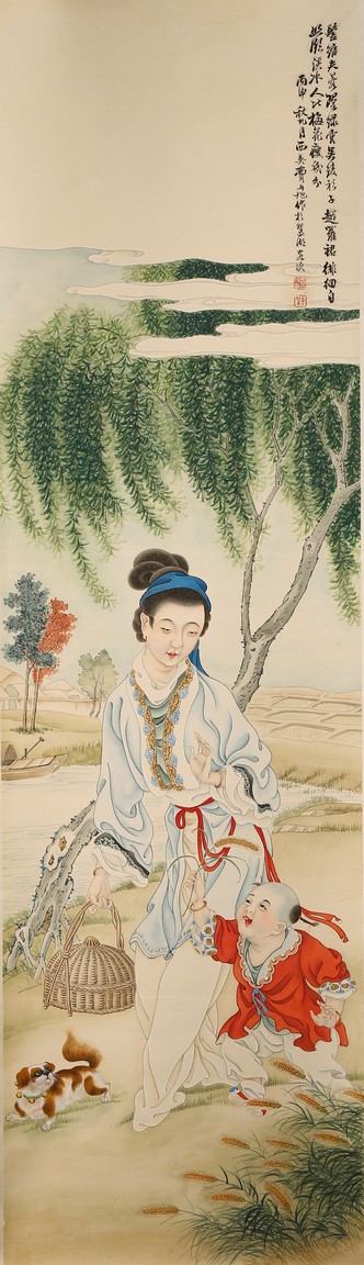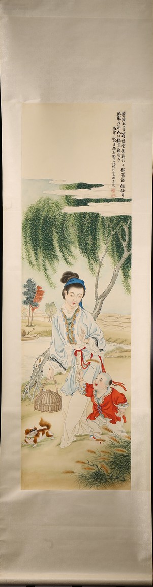 Color and ink on paper. Boy and lady. Hanging scroll. Inscribed and signed Fei Danxu, with two seal marks of the artist.