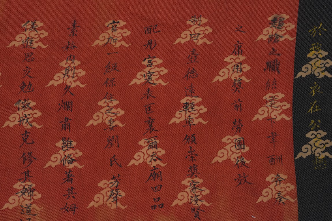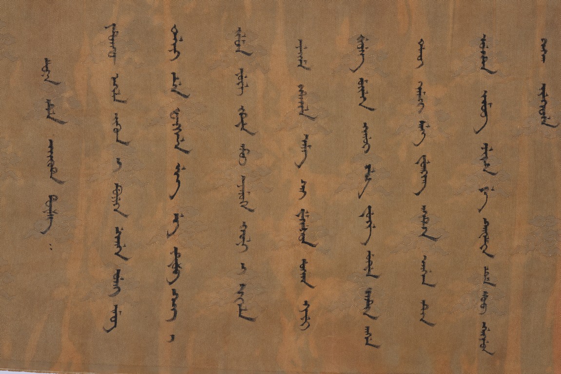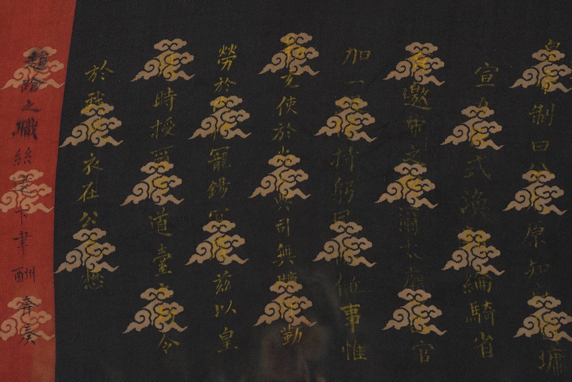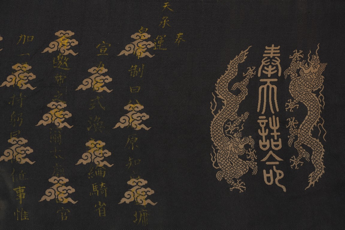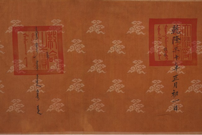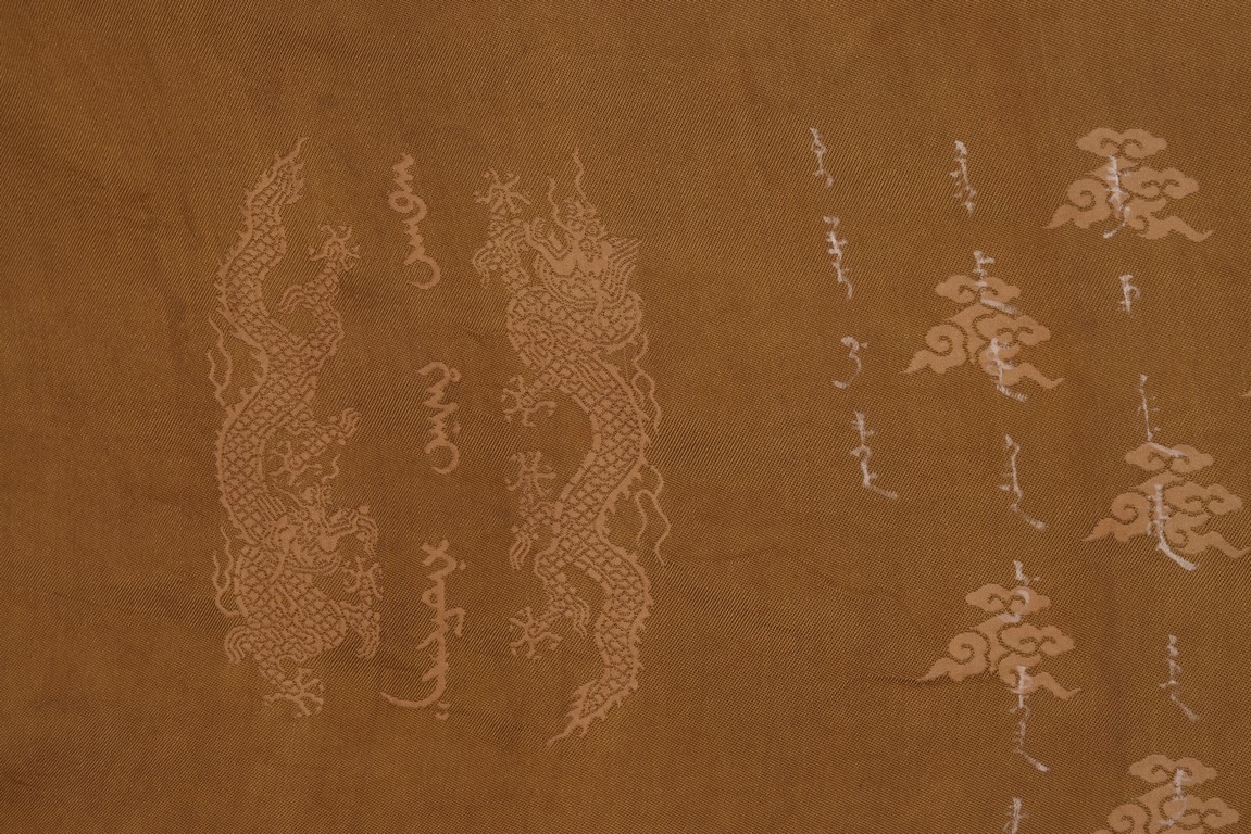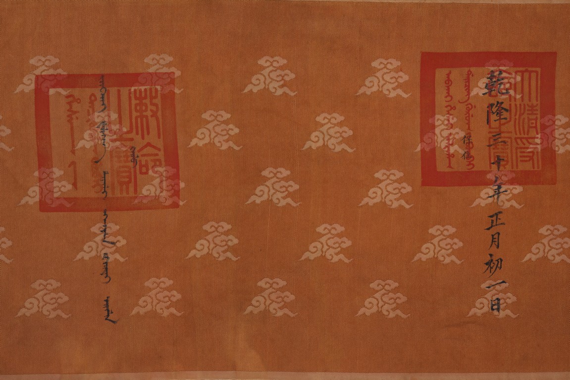 Qing Dynasty Qianlong period. Written in gilt and ink on a woven silk brocade, the edict text arranged in standard form reading from right to left in kaishu (regular script) and repeated in Manchu script reading from left to right, and dated to 30th year of Qianlong reign (1765).