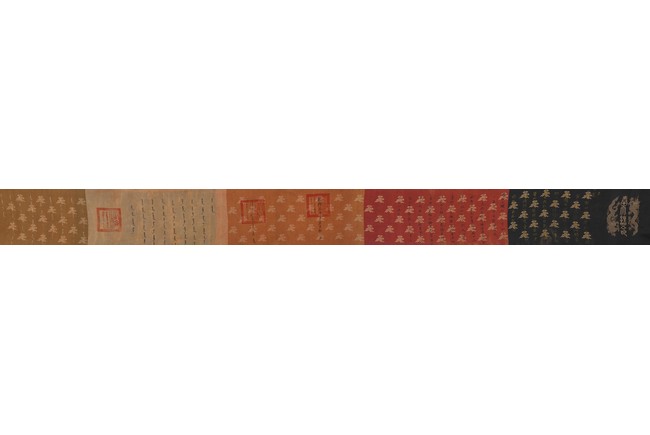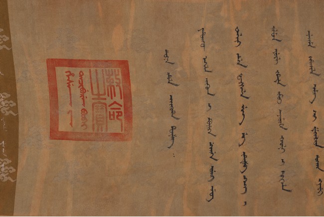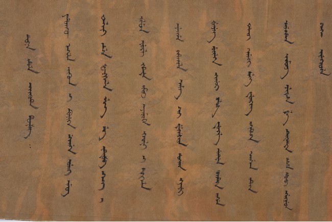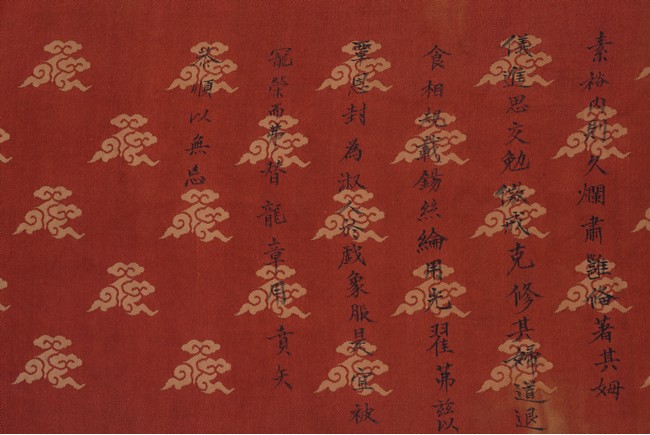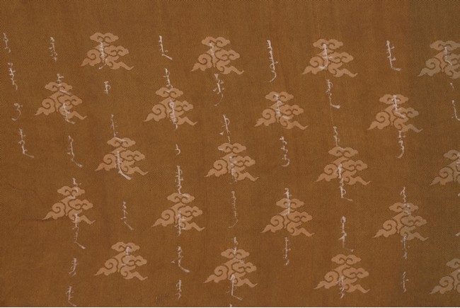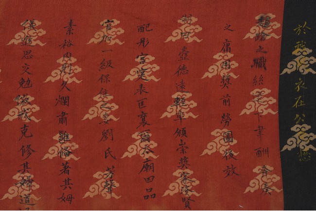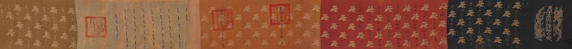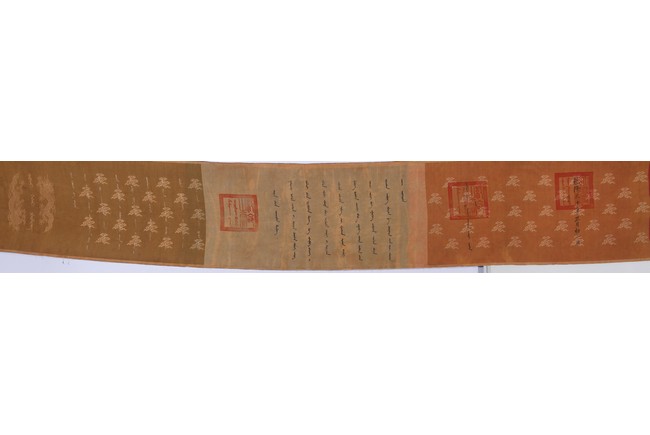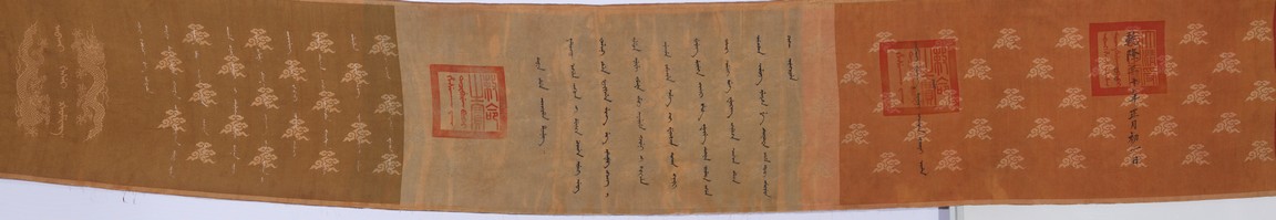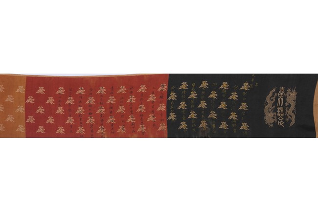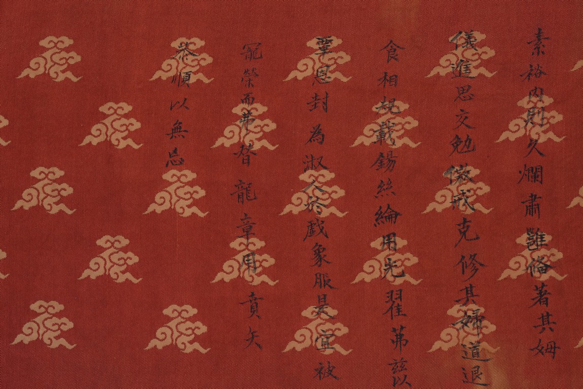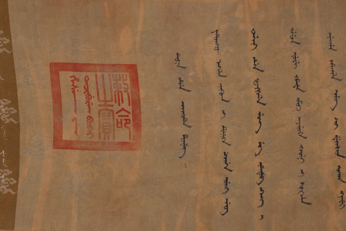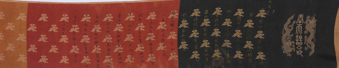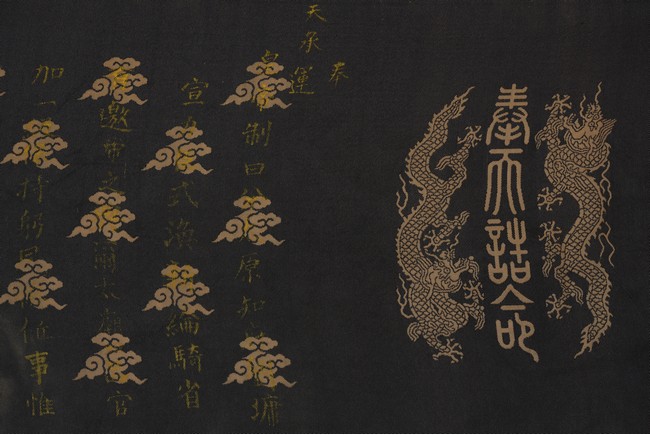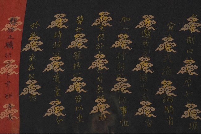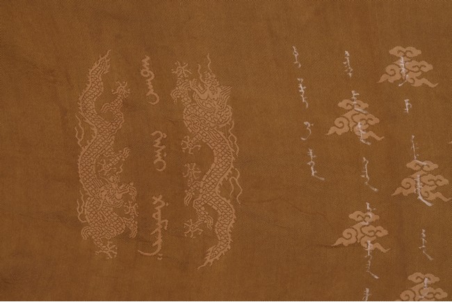 Qing Dynasty Qianlong period. Written in gilt and ink on a woven silk brocade, the edict text arranged in standard form reading from right to left in kaishu (regular script) and repeated in Manchu script reading from left to right, and dated to 30th year of Qianlong reign (1765).