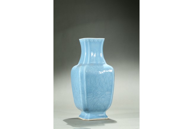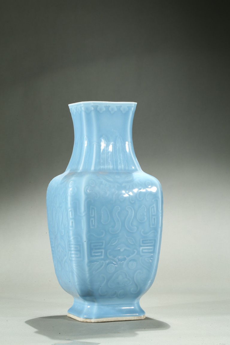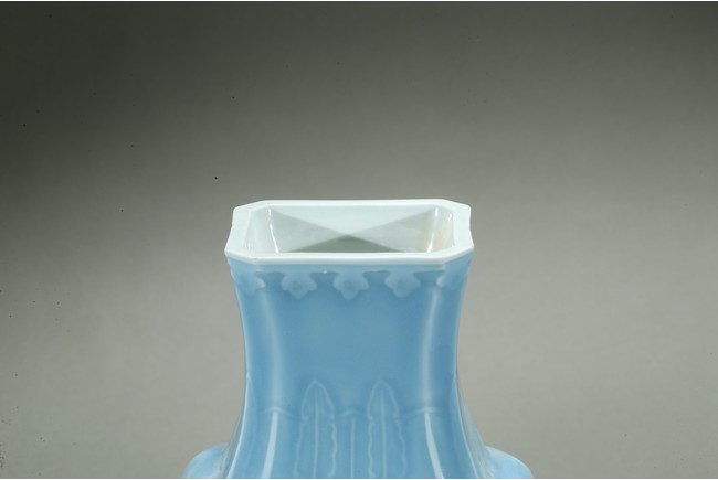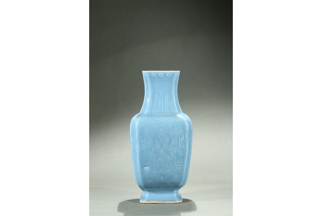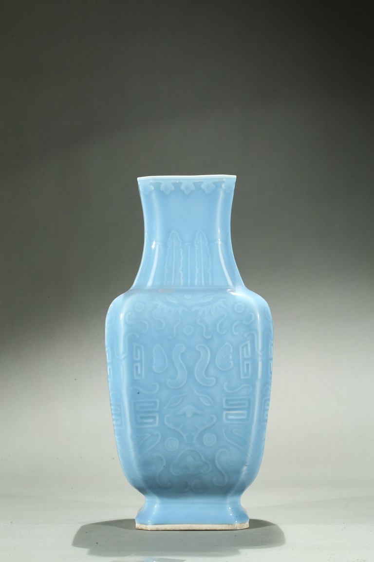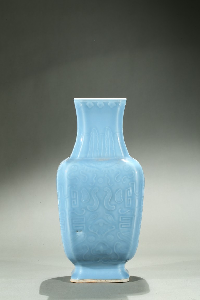 The rectangular body moulded with stylized archaic taotie masks, the waisted neck with overlapping plantain leaves, all covered in attractive pale blue glaze, the base impressed with six character Qianlong mark. Qing Dynasty period.