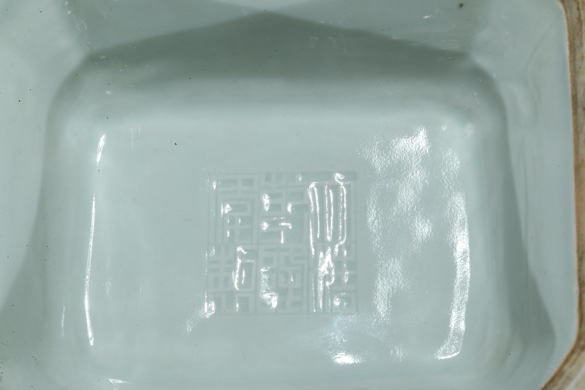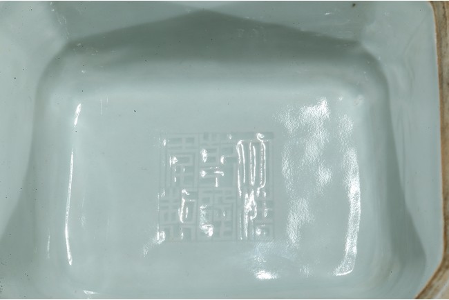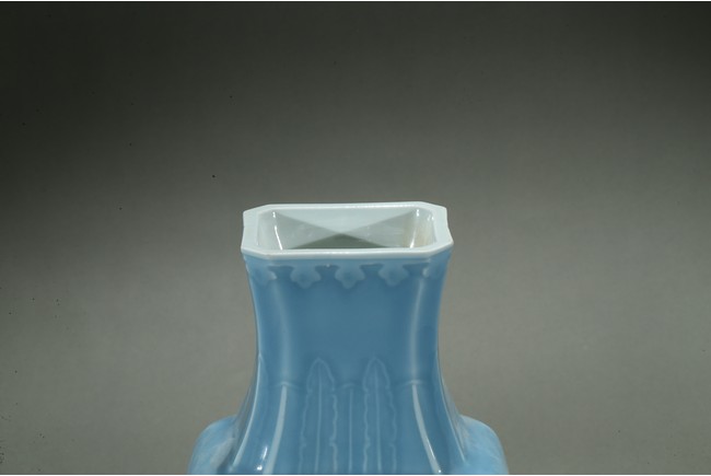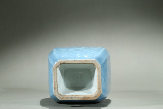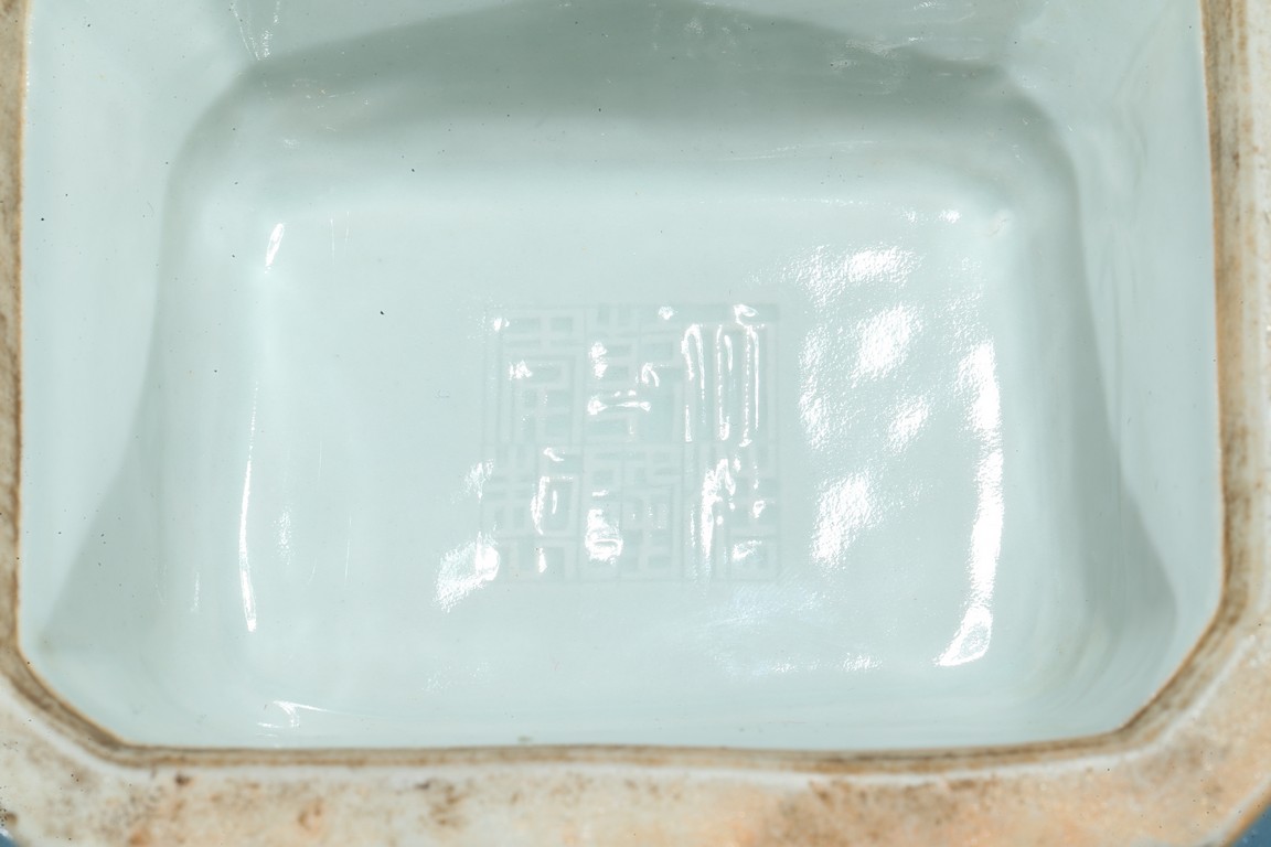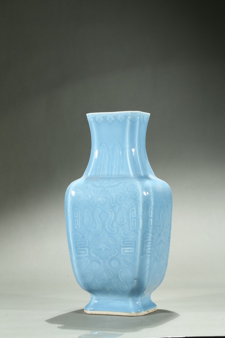 The rectangular body moulded with stylized archaic taotie masks, the waisted neck with overlapping plantain leaves, all covered in attractive pale blue glaze, the base impressed with six character Qianlong mark. Qing Dynasty period.