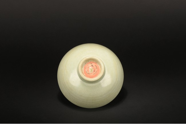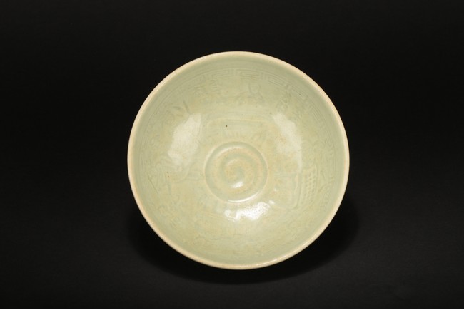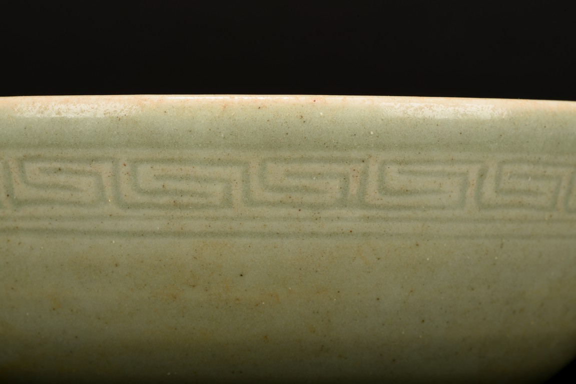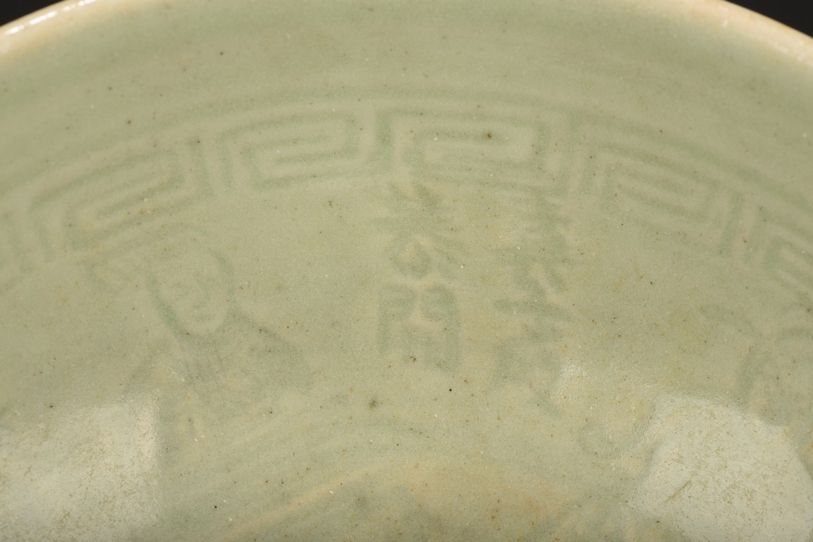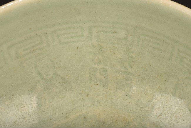With deep rounded sides supported on a straight short foot, close to the mouth rim finely decorated with key-fret band, the interior with a central spiral medallion surrounded by stylized characters and figures pattern beneath the key-fret band, overall covered in a celadon green glaze. Qing Dynasty period.
