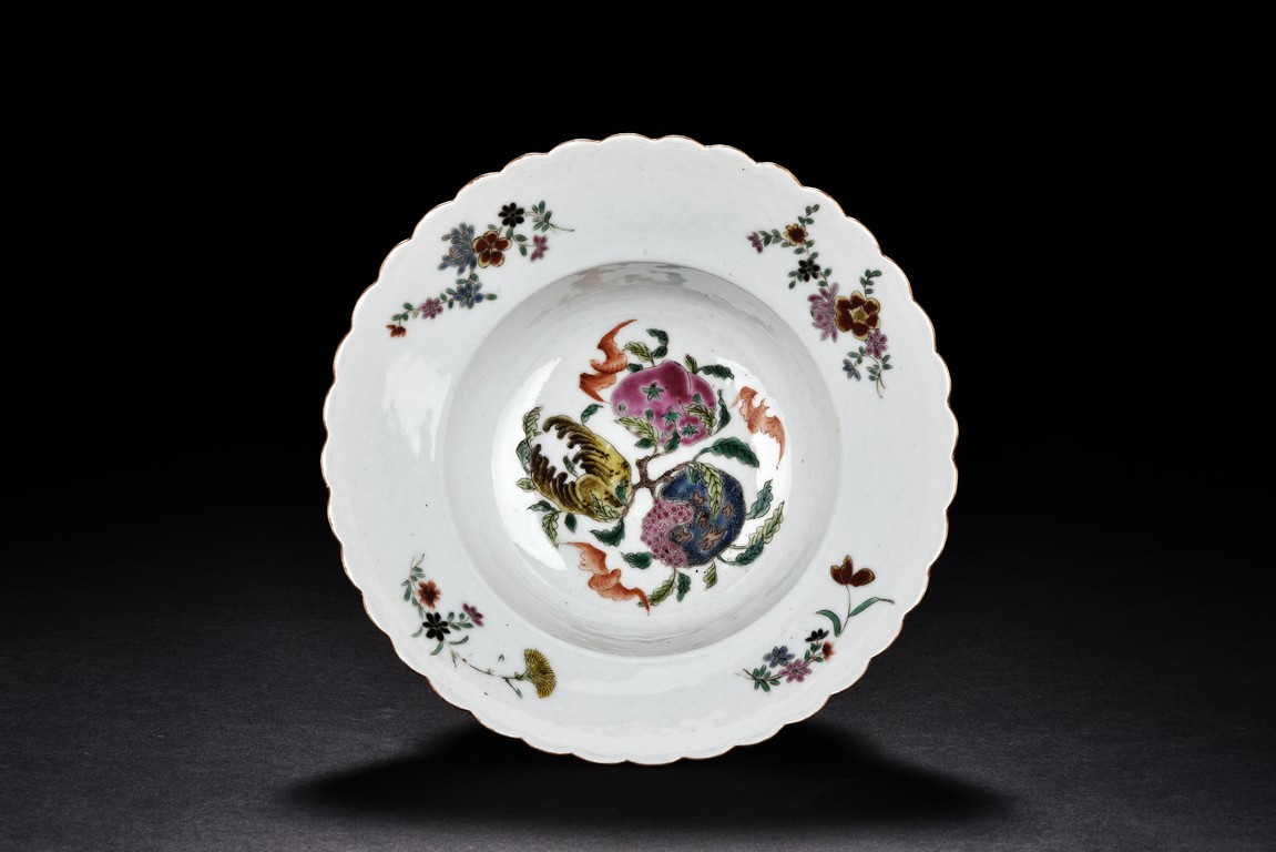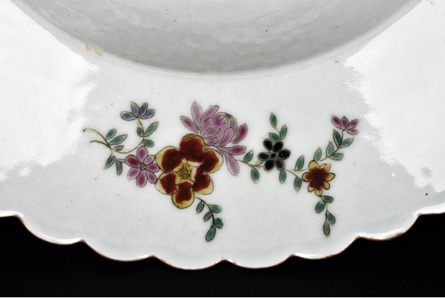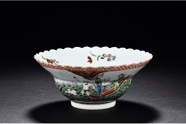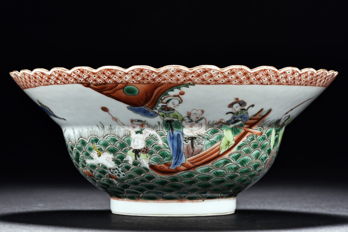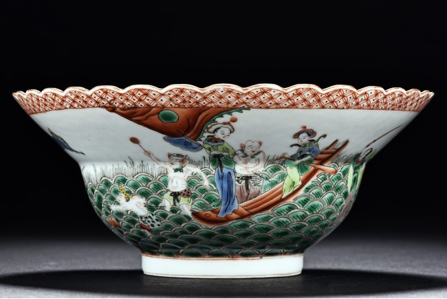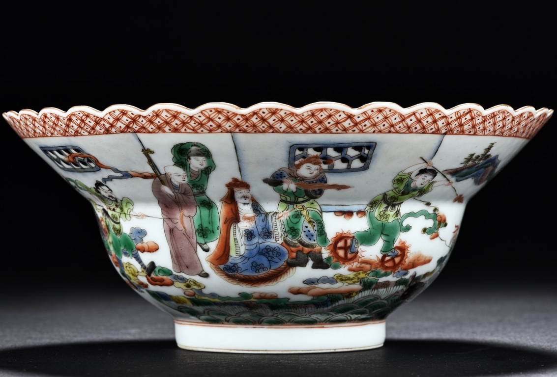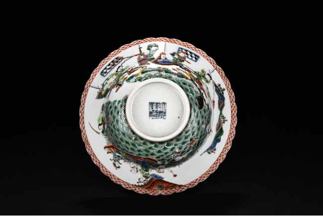 Qing Dynasty period. Potted with sides rising to widely flared rim, the body finely enamelled with continuous scene of historical stories, the bottom bears apocryphal six character 'Qianlong' mark.