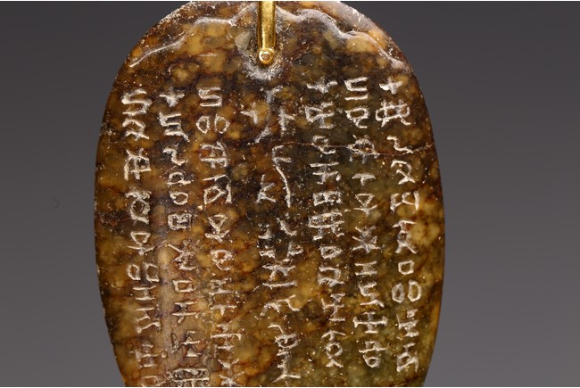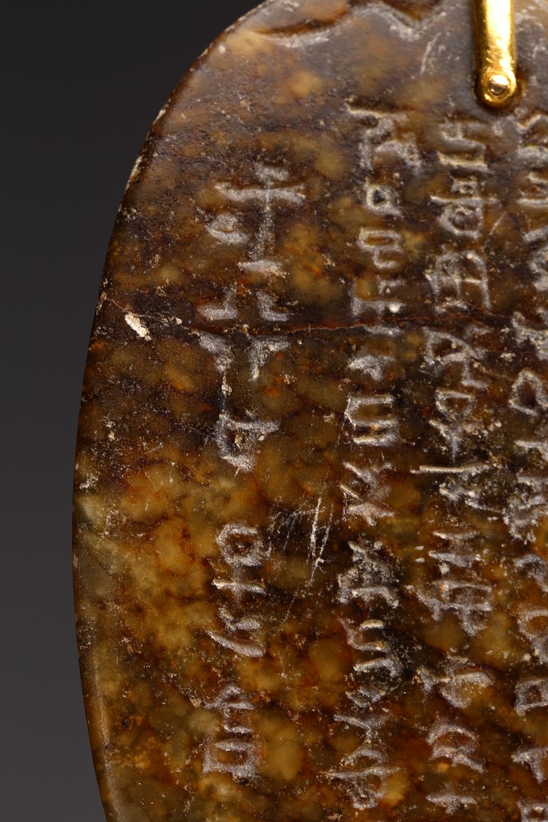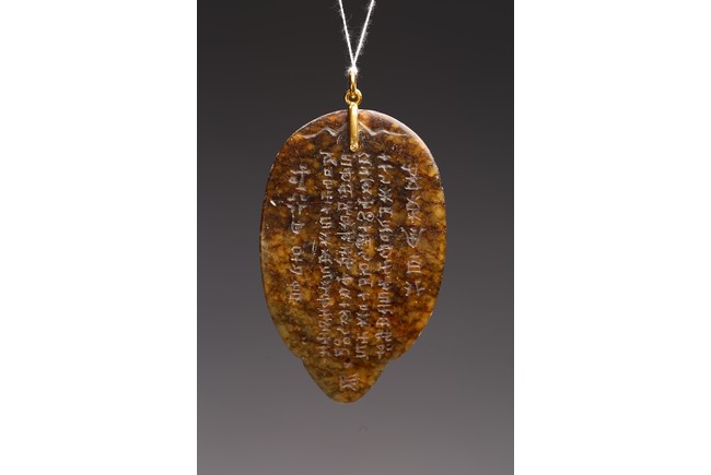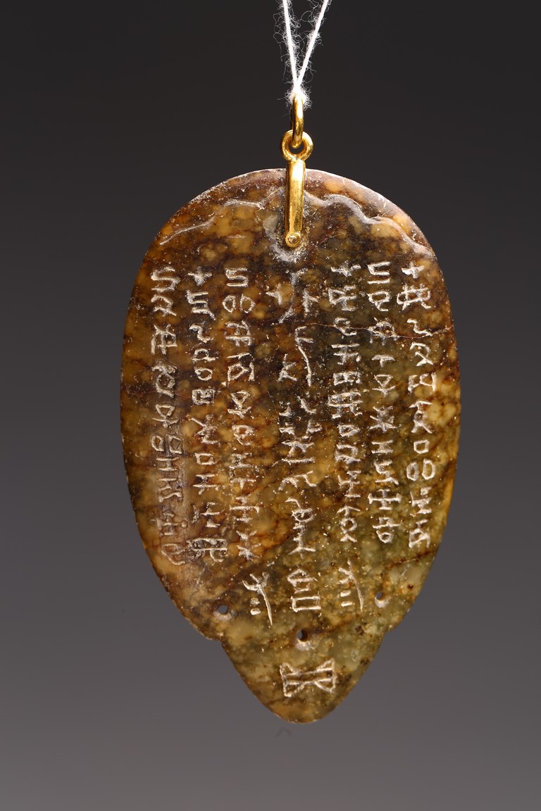 Of flattened shape, the leaf shaped pendant inscribed in archaic inscriptions on both sides.