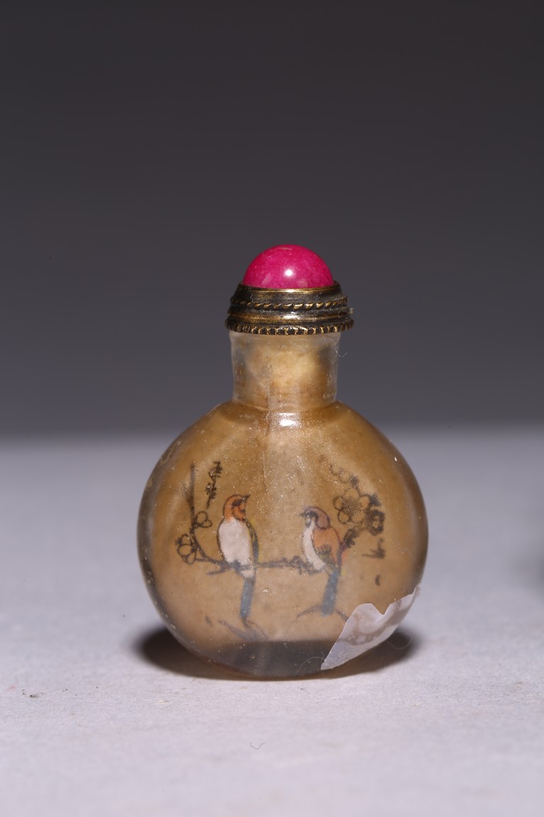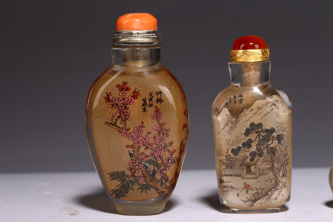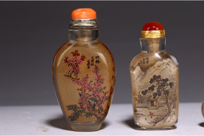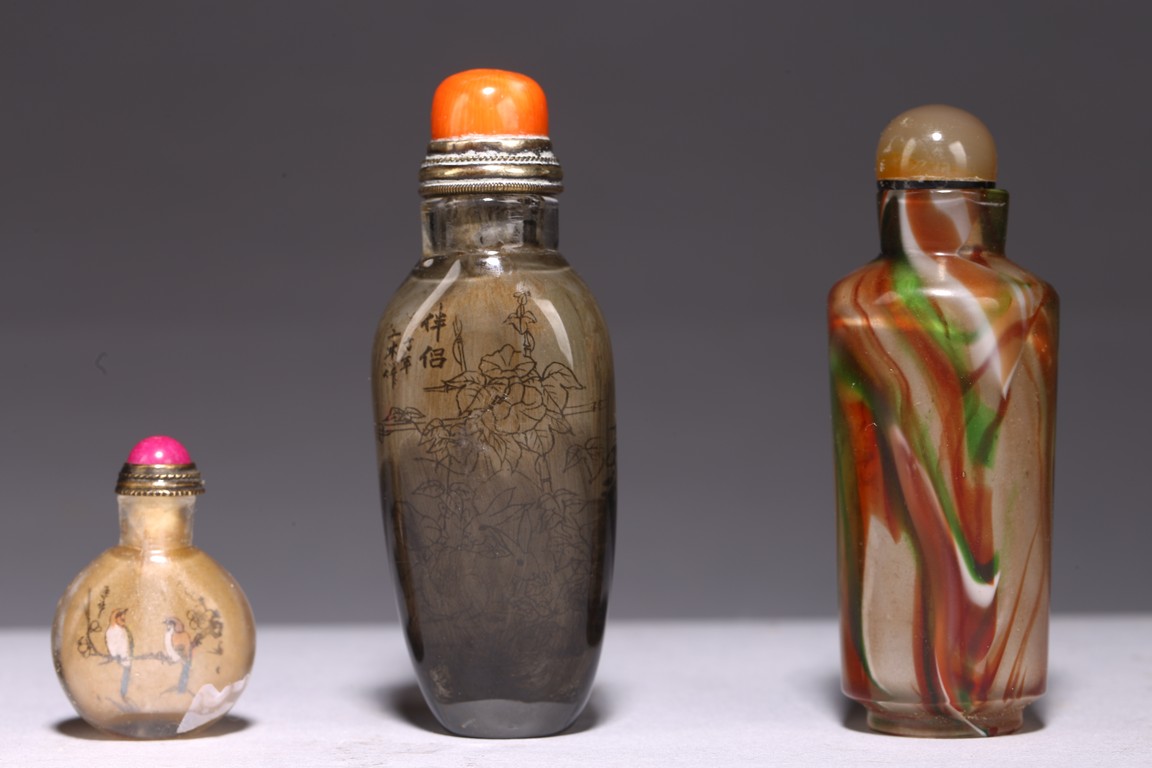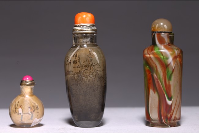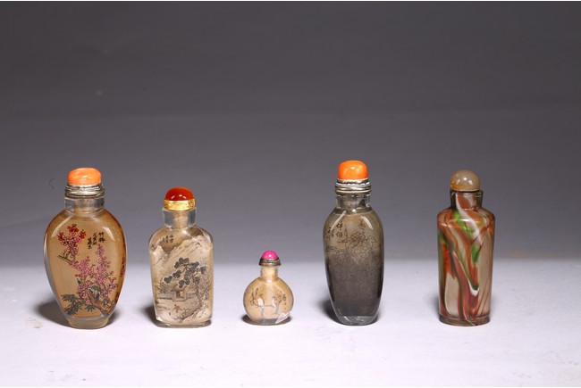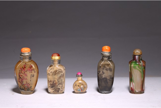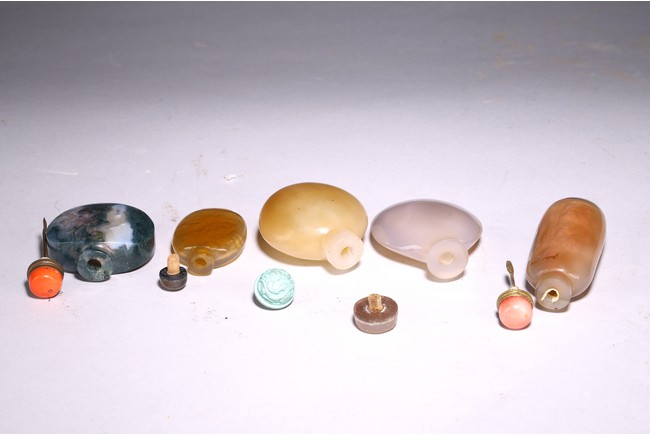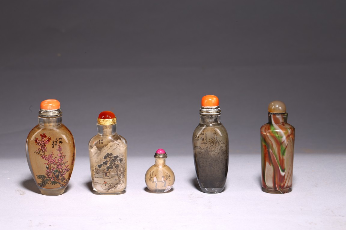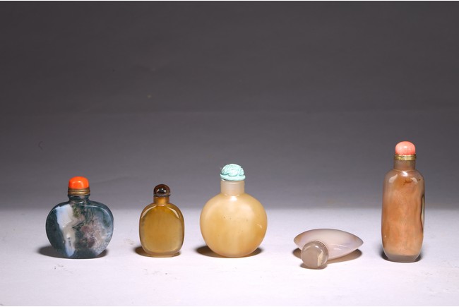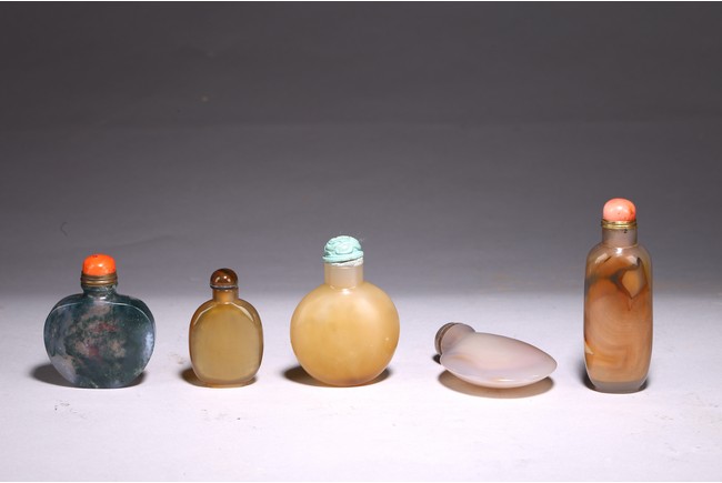 Qing Dynasty period. A group of five agate snuff bottles in various materials and sizes.