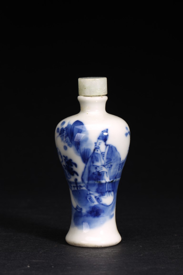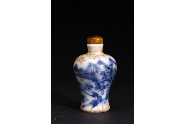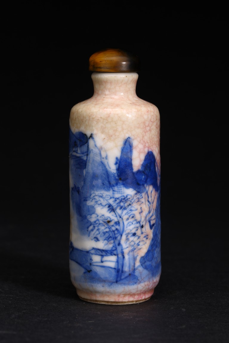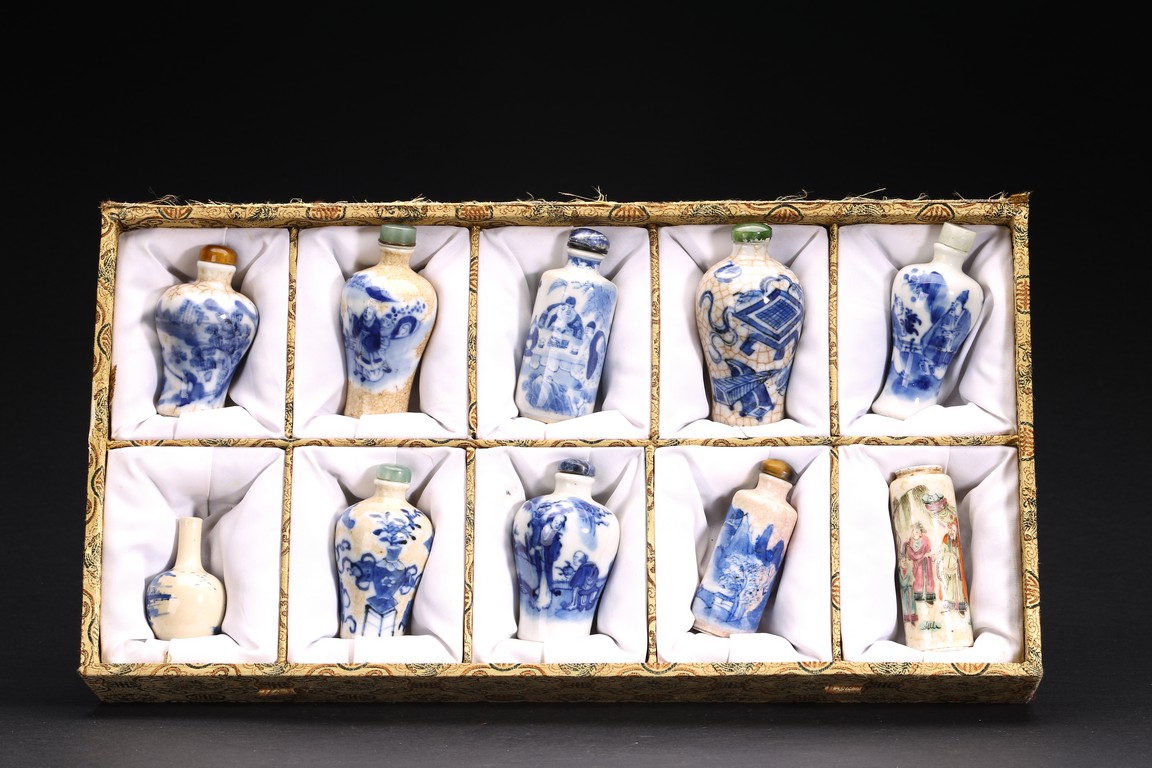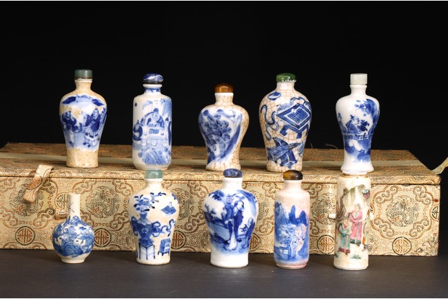 Qing Dynasty period. Consisting of nine blue and white snuff bottles and a famille rose snuff bottle.