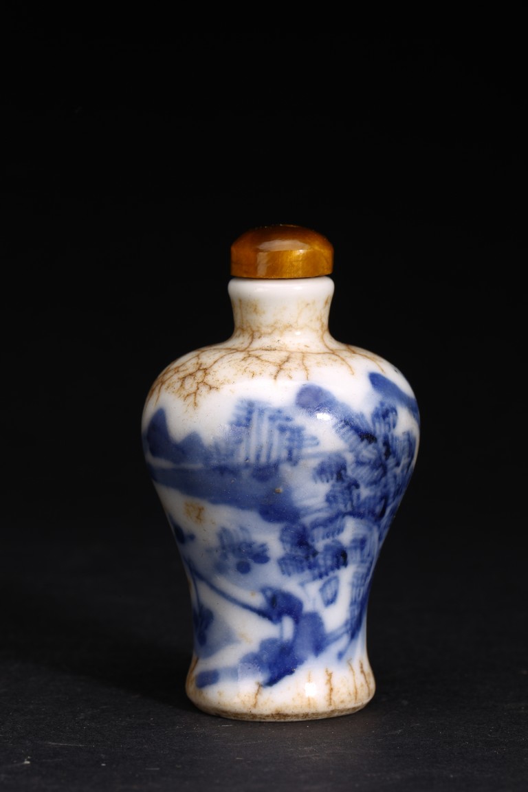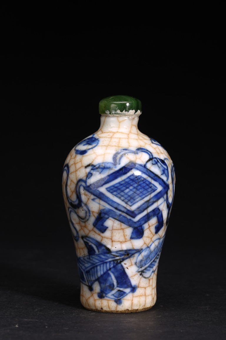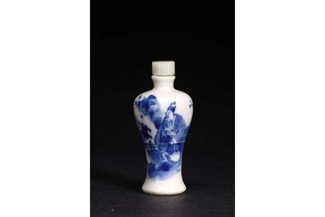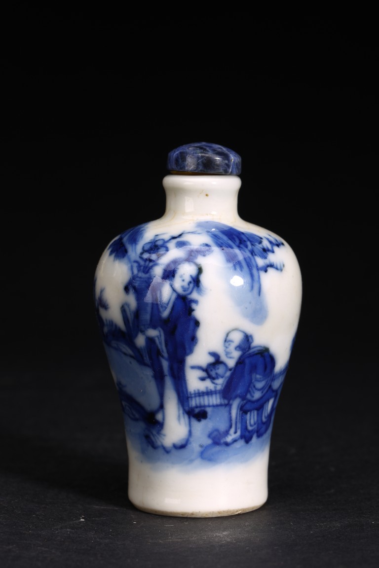 Qing Dynasty period. Consisting of nine blue and white snuff bottles and a famille rose snuff bottle.