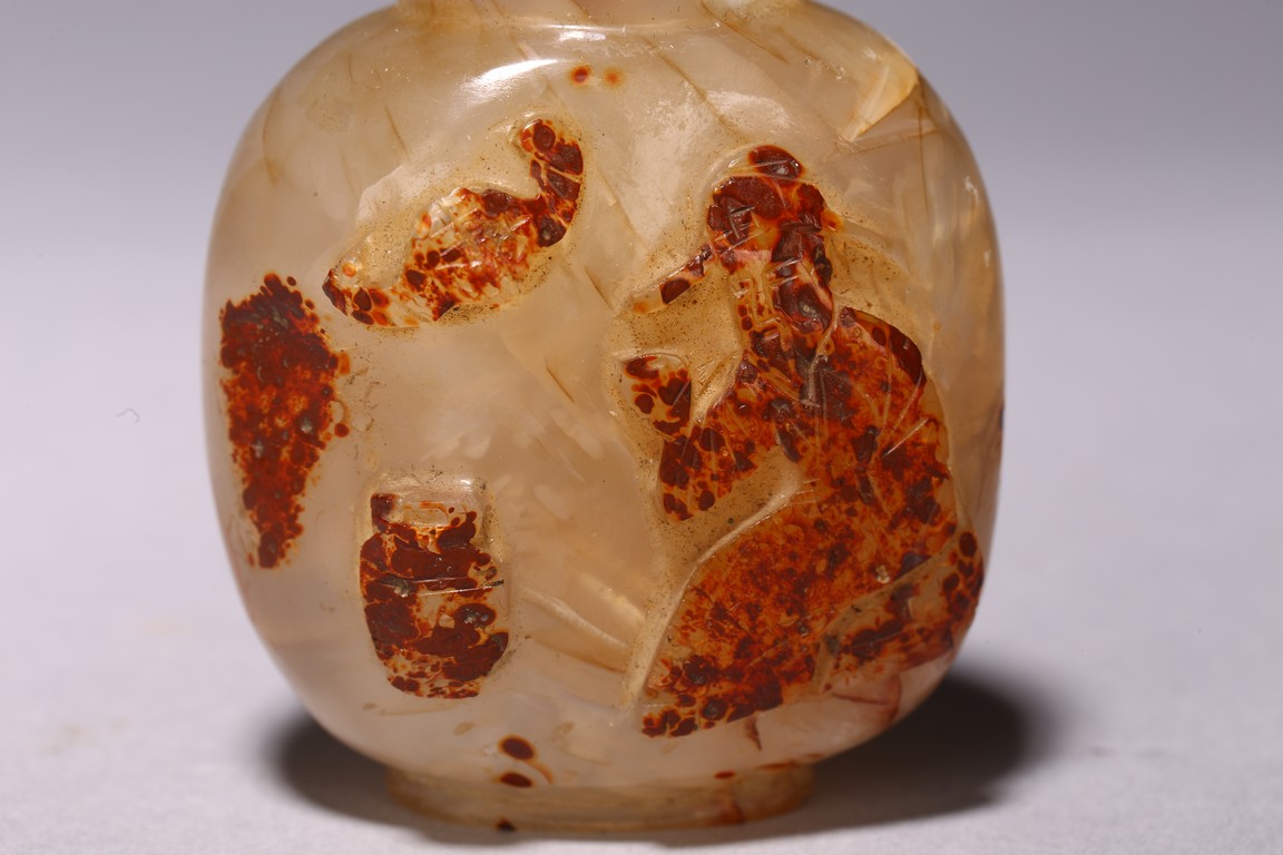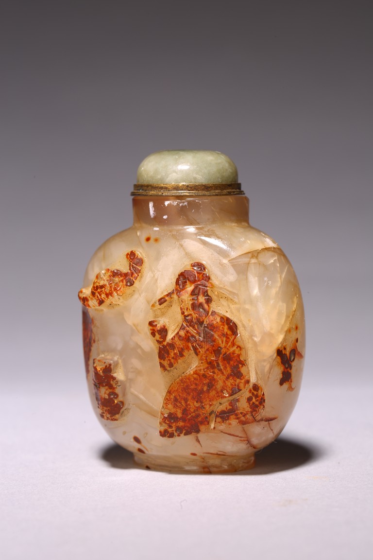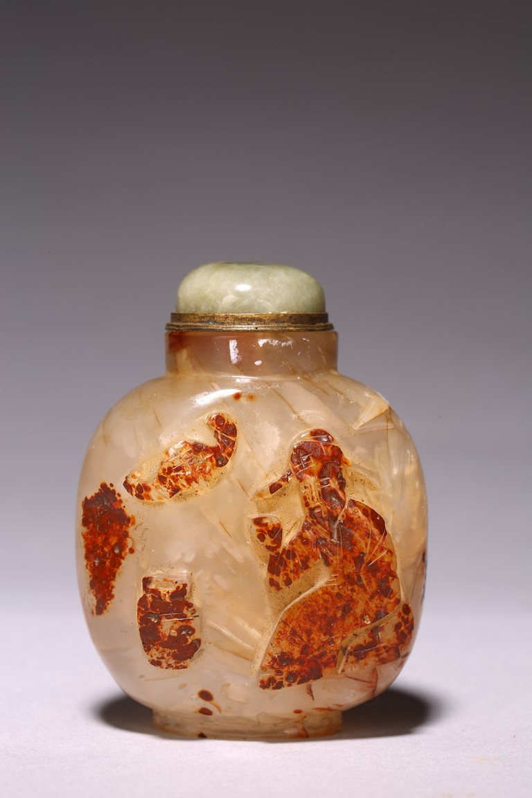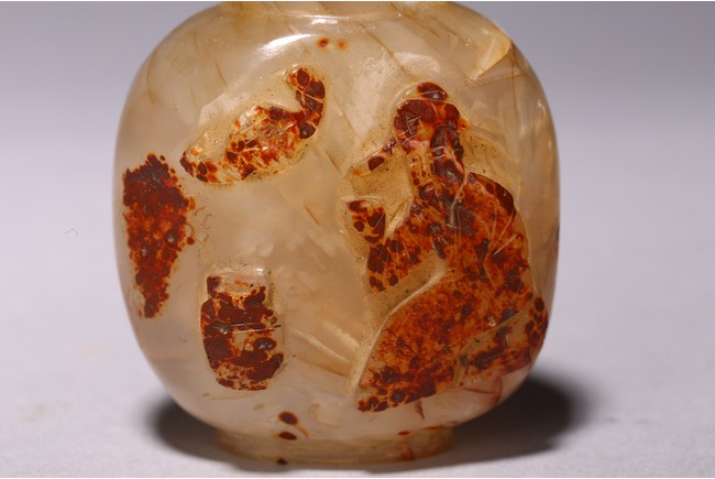 Qing Dynasty period. The flattened globular body cleverly carved in low relief using the beige layer to depict an scholar drinking in front of a flying bat.