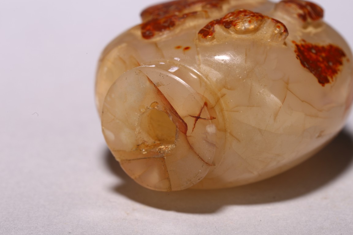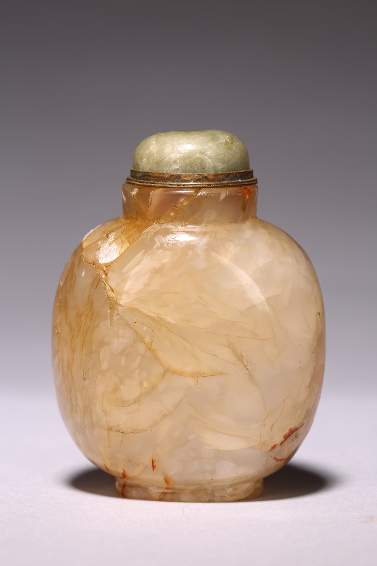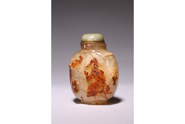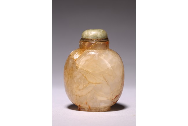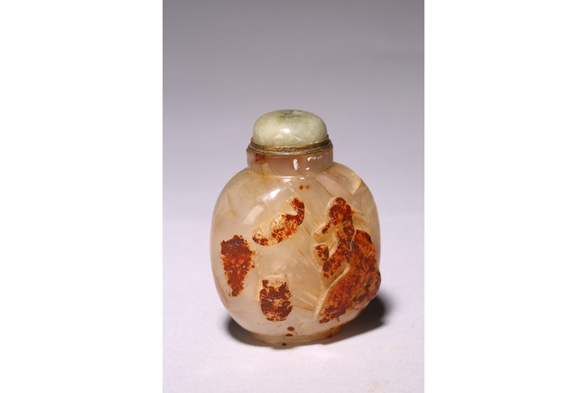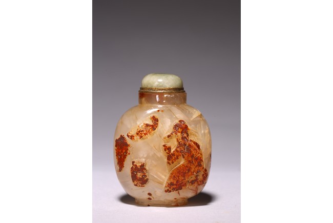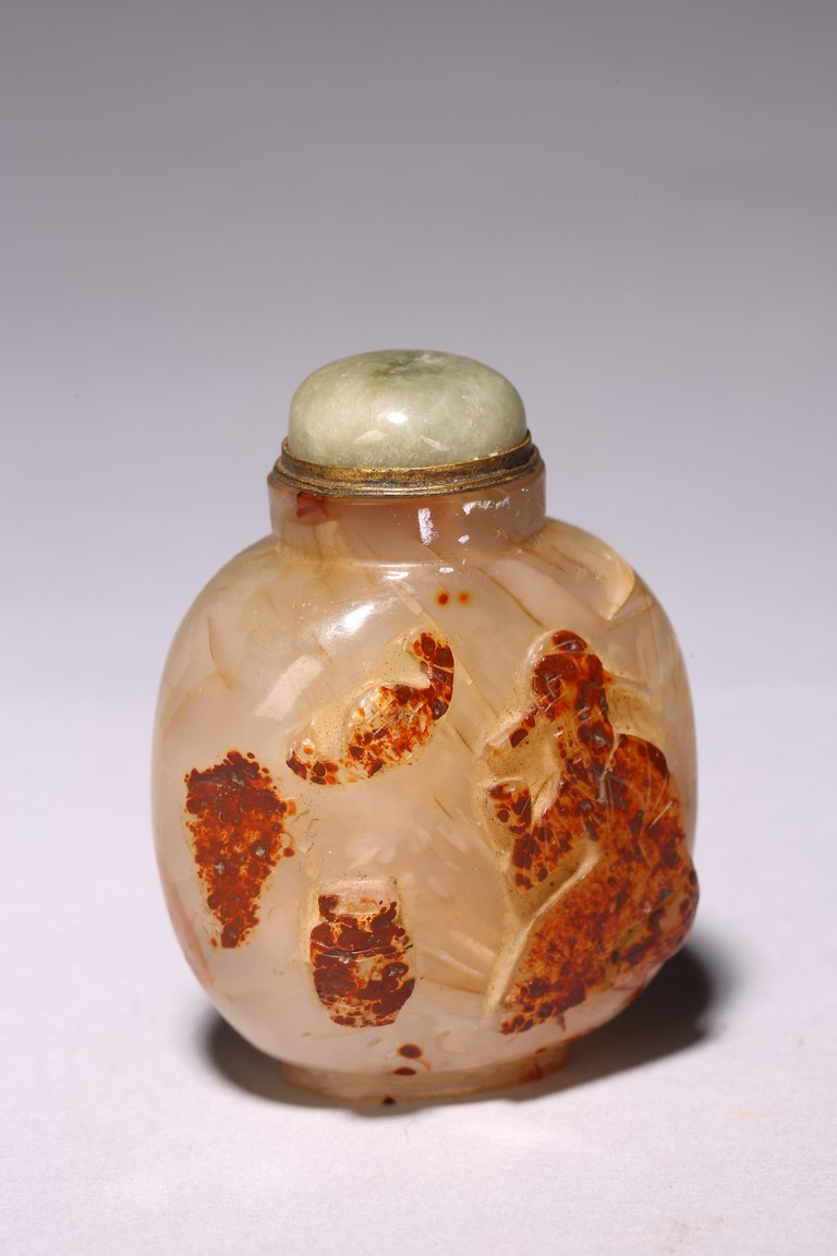 Qing Dynasty period. The flattened globular body cleverly carved in low relief using the beige layer to depict an scholar drinking in front of a flying bat.