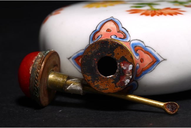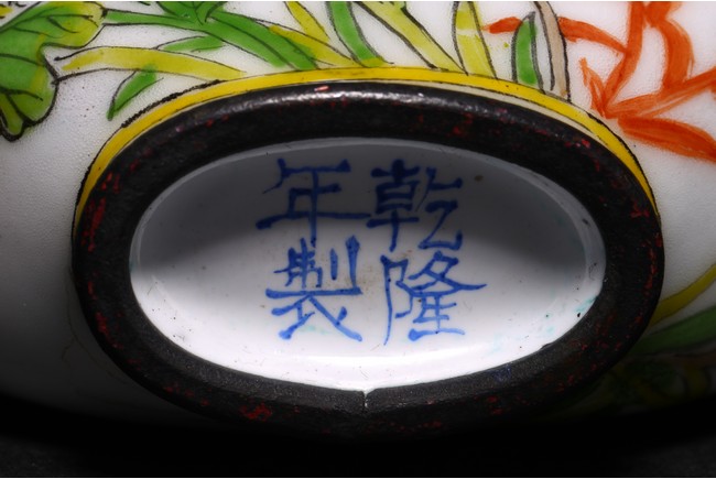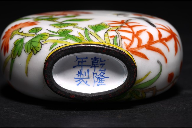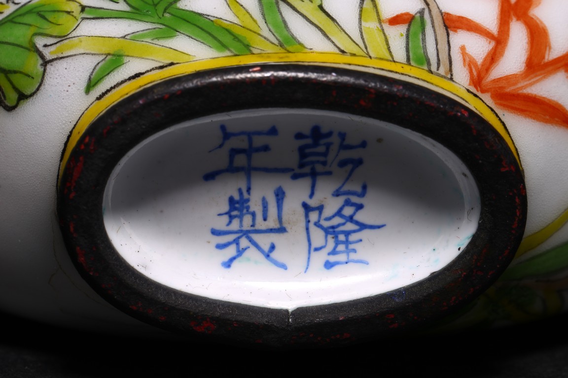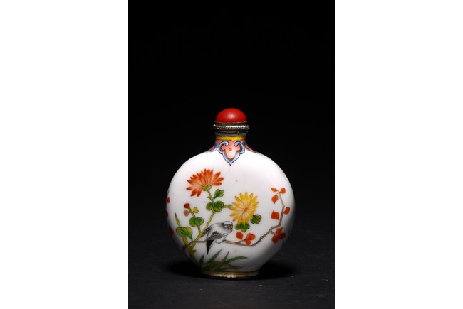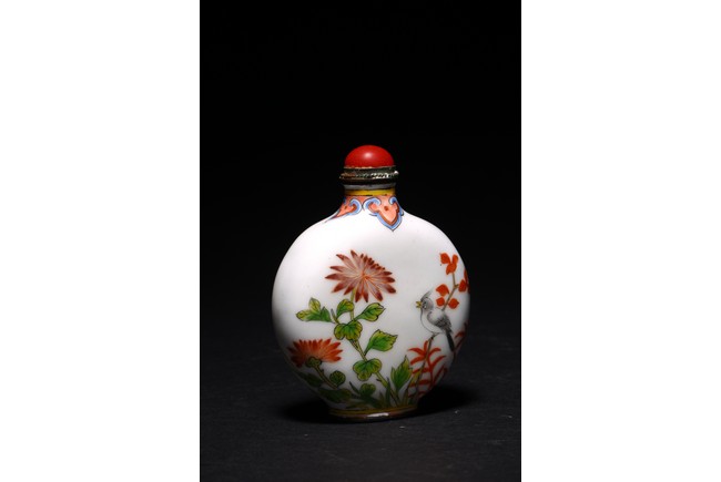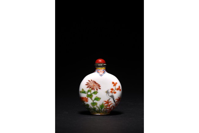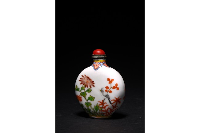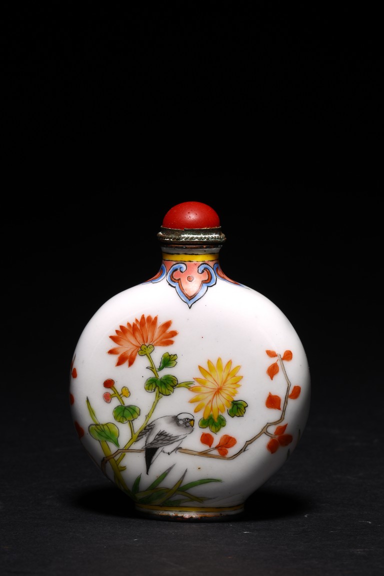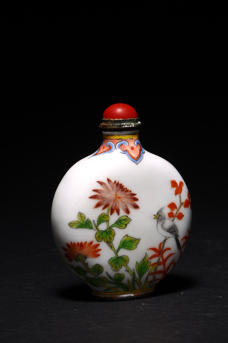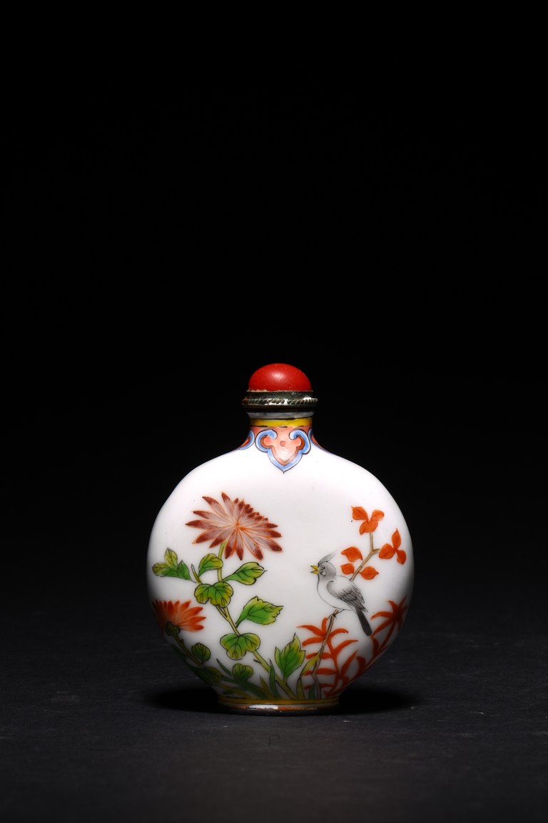 A WHITE GLASS ENAMELLED SNUFF BOTTLE 料器加彩鼻煙壺