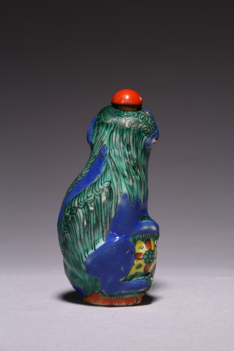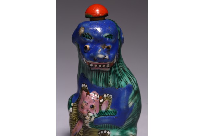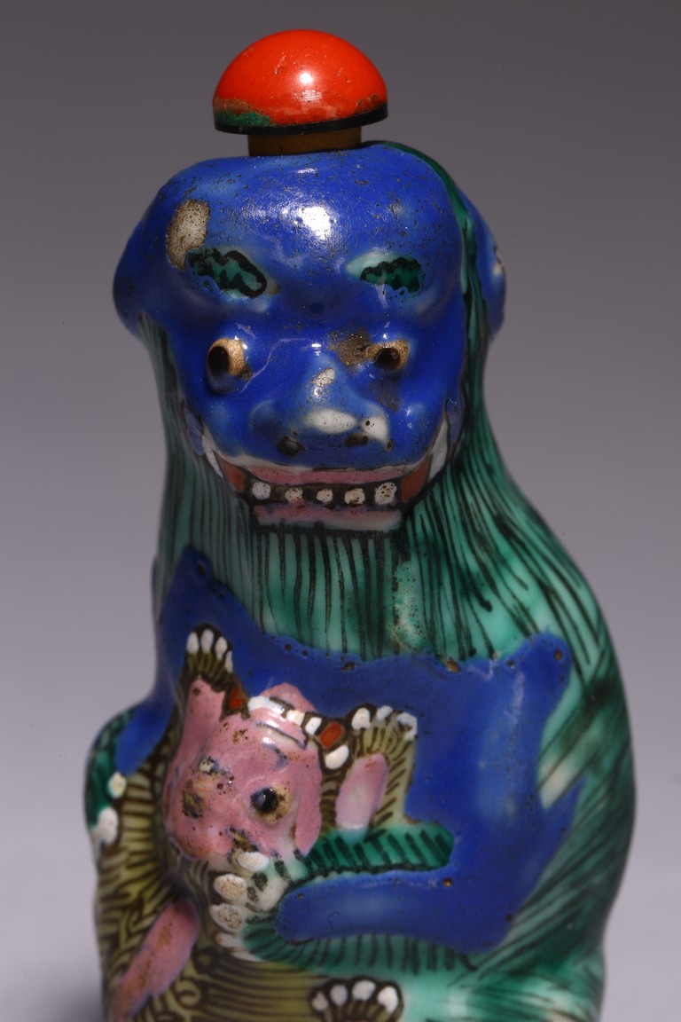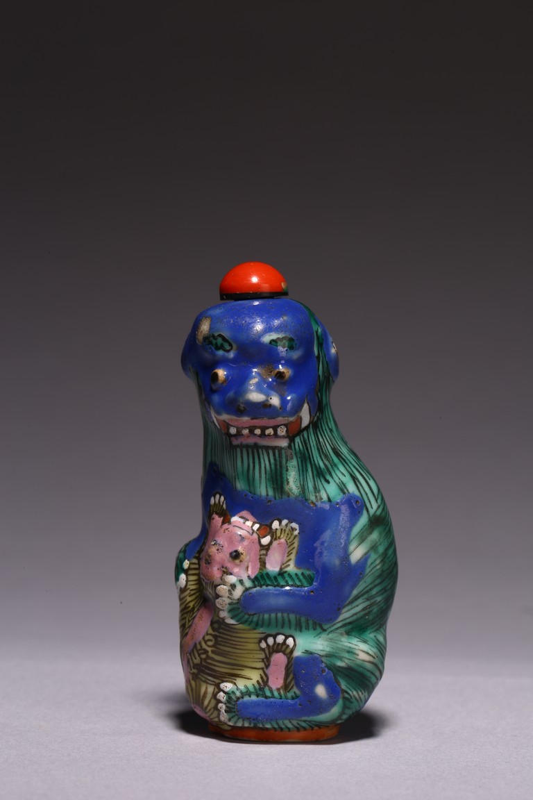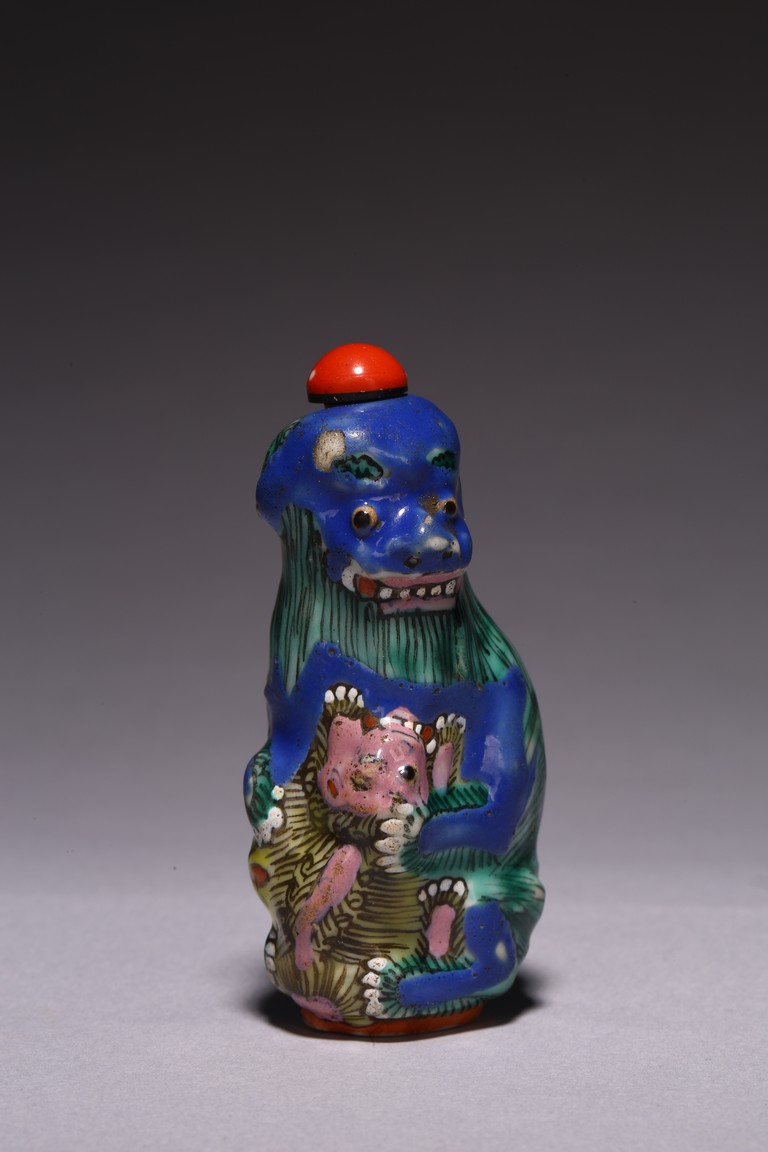 Qing Dynasty period. Modelled in the form of a larger buddhist lions hugging the lion cub, with coral stopper.