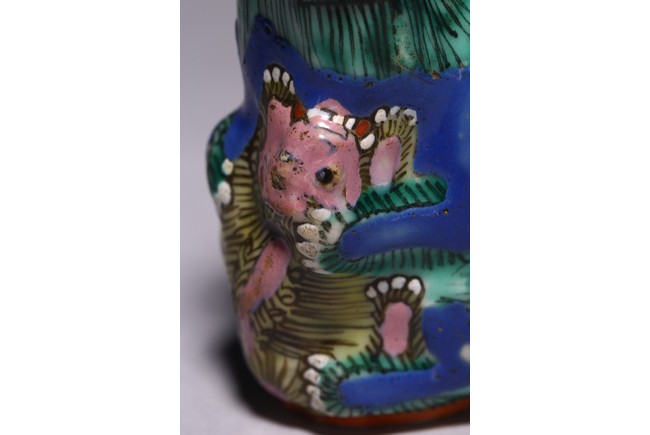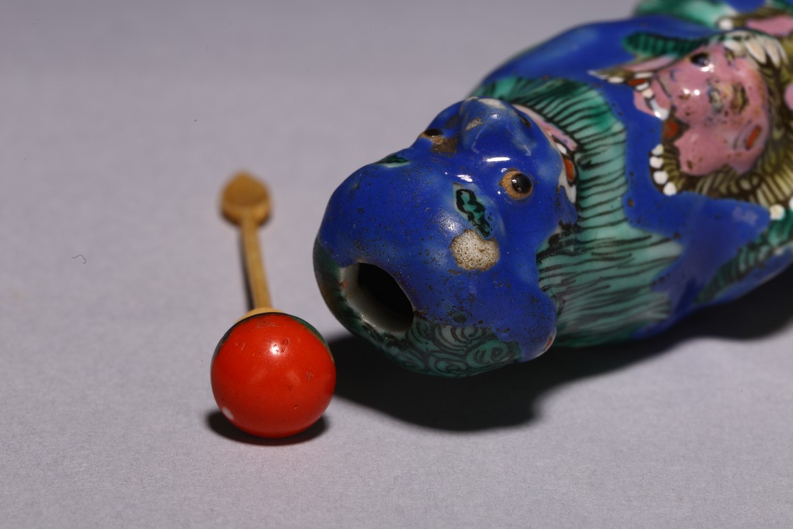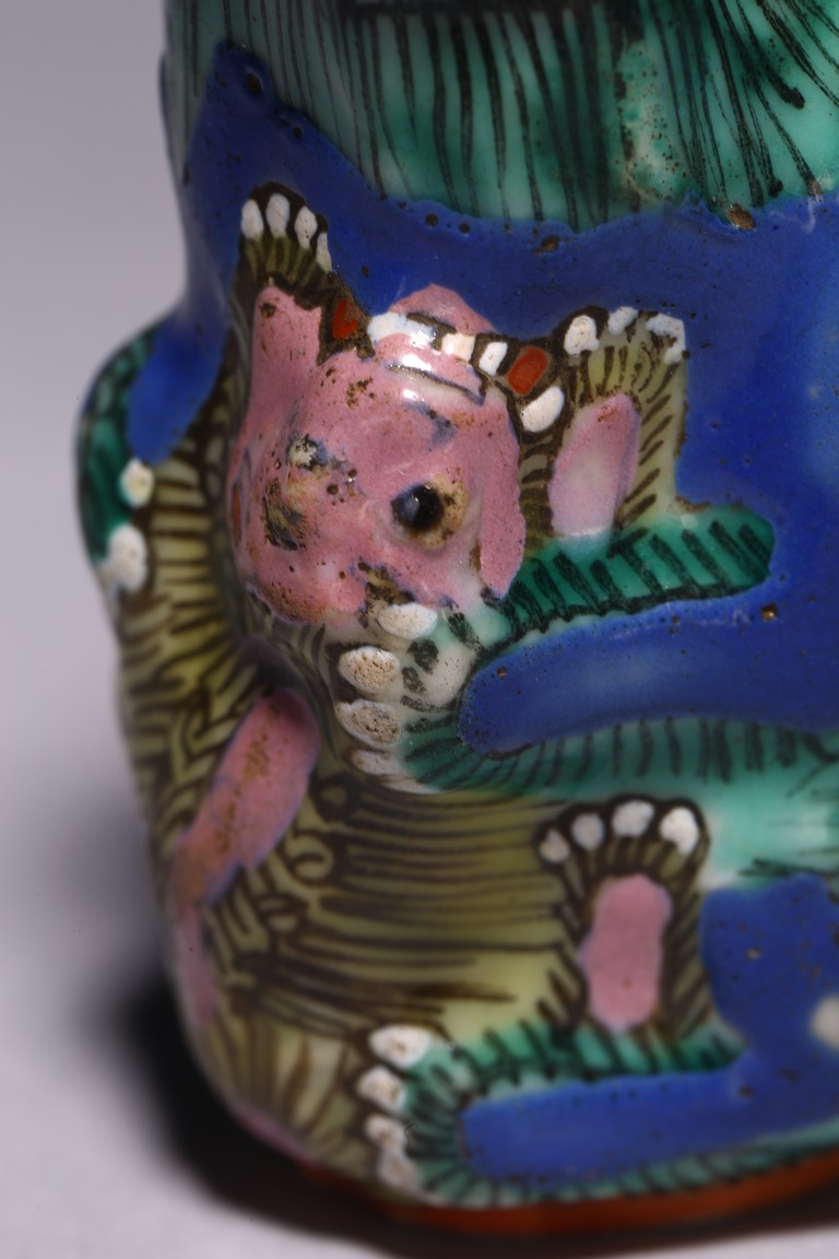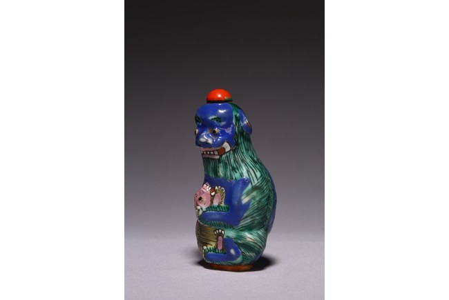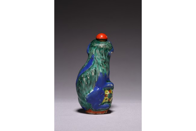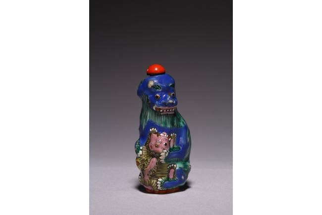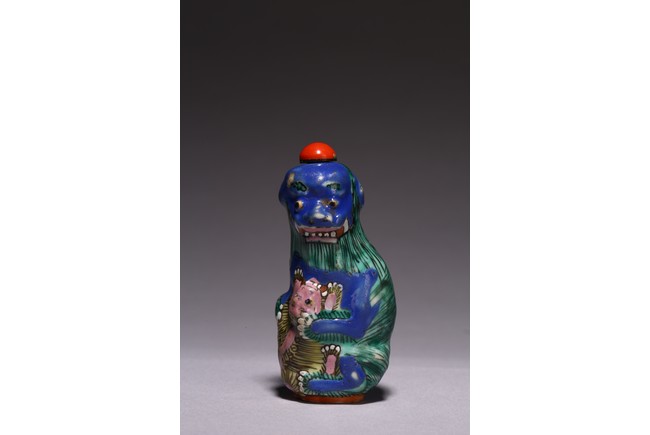 Qing Dynasty period. Modelled in the form of a larger buddhist lions hugging the lion cub, with coral stopper.