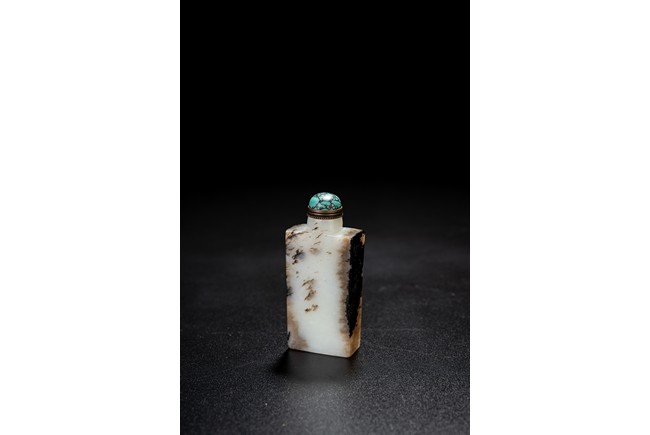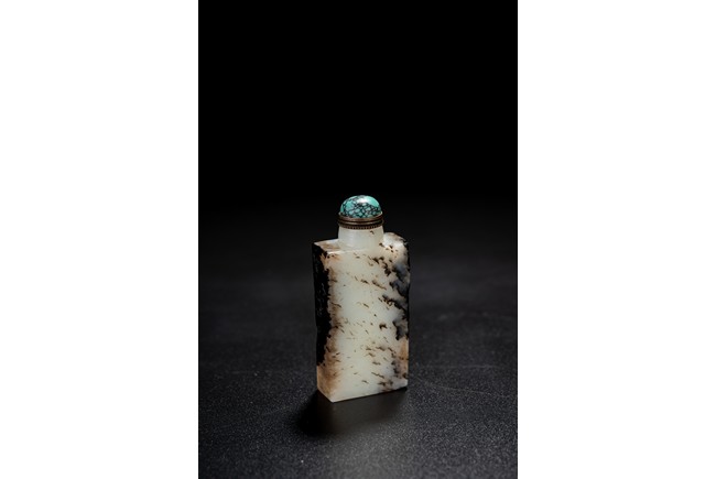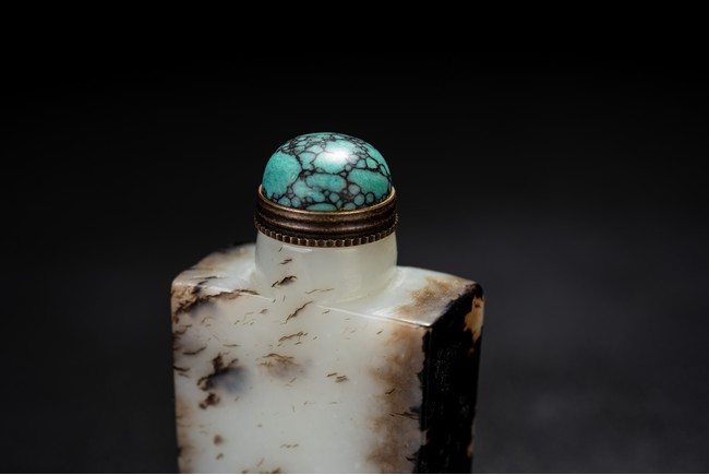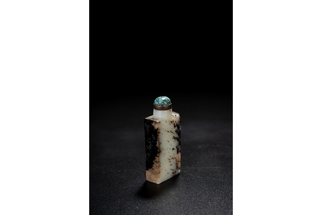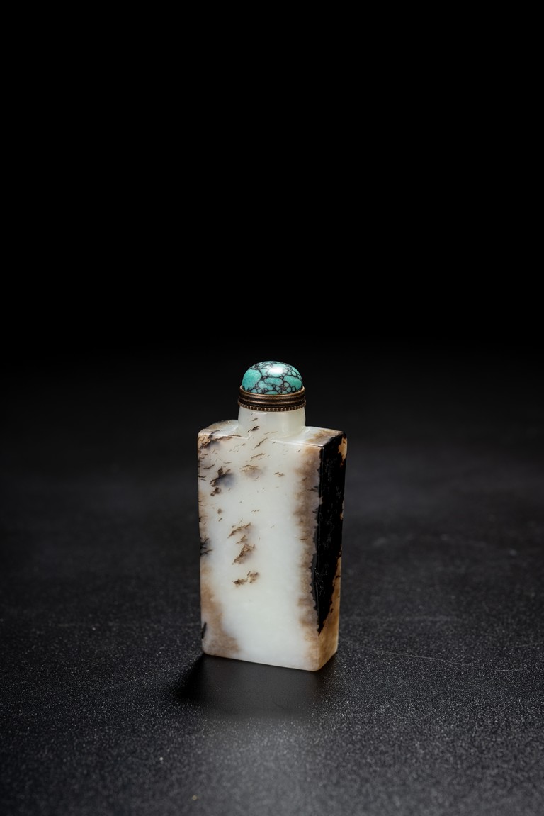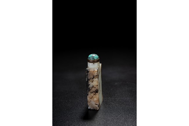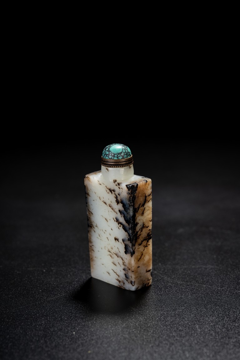 此鼻煙壺長方型,手感瑩潤,色澤均凈,配以松石做蓋鈕。內里掏膛均勻,表面光素無紋,未琢一飾,線條流暢,簡約高雅,氣息華貴。古人雲“好玉不琢”,只有玉質均一無雜的上好玉料方可以素面彰顯玉質之佳。