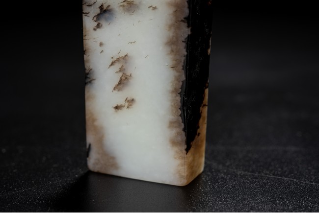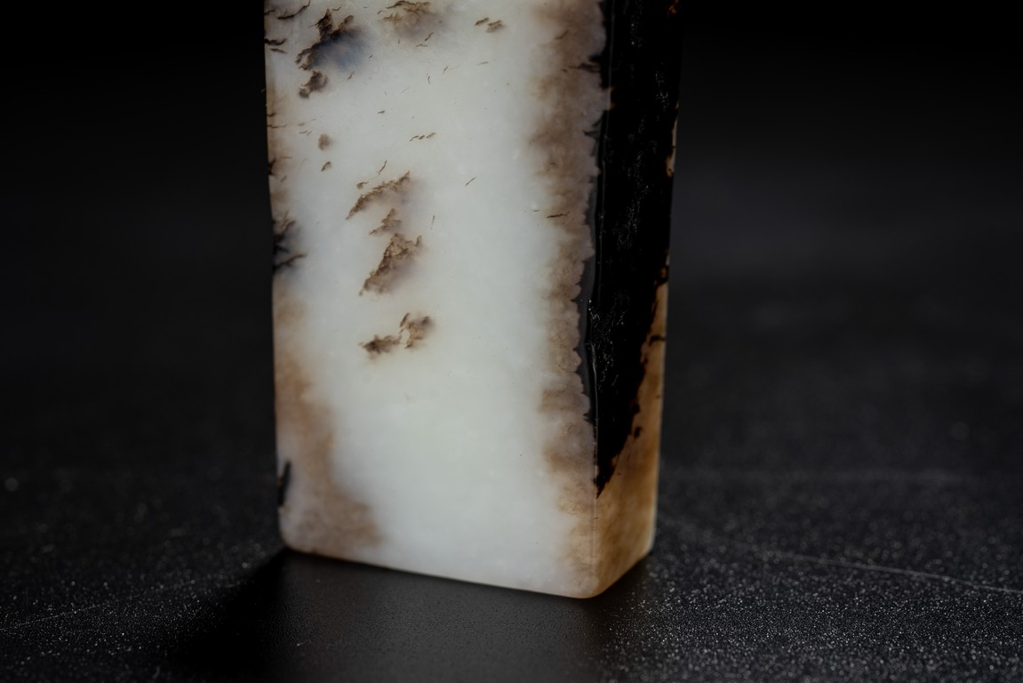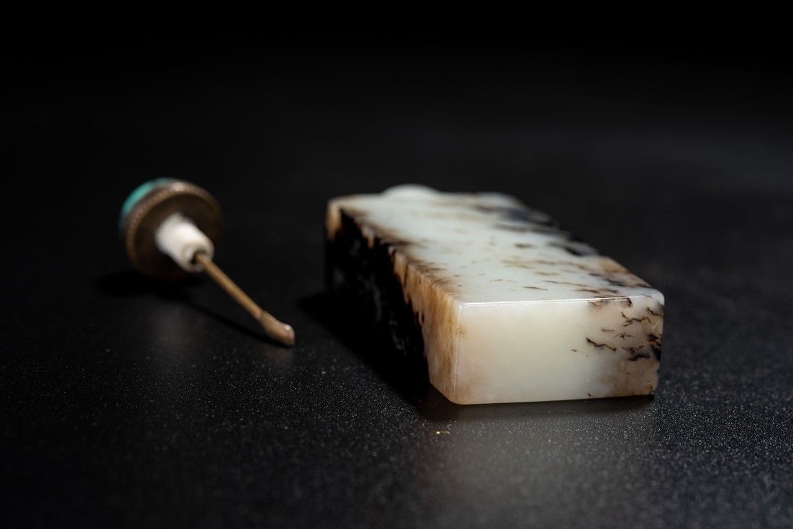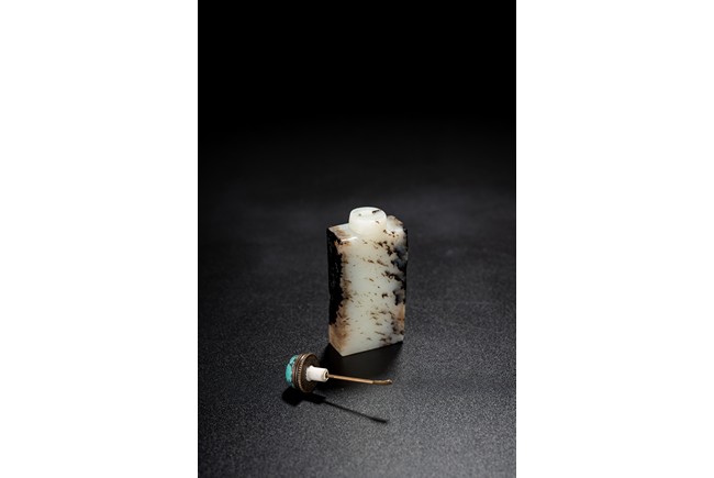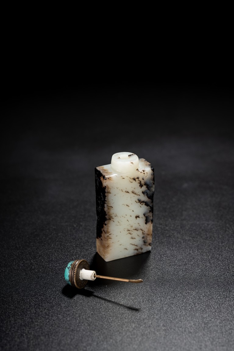 此鼻煙壺長方型,手感瑩潤,色澤均凈,配以松石做蓋鈕。內里掏膛均勻,表面光素無紋,未琢一飾,線條流暢,簡約高雅,氣息華貴。古人雲“好玉不琢”,只有玉質均一無雜的上好玉料方可以素面彰顯玉質之佳。
