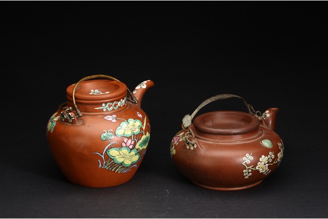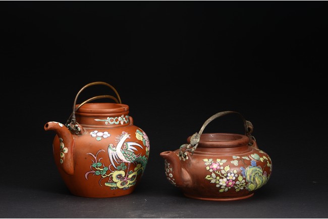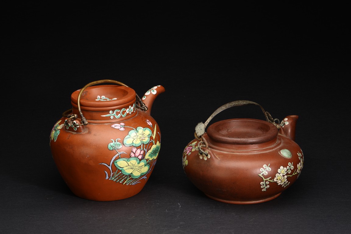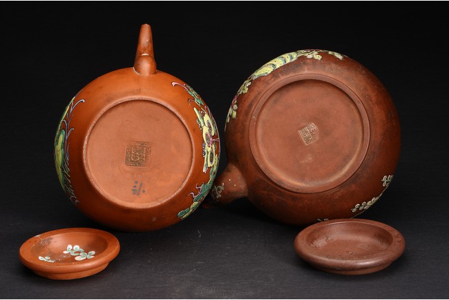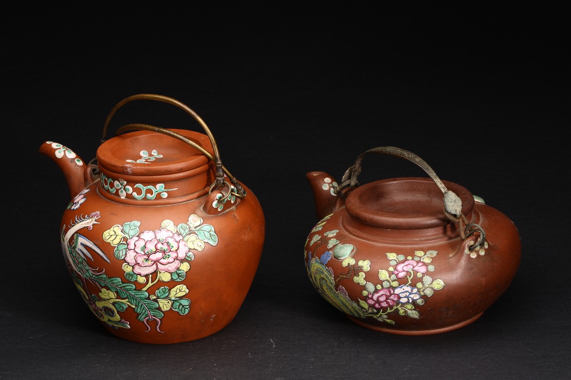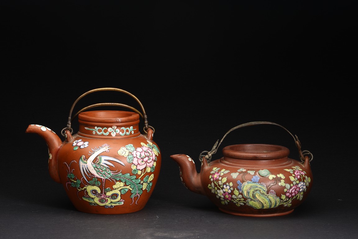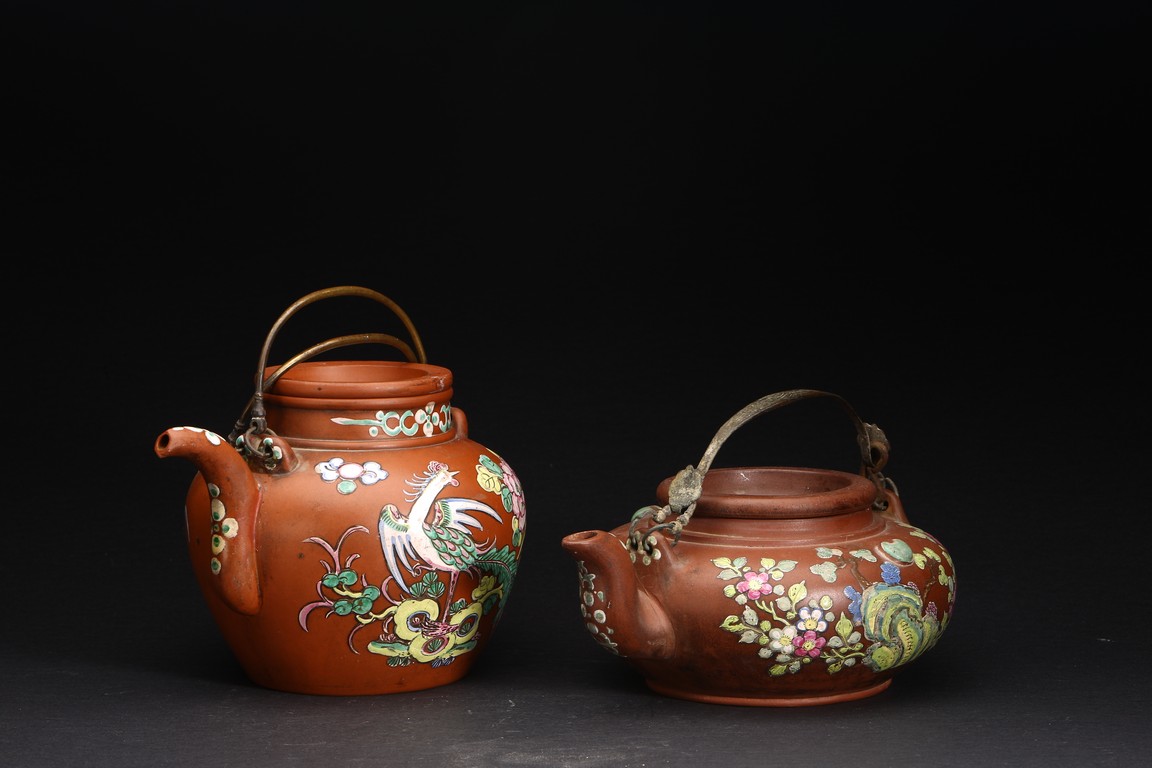 Qing Dynasty period. Consisting of two painted Yixing teapots of different sizes, one painted with phoenix, the other with flowers and rocks, base with marks.