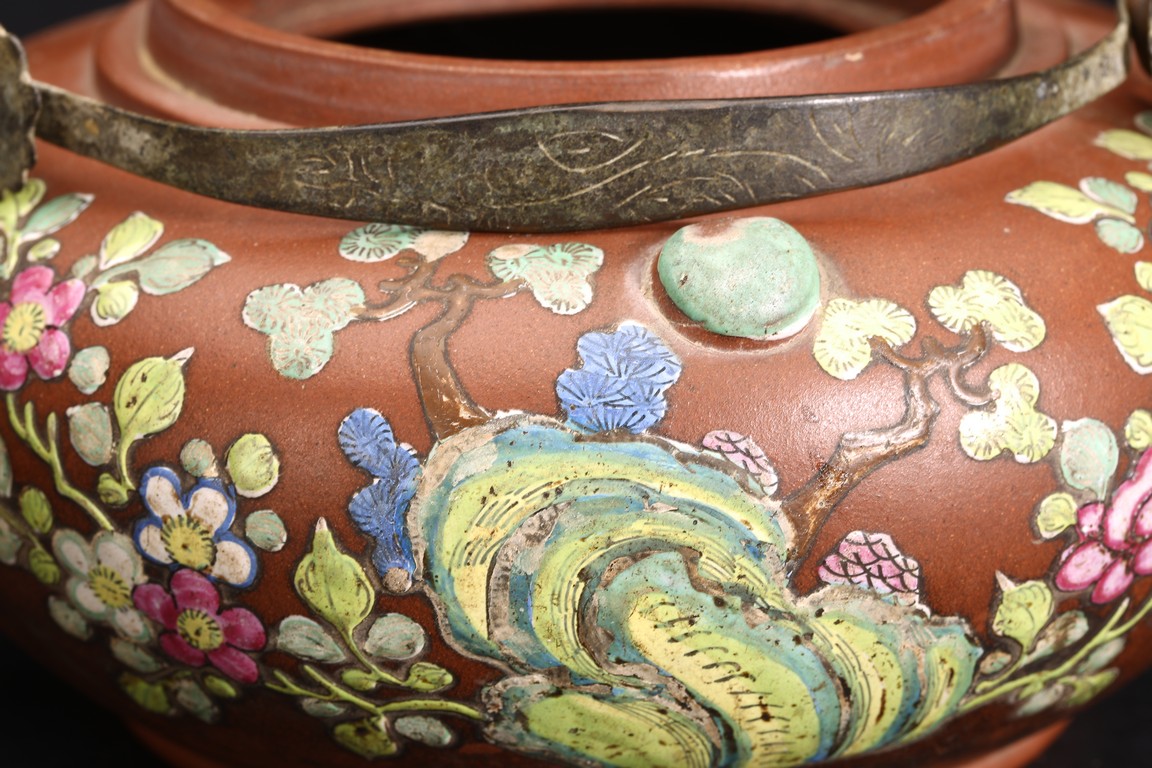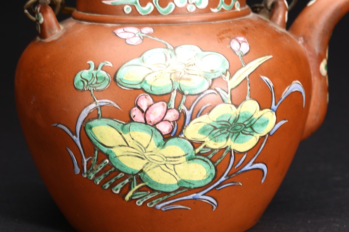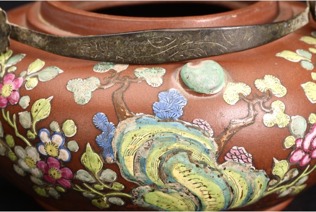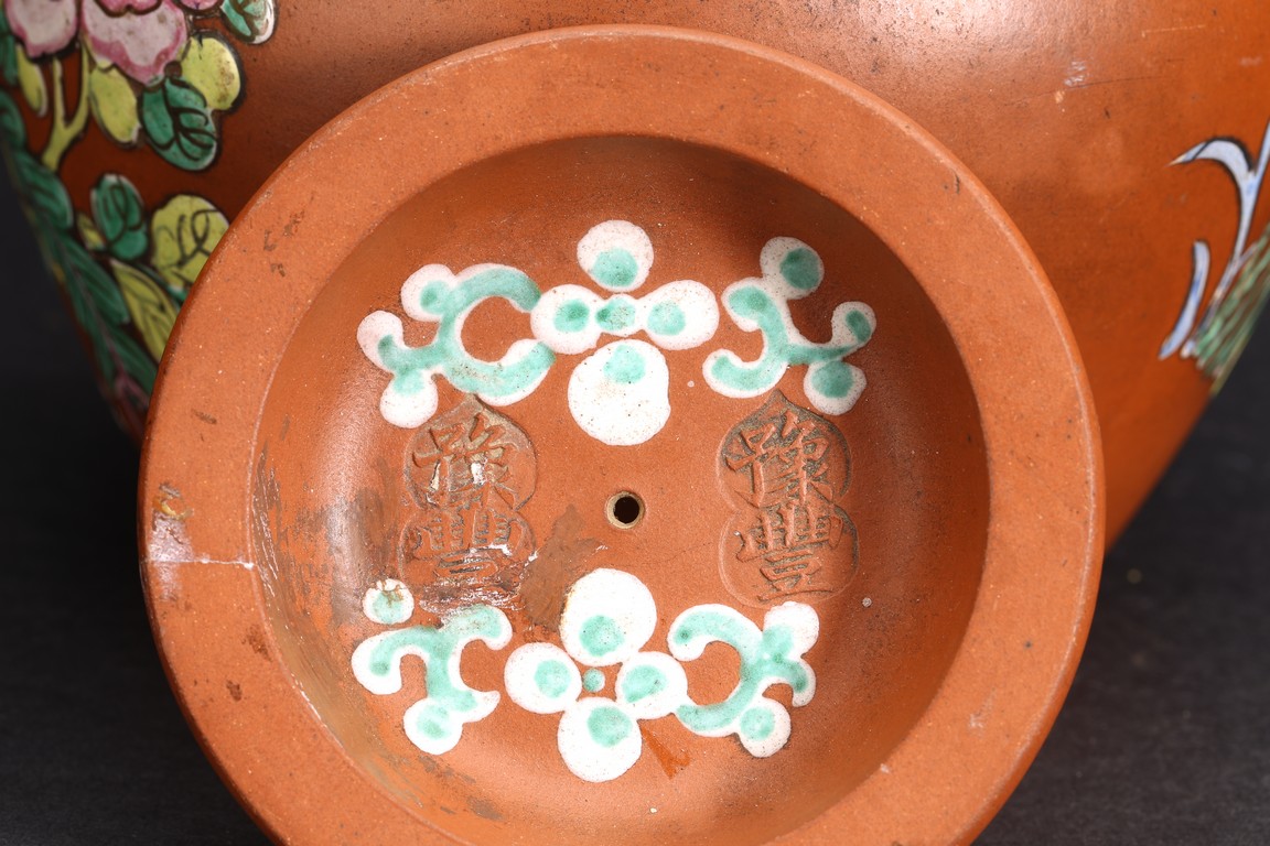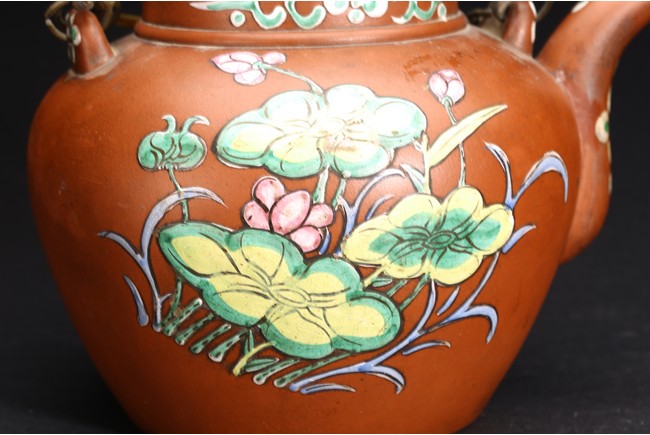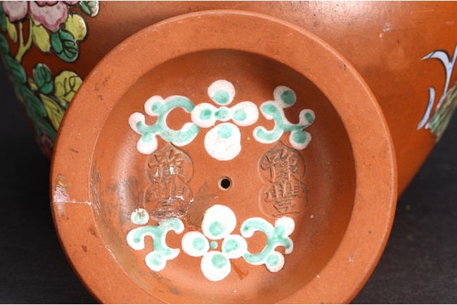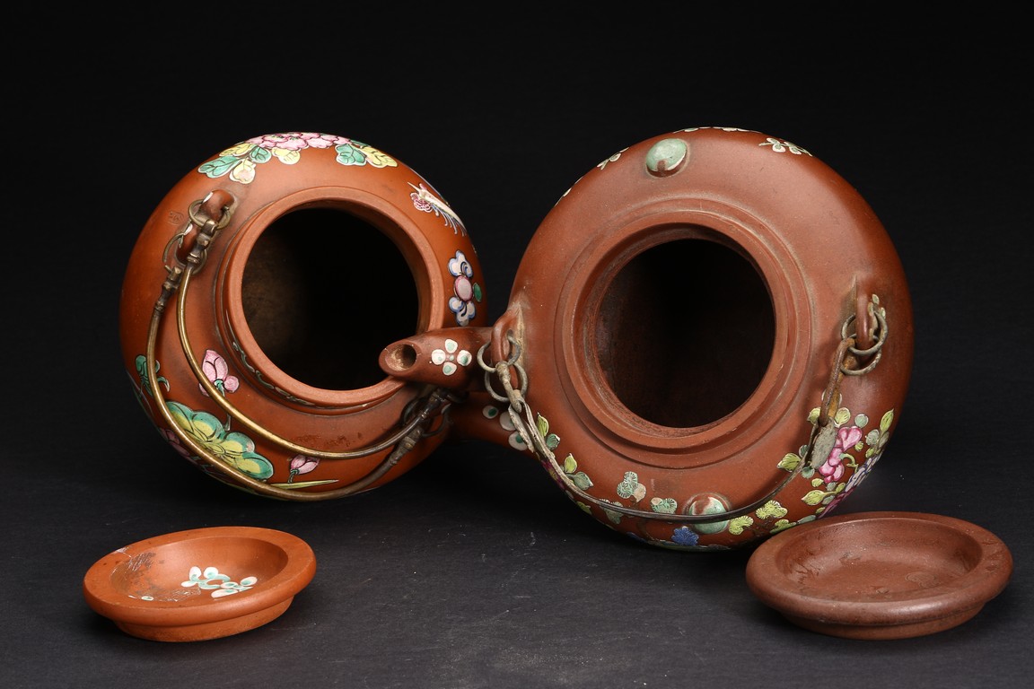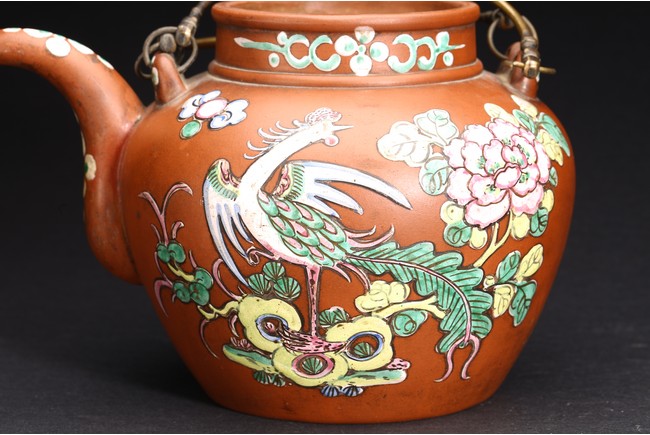 Qing Dynasty period. Consisting of two painted Yixing teapots of different sizes, one painted with phoenix, the other with flowers and rocks, base with marks.